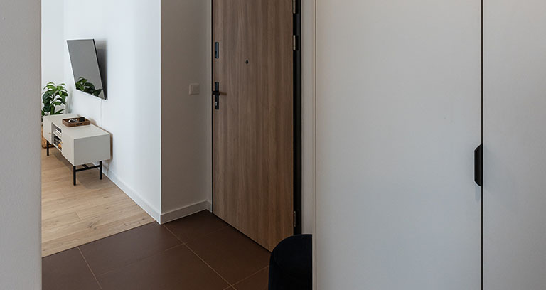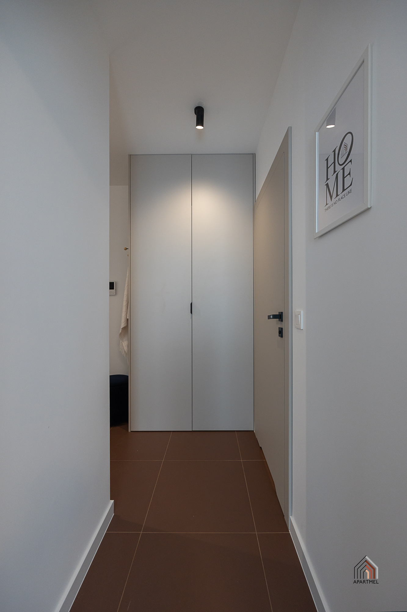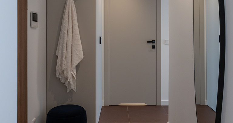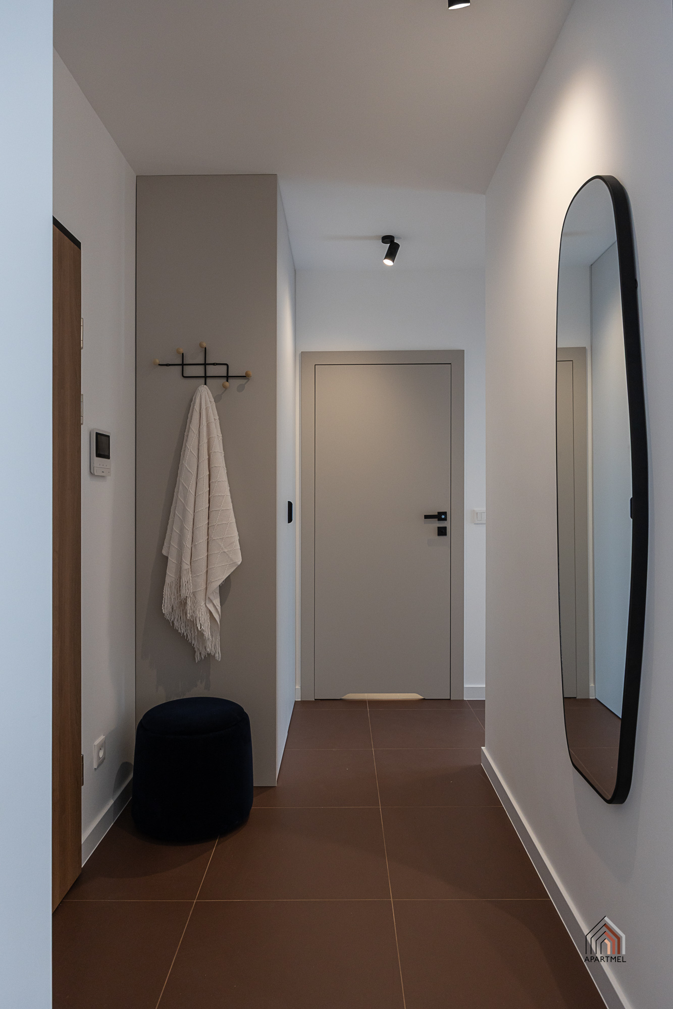 Elegancka strefa wejściowa posiada dużą, zabudowaną szafą ubraniową z wieszakami oraz szafkę gospodarczą z odkurzaczem, rozkładaną suszarką, deską do prasowania, żelazkiem oraz mopem. Dodatkowo ławeczka, podręczny wieszak na ubrania oraz duże lustro.