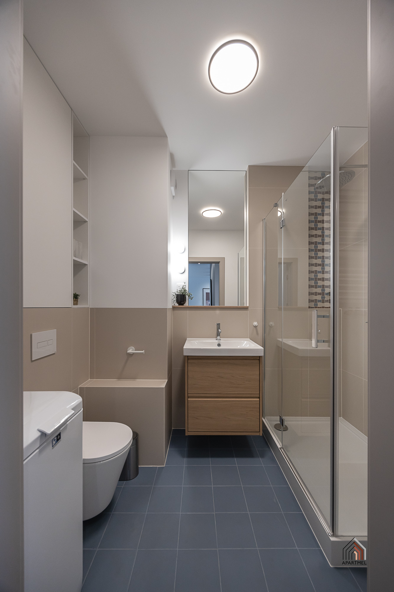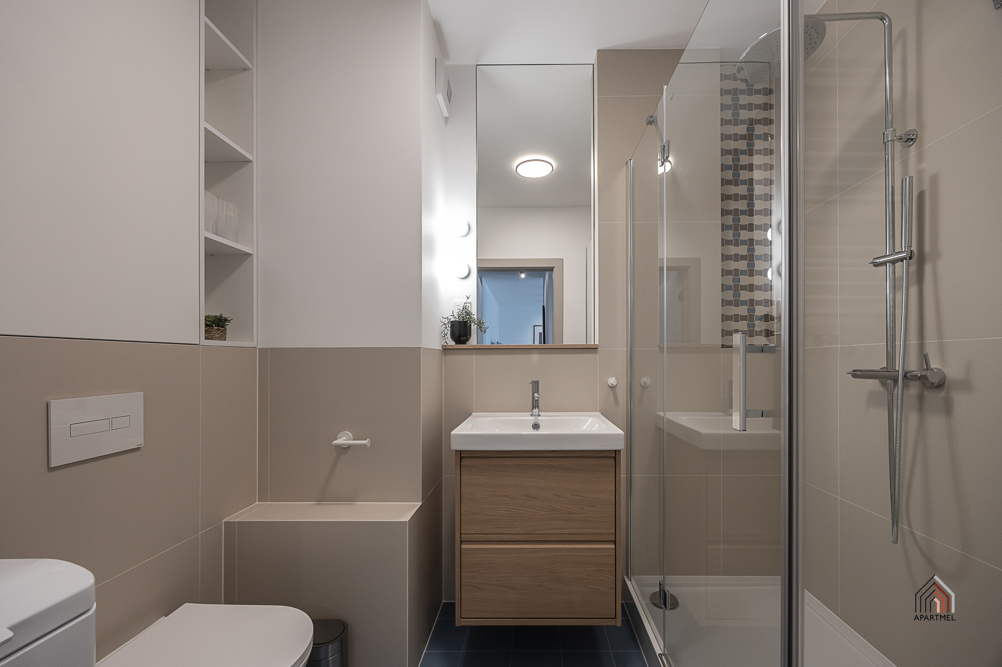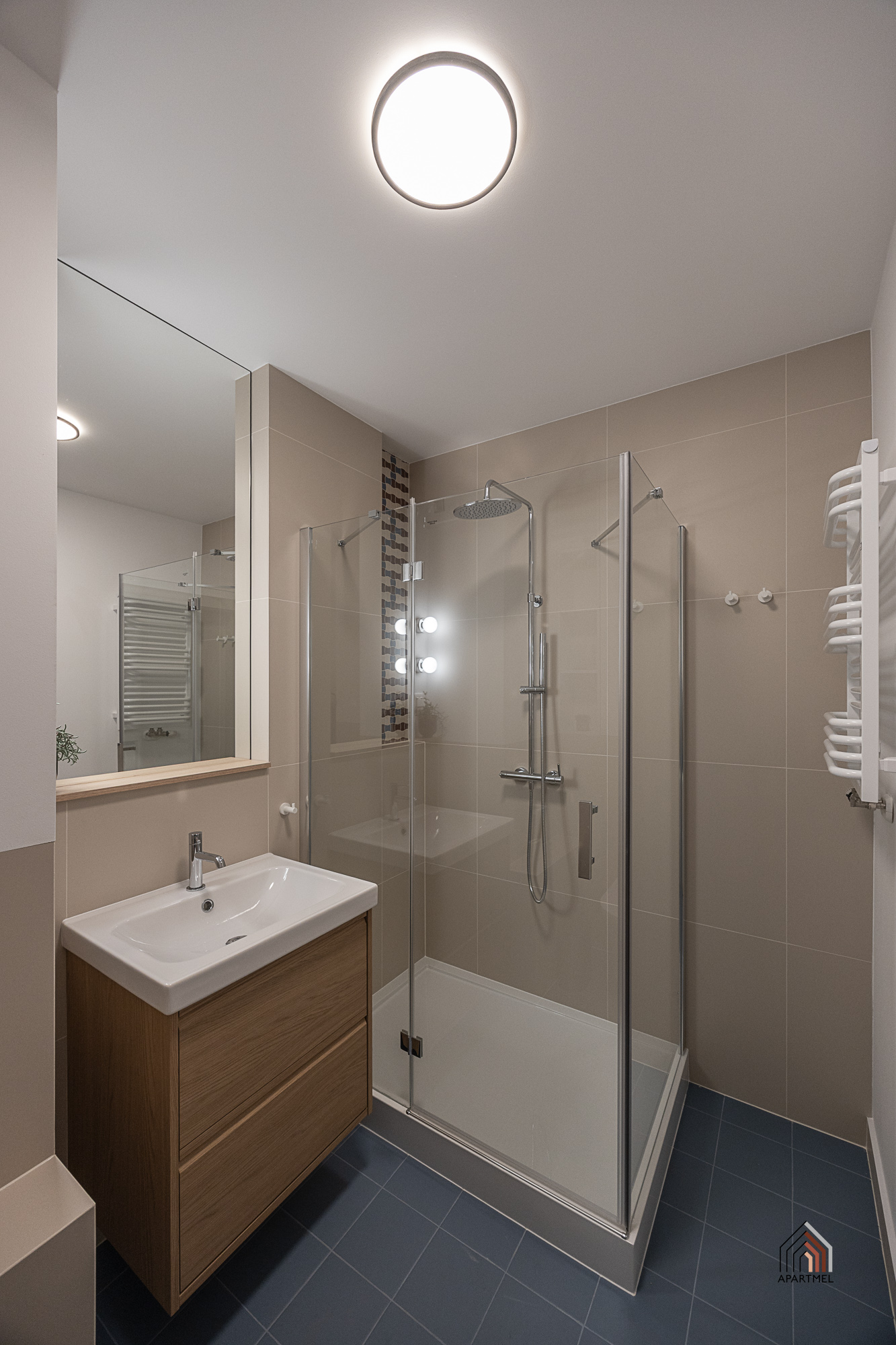 Jasna łazienka wykończona jest w stylu nowoczesnym z czarnymi dodatkami, które nadają charakteru całemu pomieszczeniu. Na wyposażeniu jest prysznic z deszczownicą oraz półką na kosmetyki, umywalka na szafce z dwiema szufladami, pralkę Electrolux, miskę ustępową wiszącą z baterią bidetową w jej sąsiedztwie, bardzo duże lustro oraz kinkiety, a także wieszaki na ręczniki, uchwyt na papier toaletowy, szczotkę do wc i kosz na śmieci.