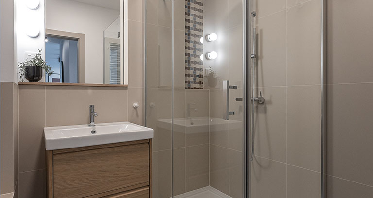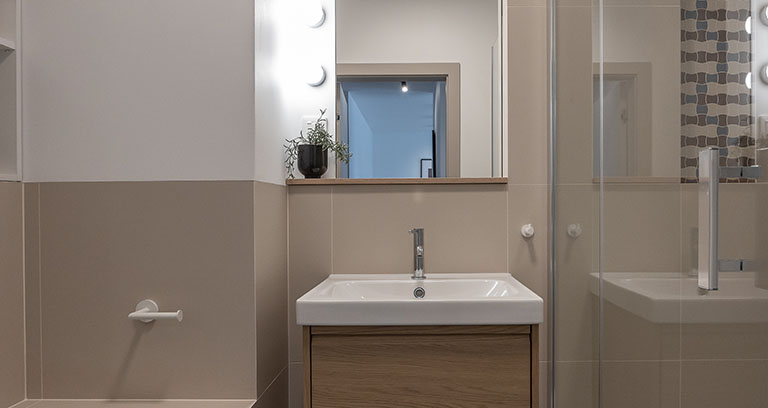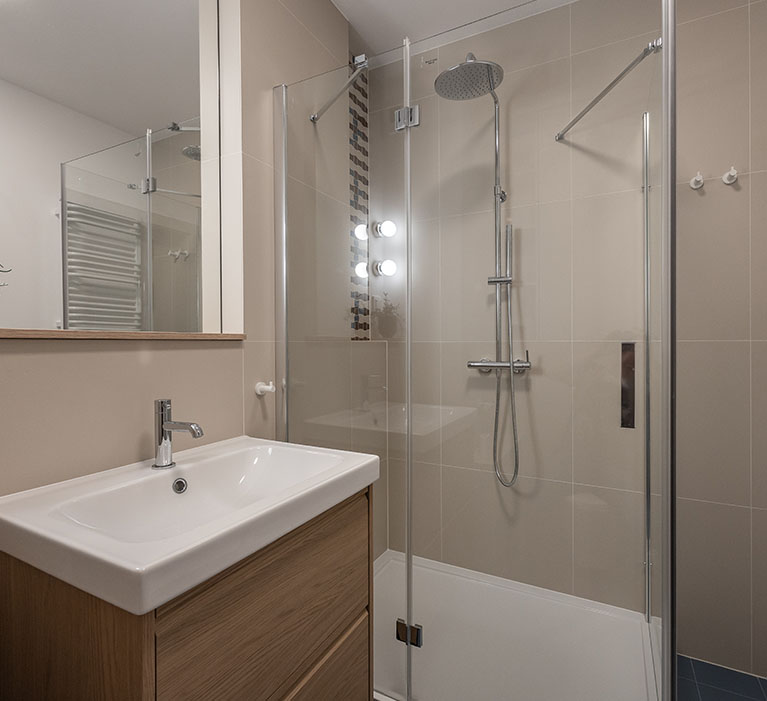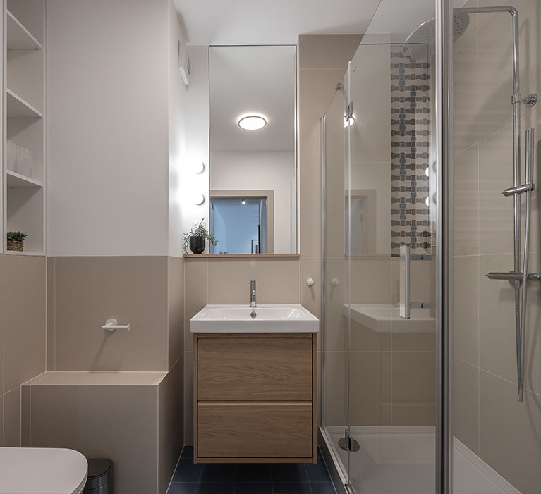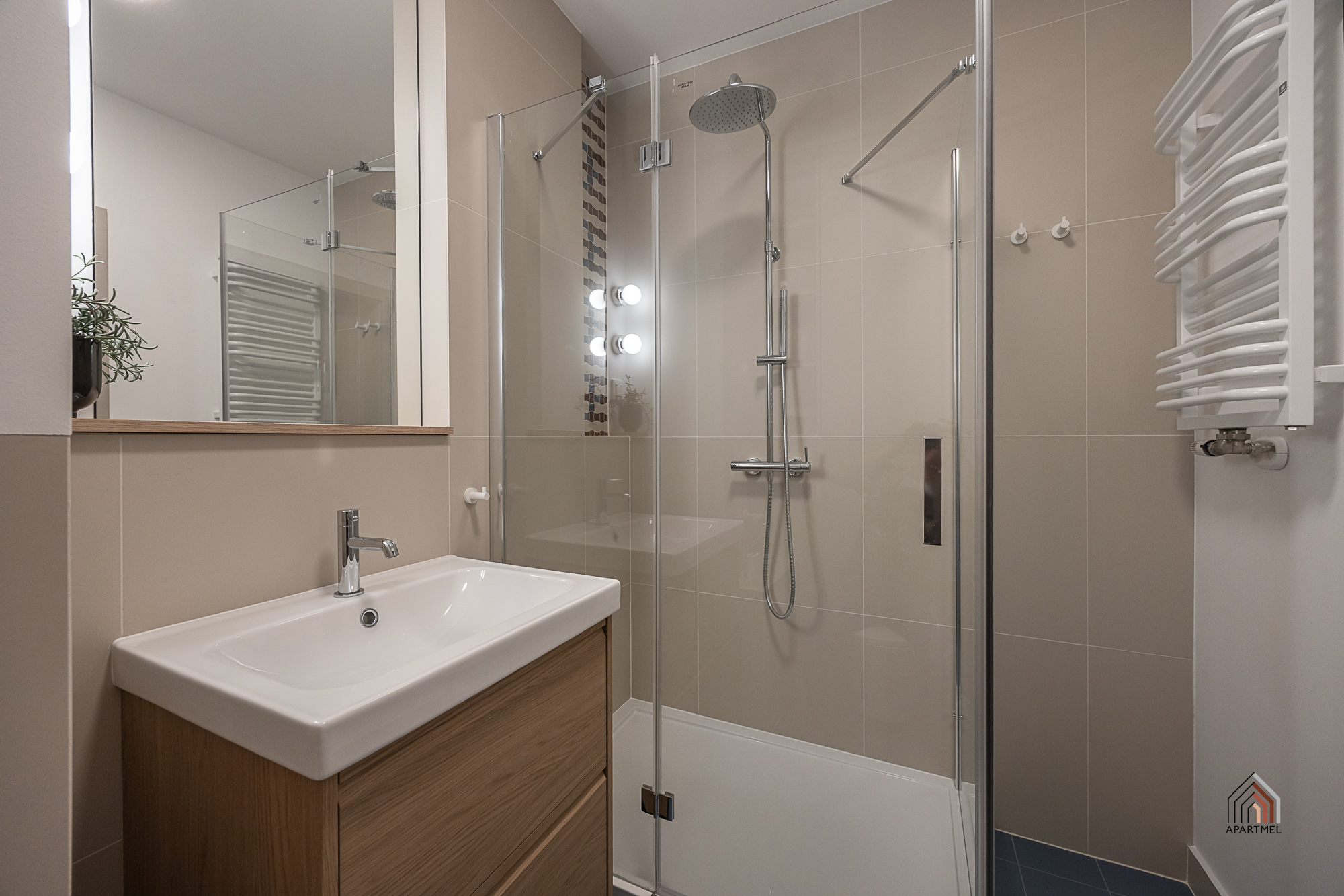 Jasna łazienka wykończona jest w stylu nowoczesnym z czarnymi dodatkami, które nadają charakteru całemu pomieszczeniu. Na wyposażeniu jest prysznic z deszczownicą oraz półką na kosmetyki, umywalka na szafce z dwiema szufladami, pralkę Electrolux, miskę ustępową wiszącą z baterią bidetową w jej sąsiedztwie, bardzo duże lustro oraz kinkiety, a także wieszaki na ręczniki, uchwyt na papier toaletowy, szczotkę do wc i kosz na śmieci.
