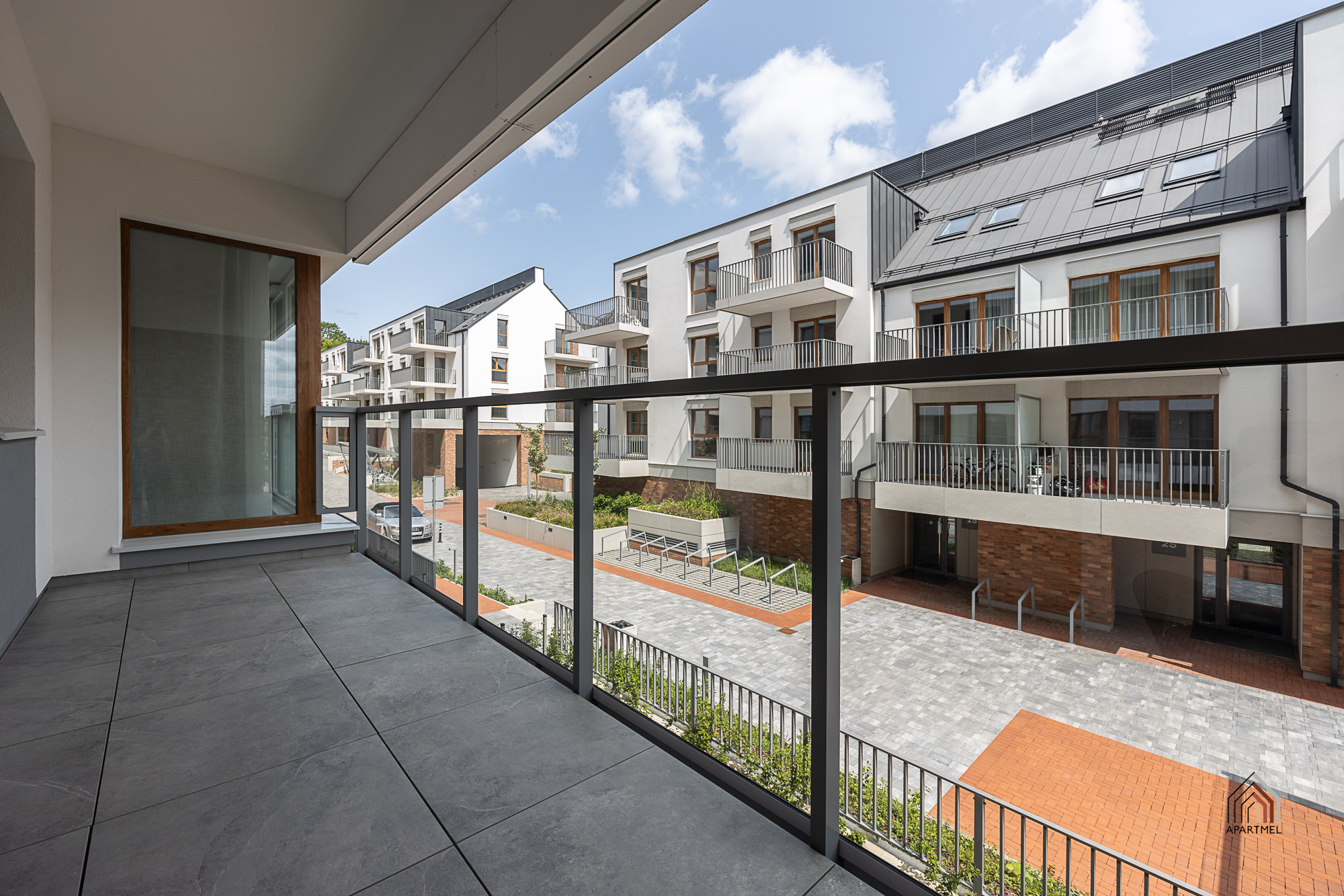 Na balkonie płytka gresowa, na ścianach tynk strukturalny, balustrada i szklana barierka.