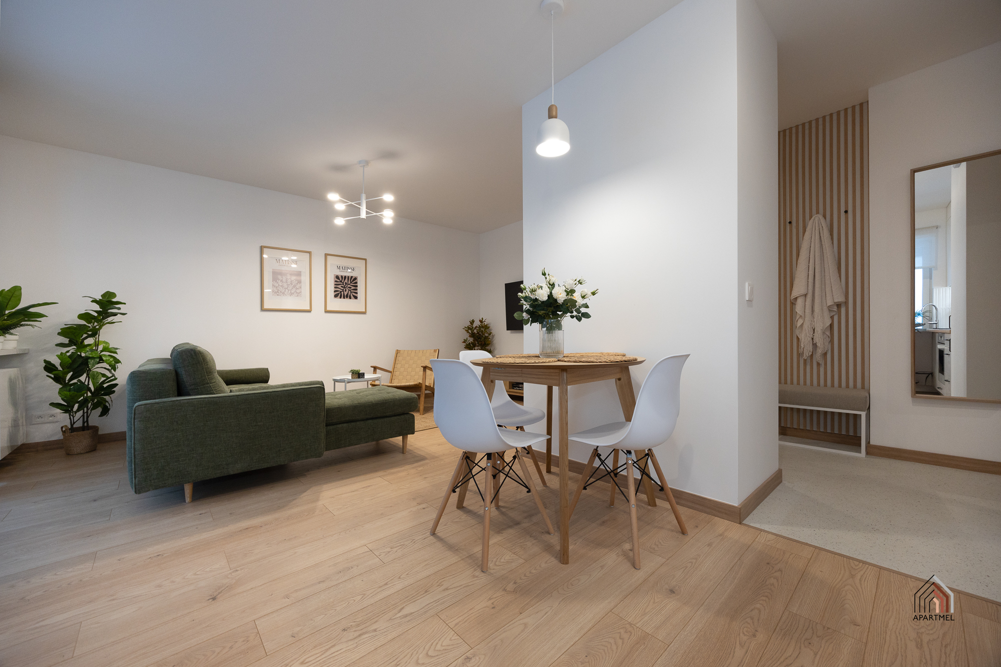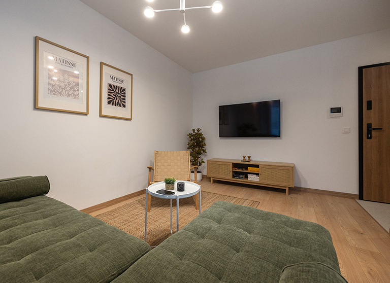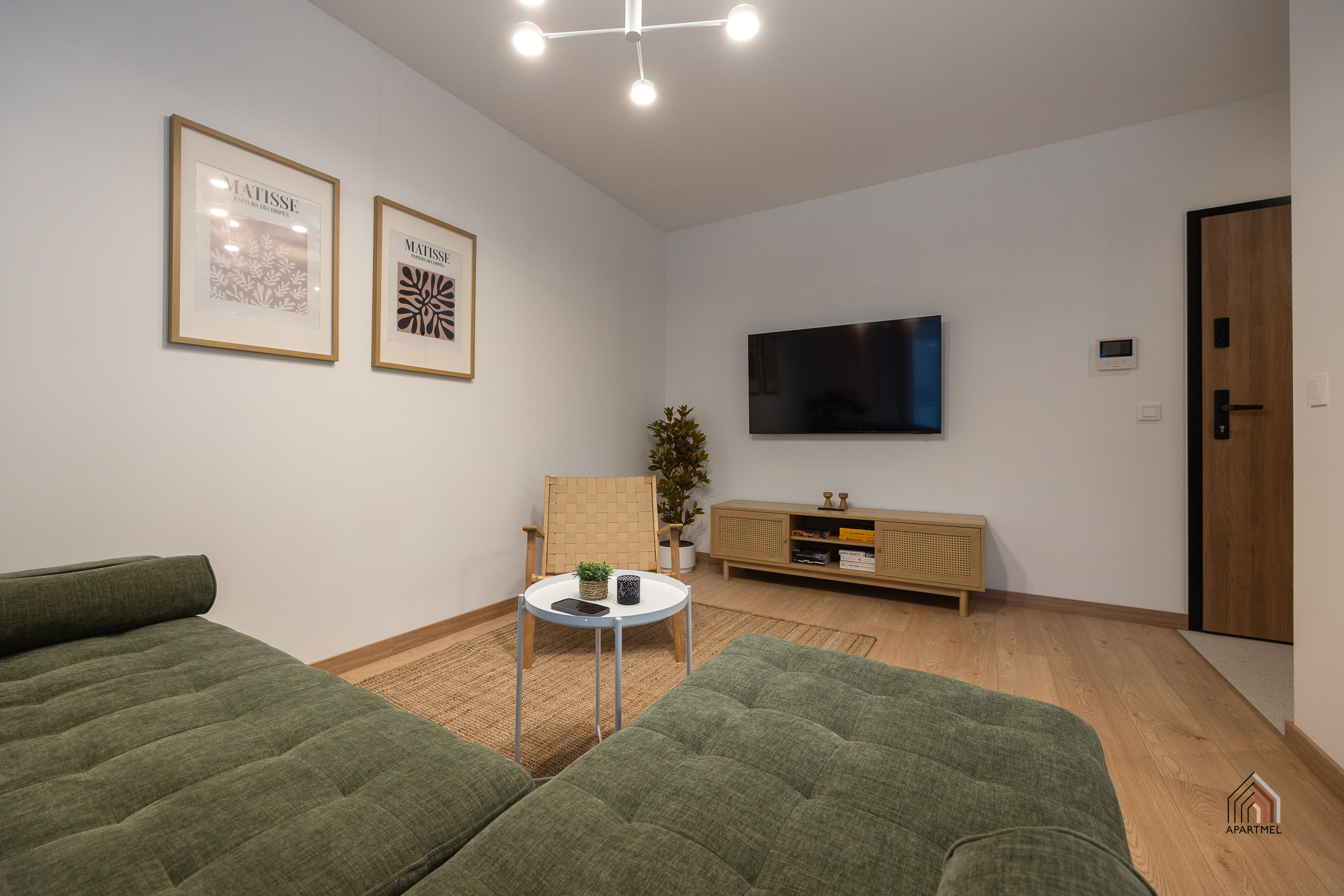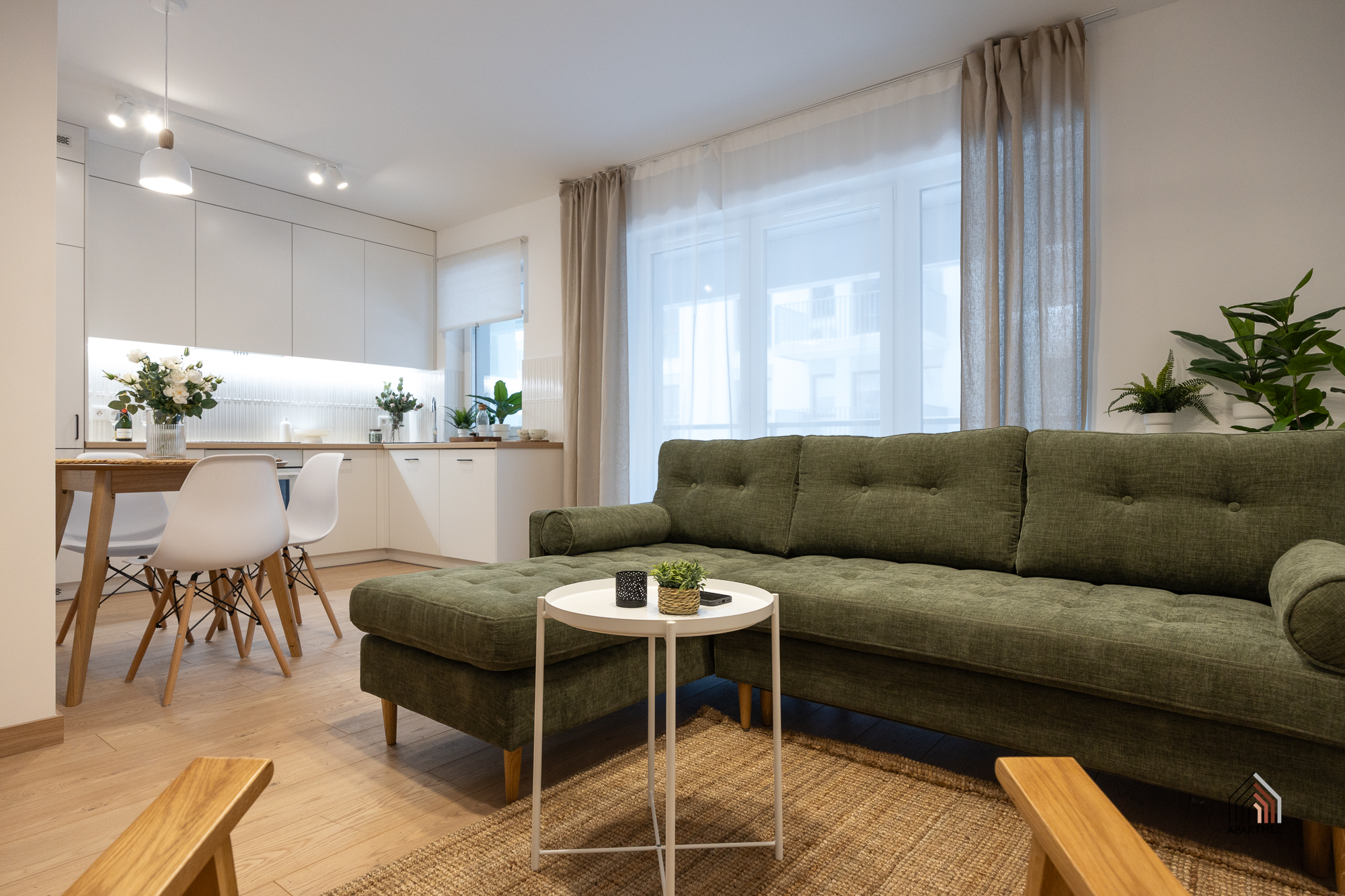 W salonie znajduje się rozkładana sofa narożna, stolik kawowy, szafka RTV i podwieszany telewizor 55" Samsung 4K Smart TV, stół i 3 krzesła oraz fotel. W dużych oknach balkonowych delikatne firanki i lekkie zasłony.