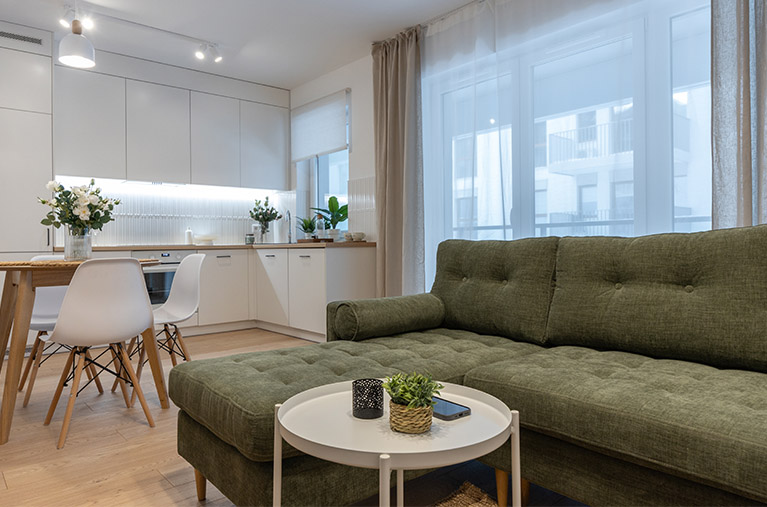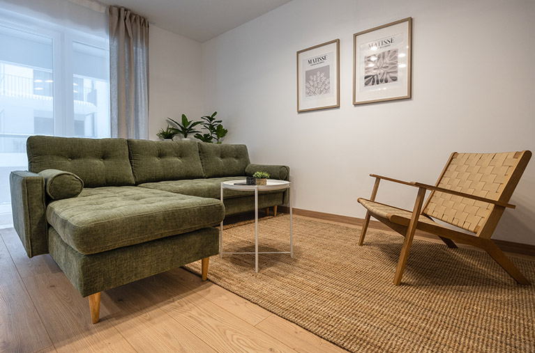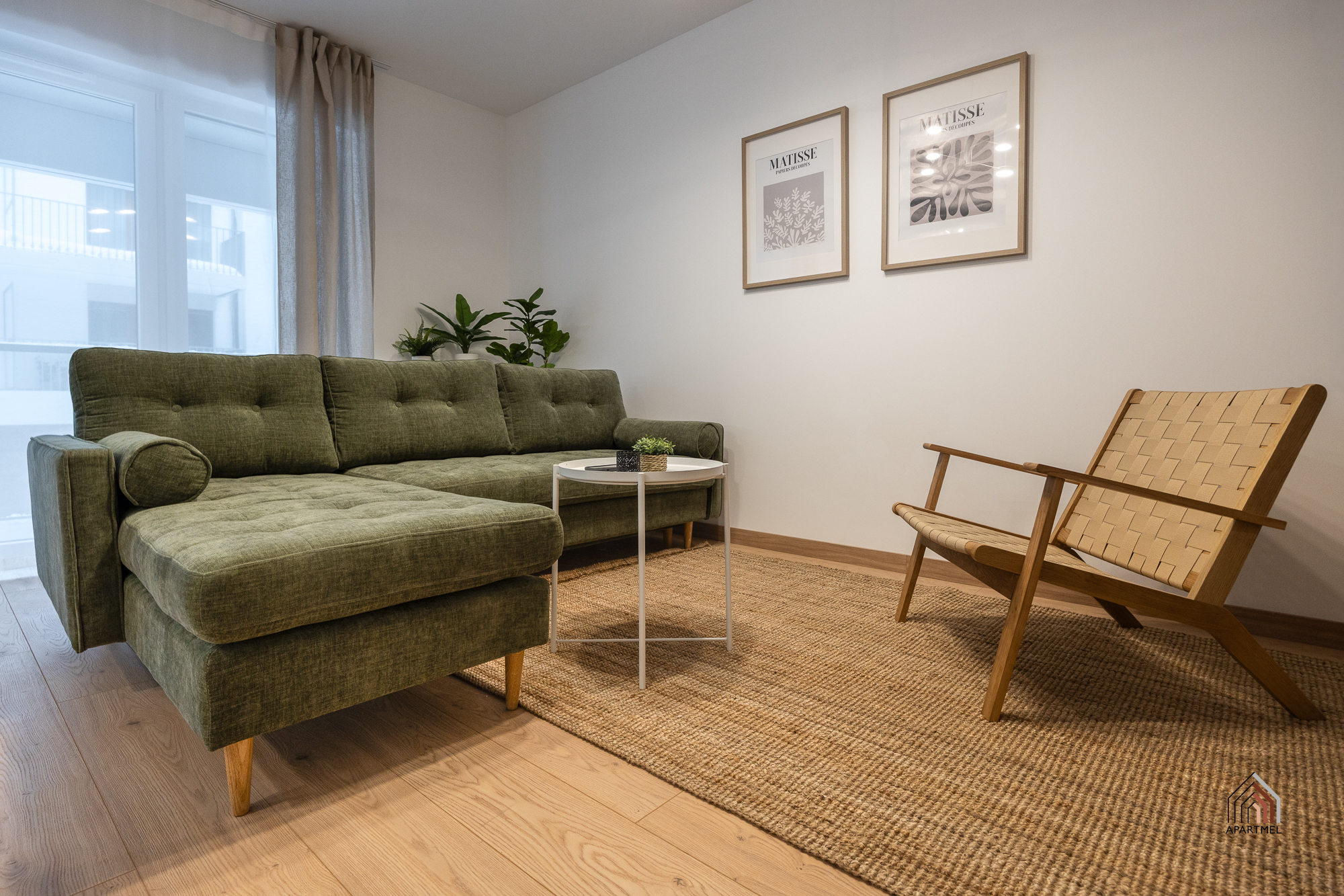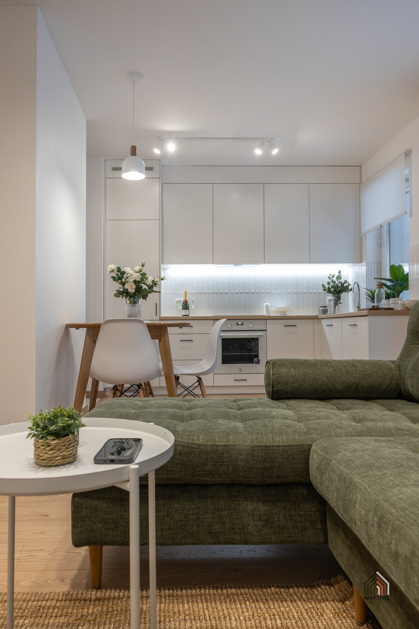 W salonie znajduje się rozkładana sofa narożna, stolik kawowy, szafka RTV i podwieszany telewizor 55" Samsung 4K Smart TV, stół i 3 krzesła oraz fotel. W dużych oknach balkonowych delikatne firanki i lekkie zasłony.