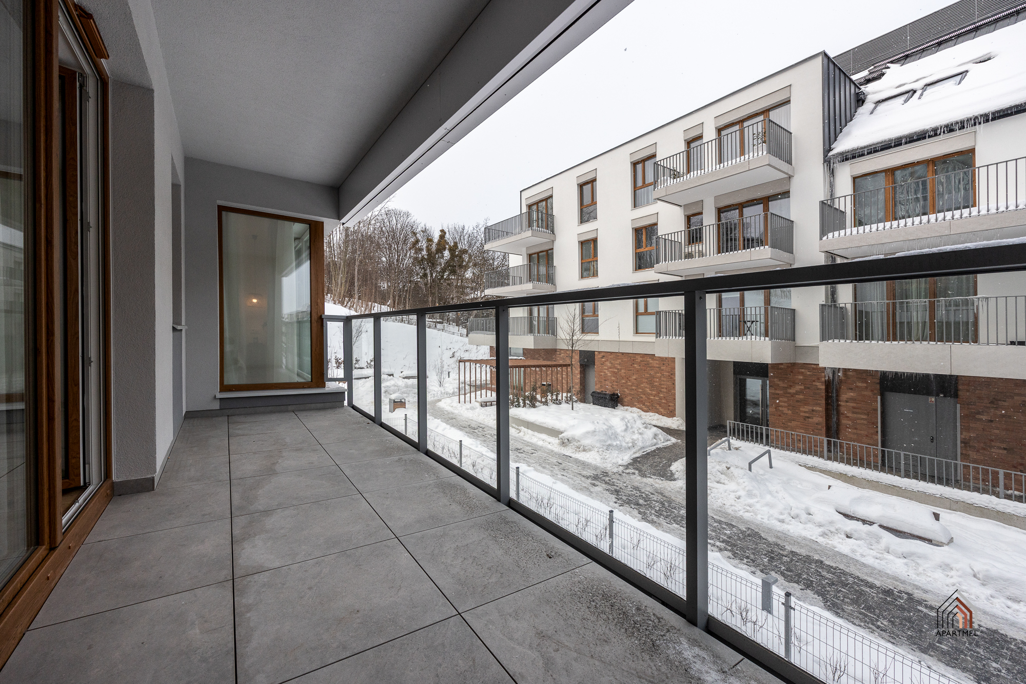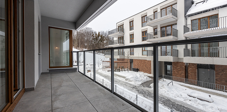 Na podłodze płytka gresowa, balkon oszklony, balustrada metalowa.