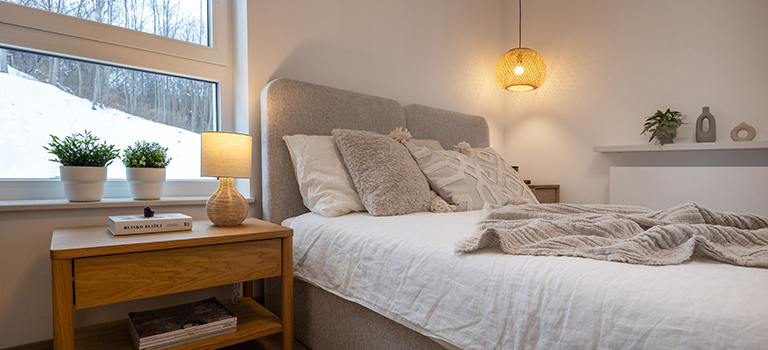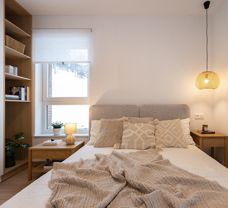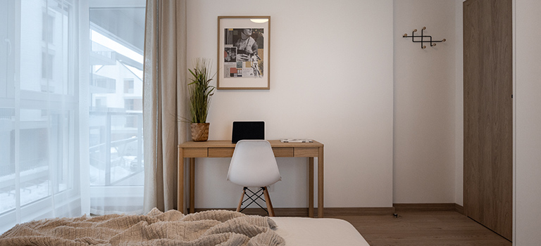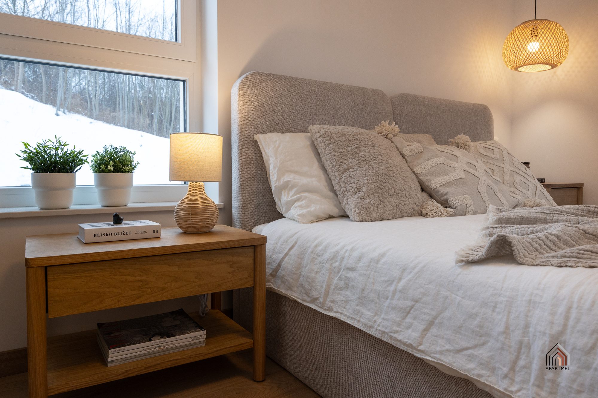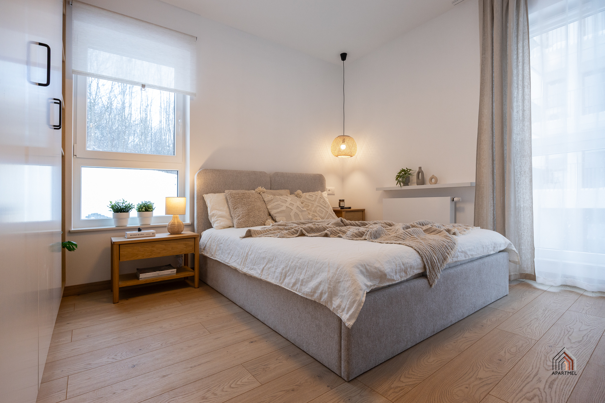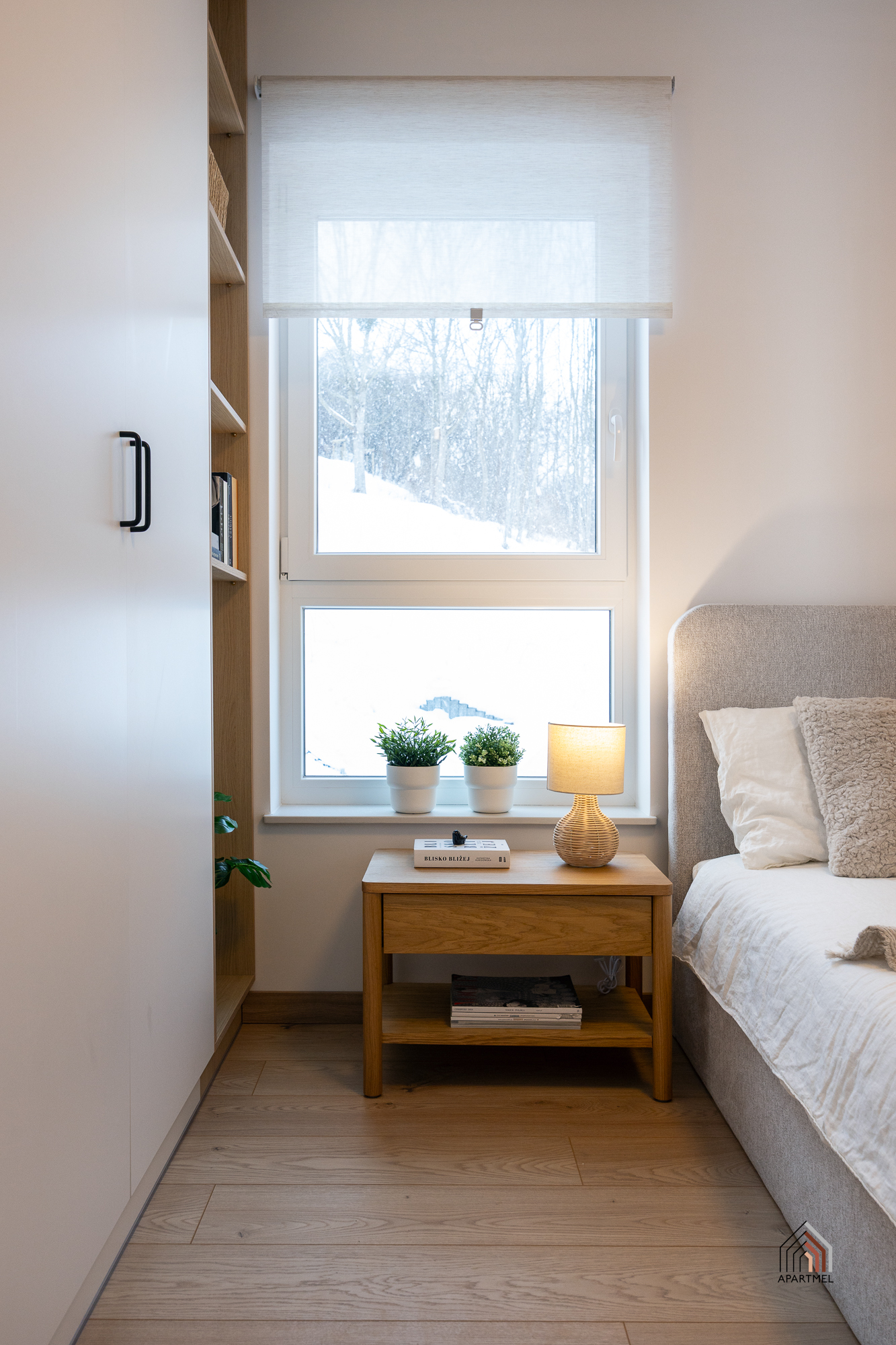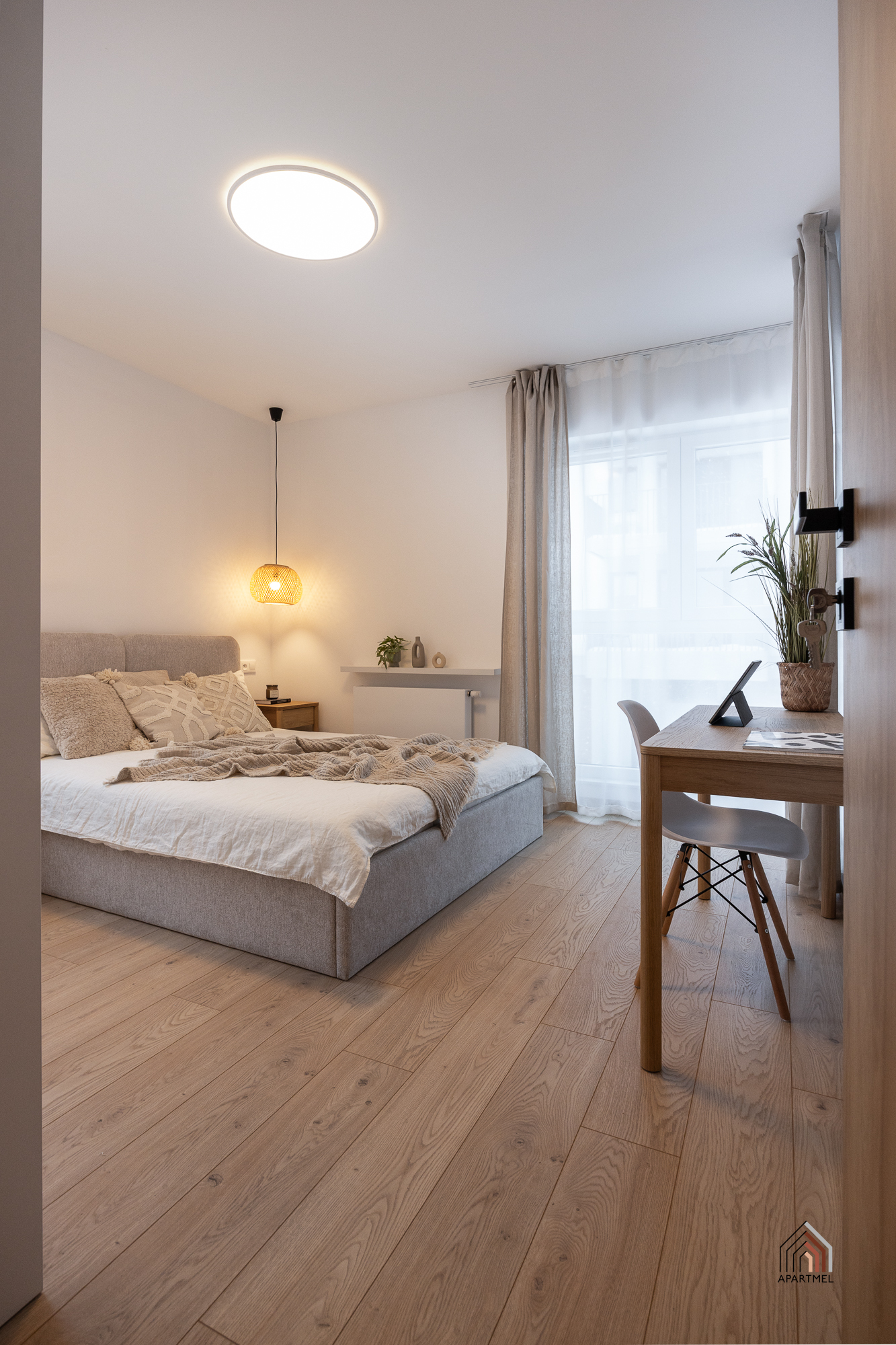 Sypialnia posiada wygodne łóżko z pojemnikiem na pościel, miękki, dekoracyjny zagłówek, pojemną szafę z regałem półkowym. Obok łóżka szafki nocne, lampki oraz gniazdka, w oknach firanki i zaciemniające zasłony, w drugim oknie roleta materiałowa. Duże biurko z krzesłem.