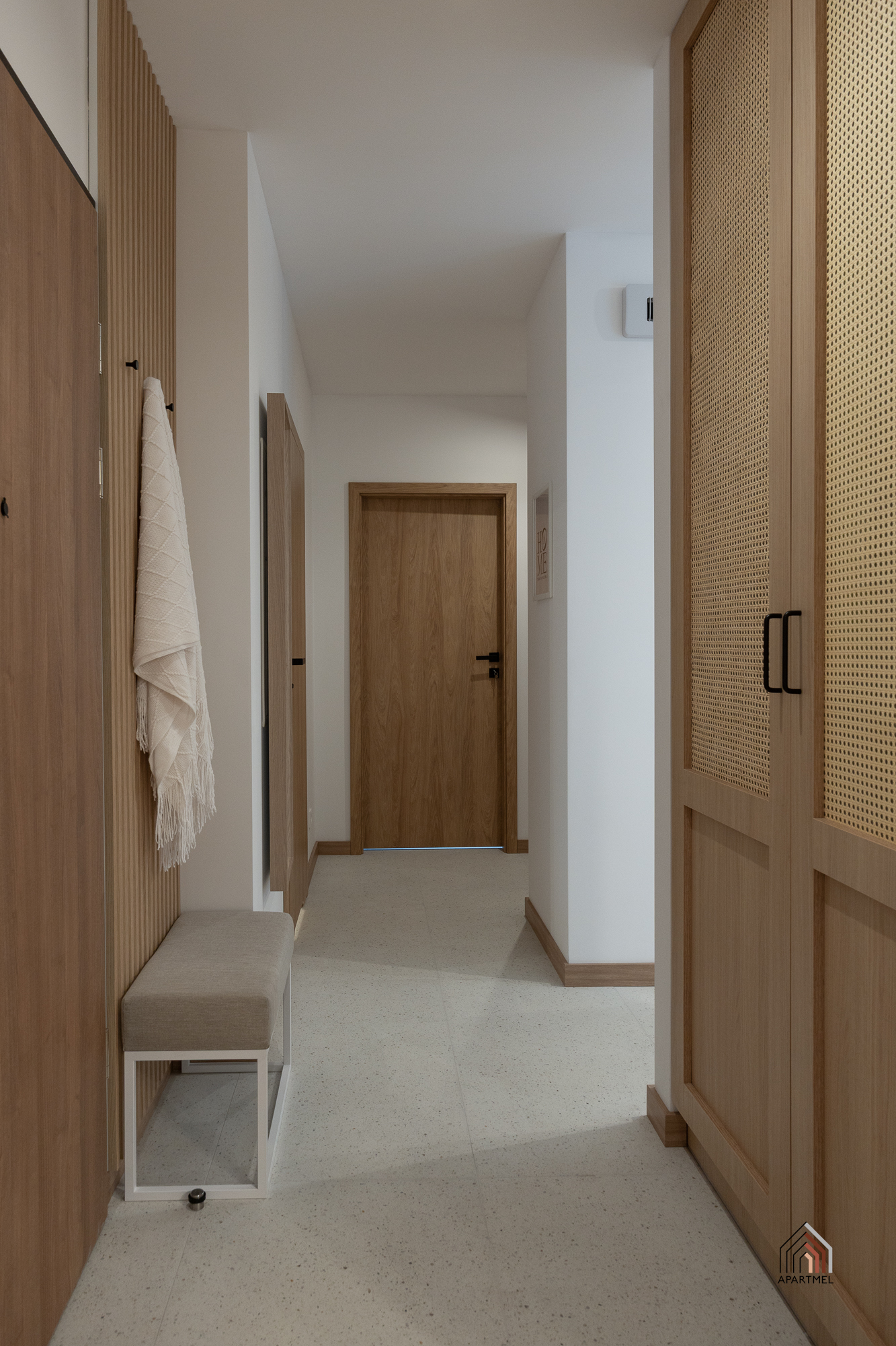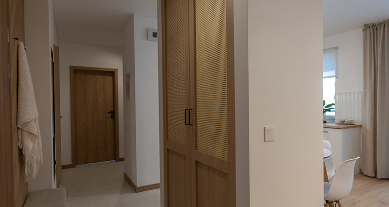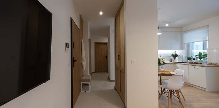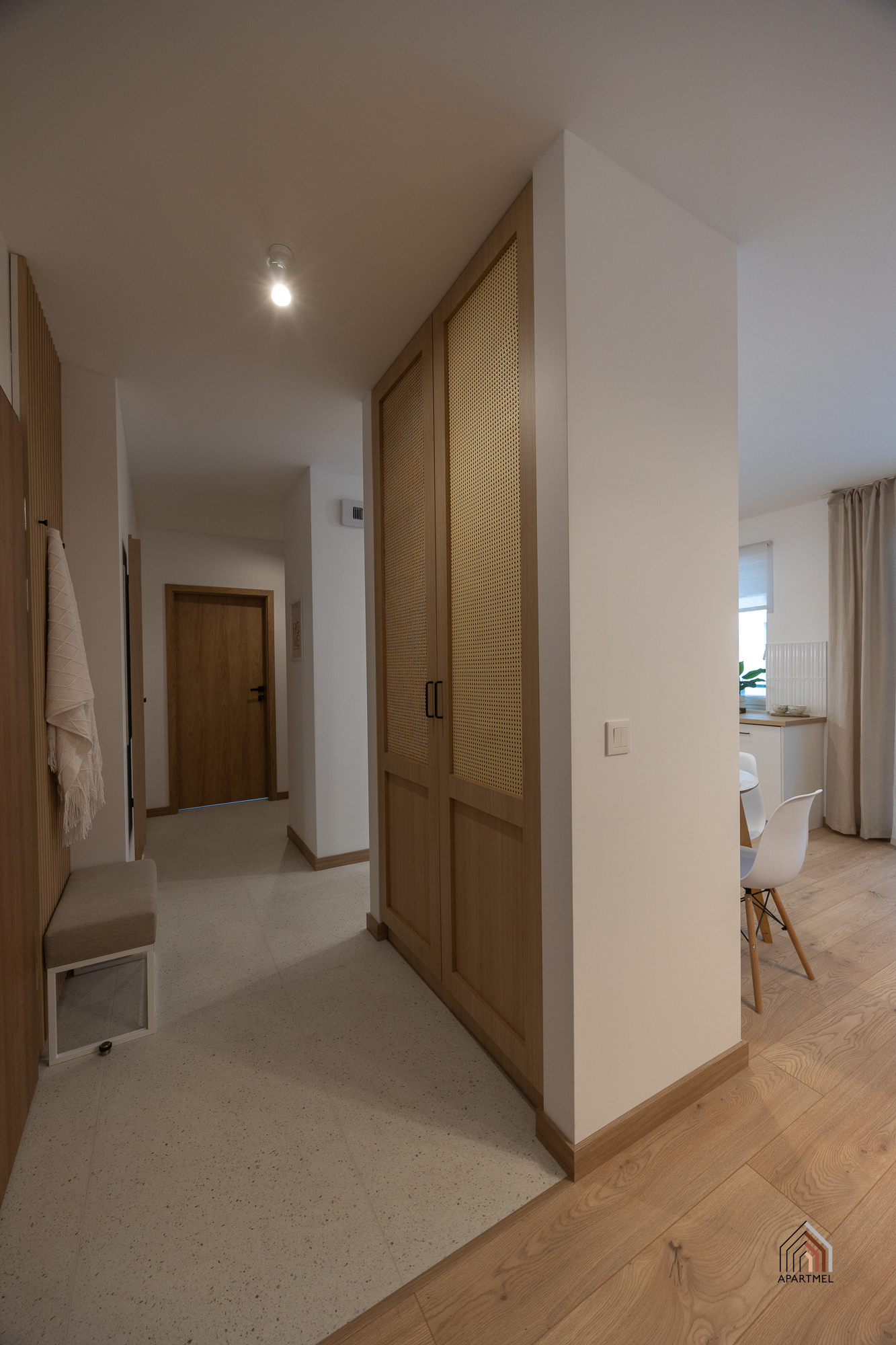 Strefa wejściowa z zabudowaną szafą ubraniową z wieszakami oraz gospodarczą wyposażona jest w odkurzacz, rozkładaną suszarkę, deskę do prasowania, żelazko oraz mop. Dodatkowo ławeczka, podręczny wieszak oraz duże lustro.