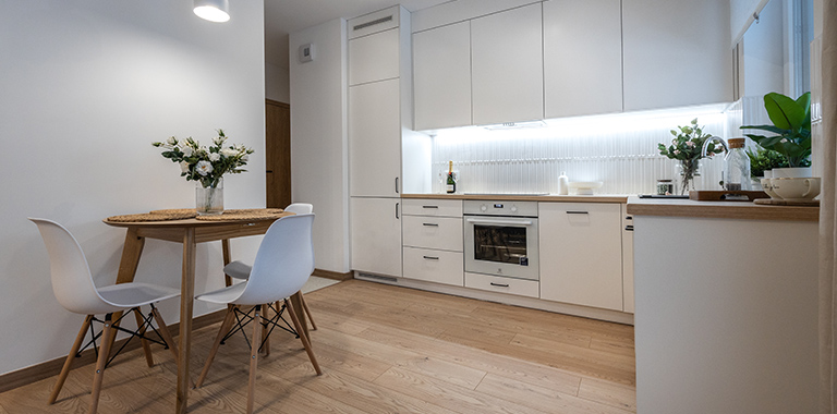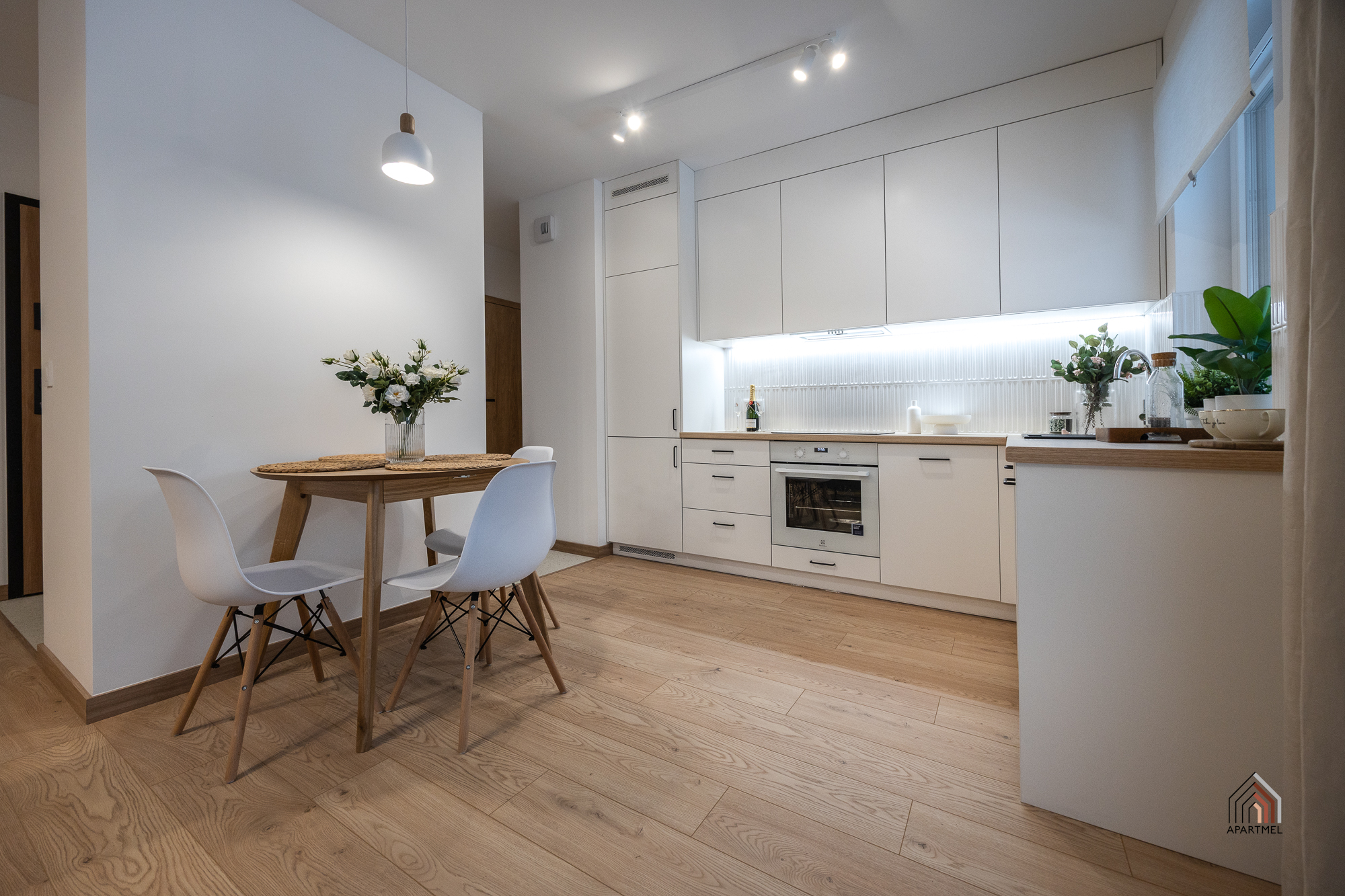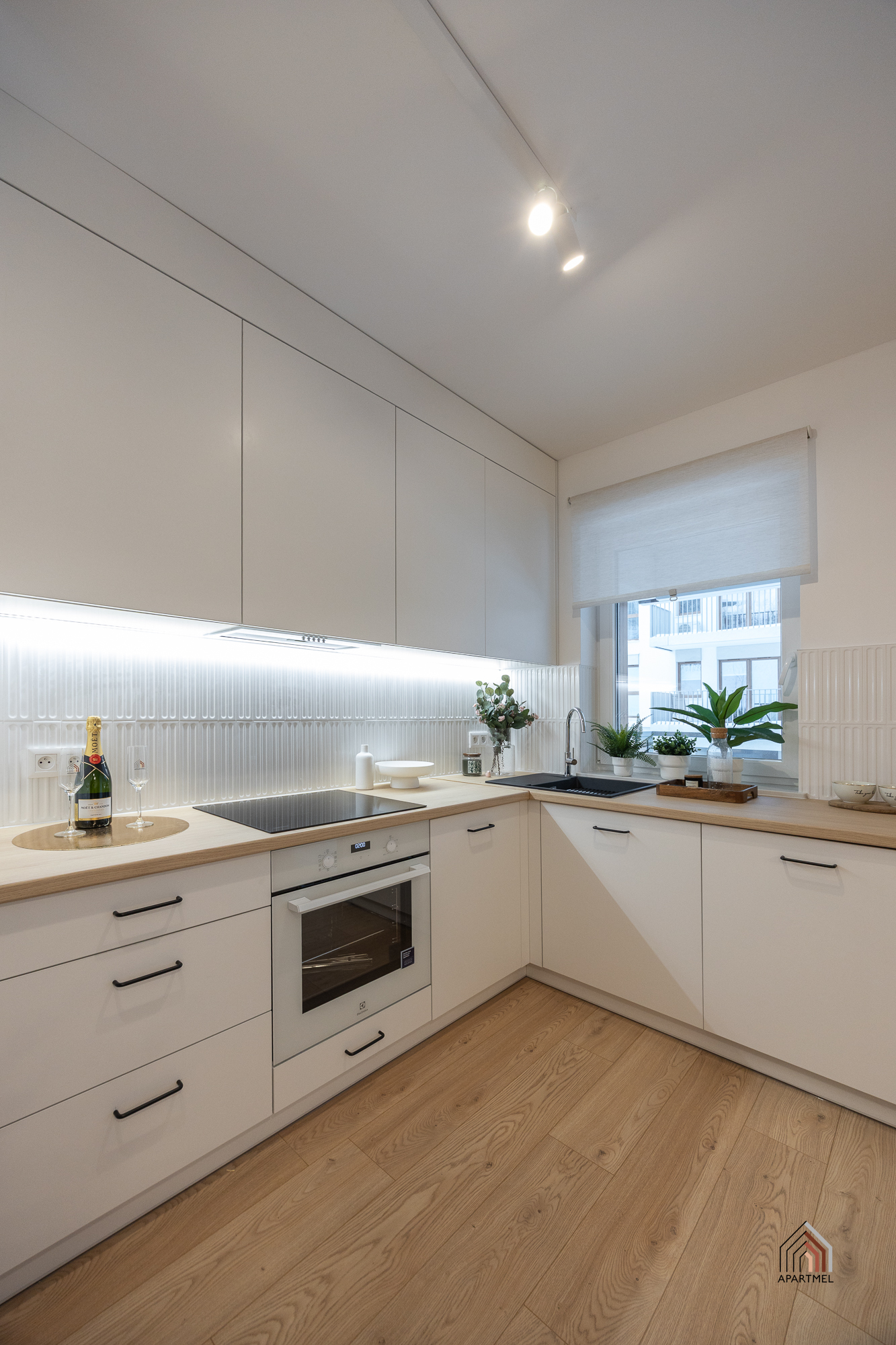 W kuchni ergonomiczna zabudowa meblowa, lodówka z zamrażarką, piekarnik, płyta indukcyjna, okap i zmywarka. Wszystkie sprzęty renomowanych marek, na gwarancji.