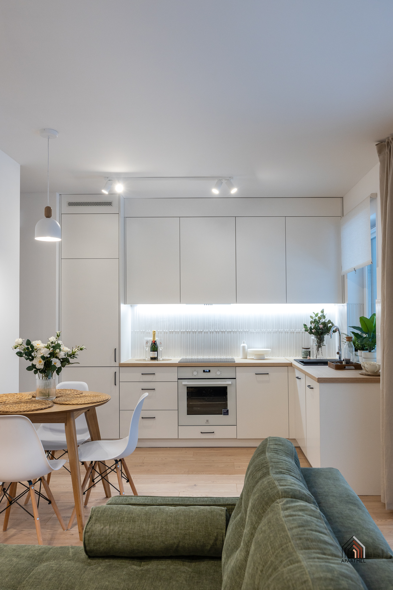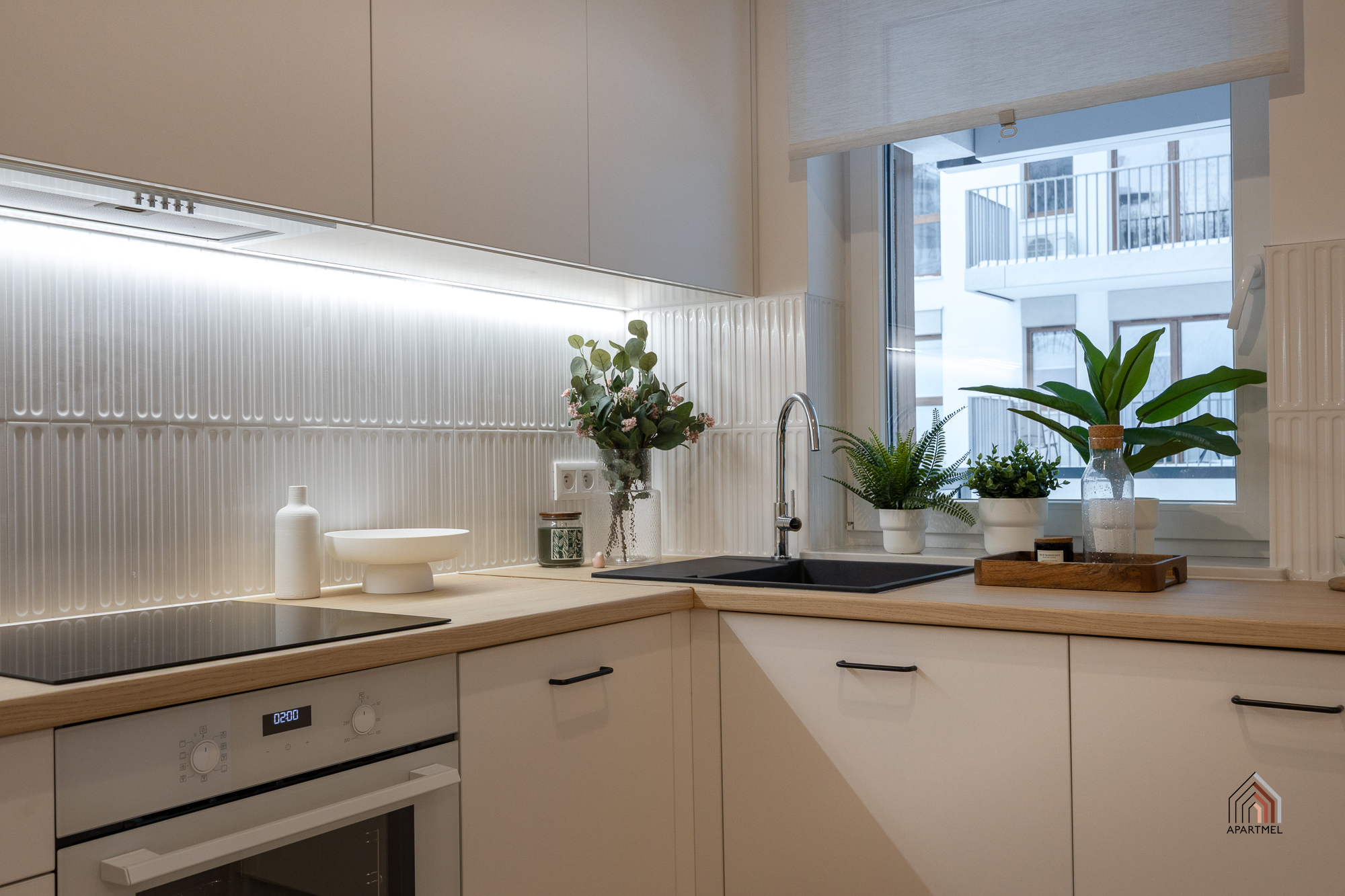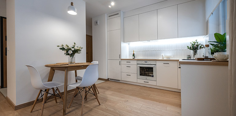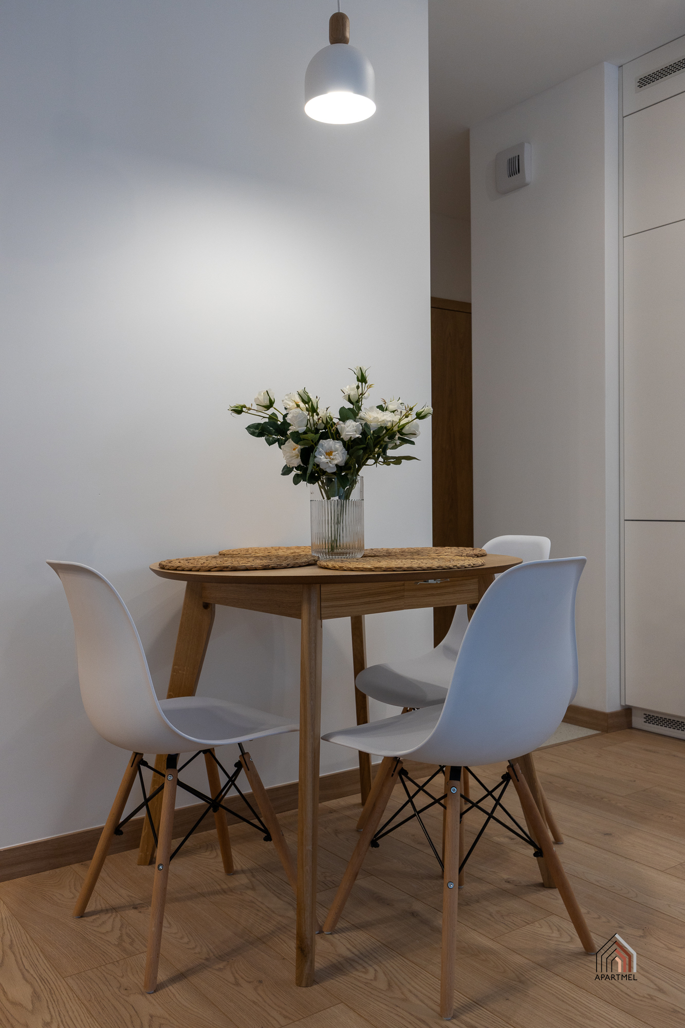 W kuchni ergonomiczna zabudowa meblowa, lodówka z zamrażarką, piekarnik, płyta indukcyjna, okap i zmywarka. Wszystkie sprzęty renomowanych marek, na gwarancji.