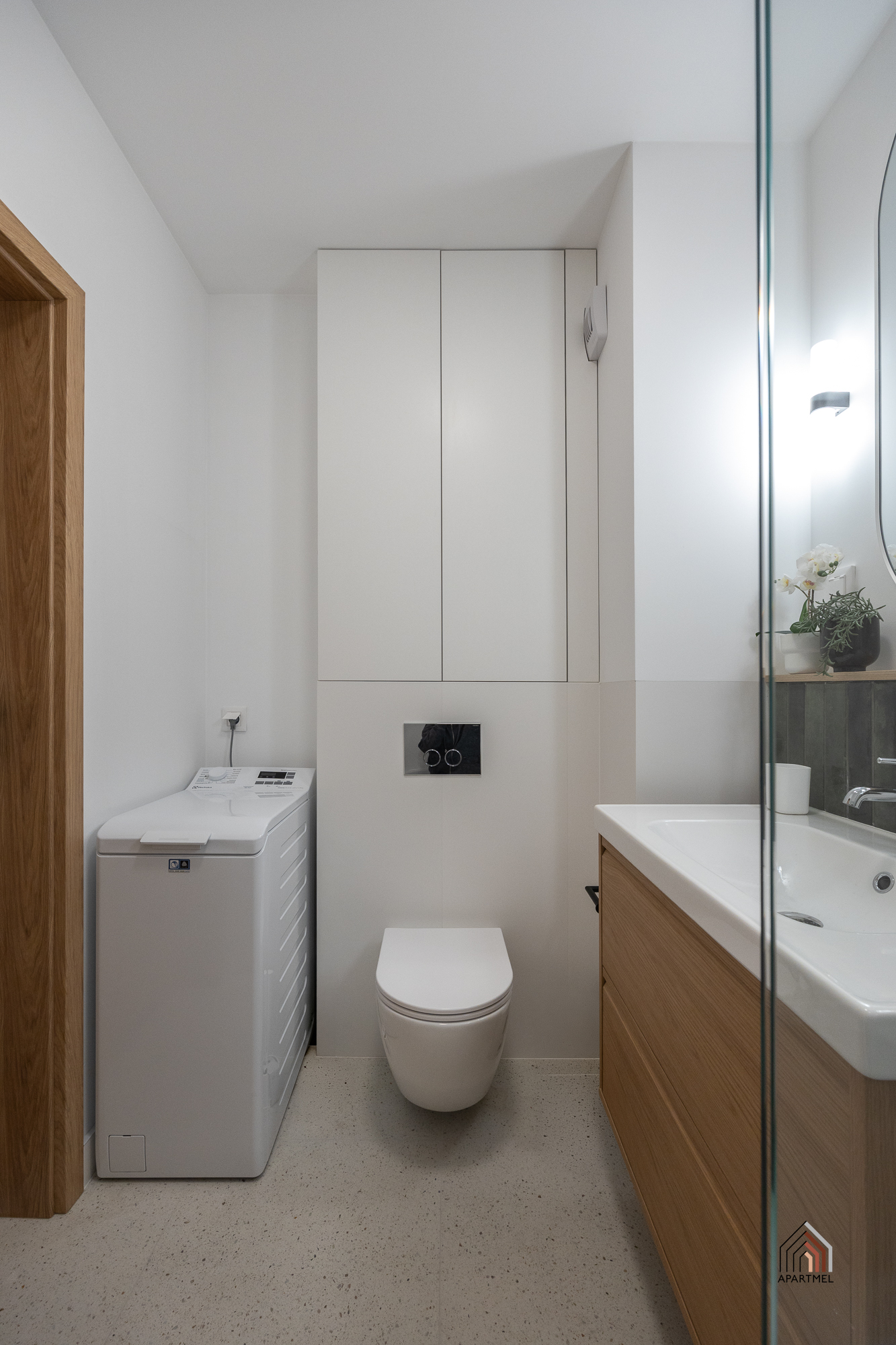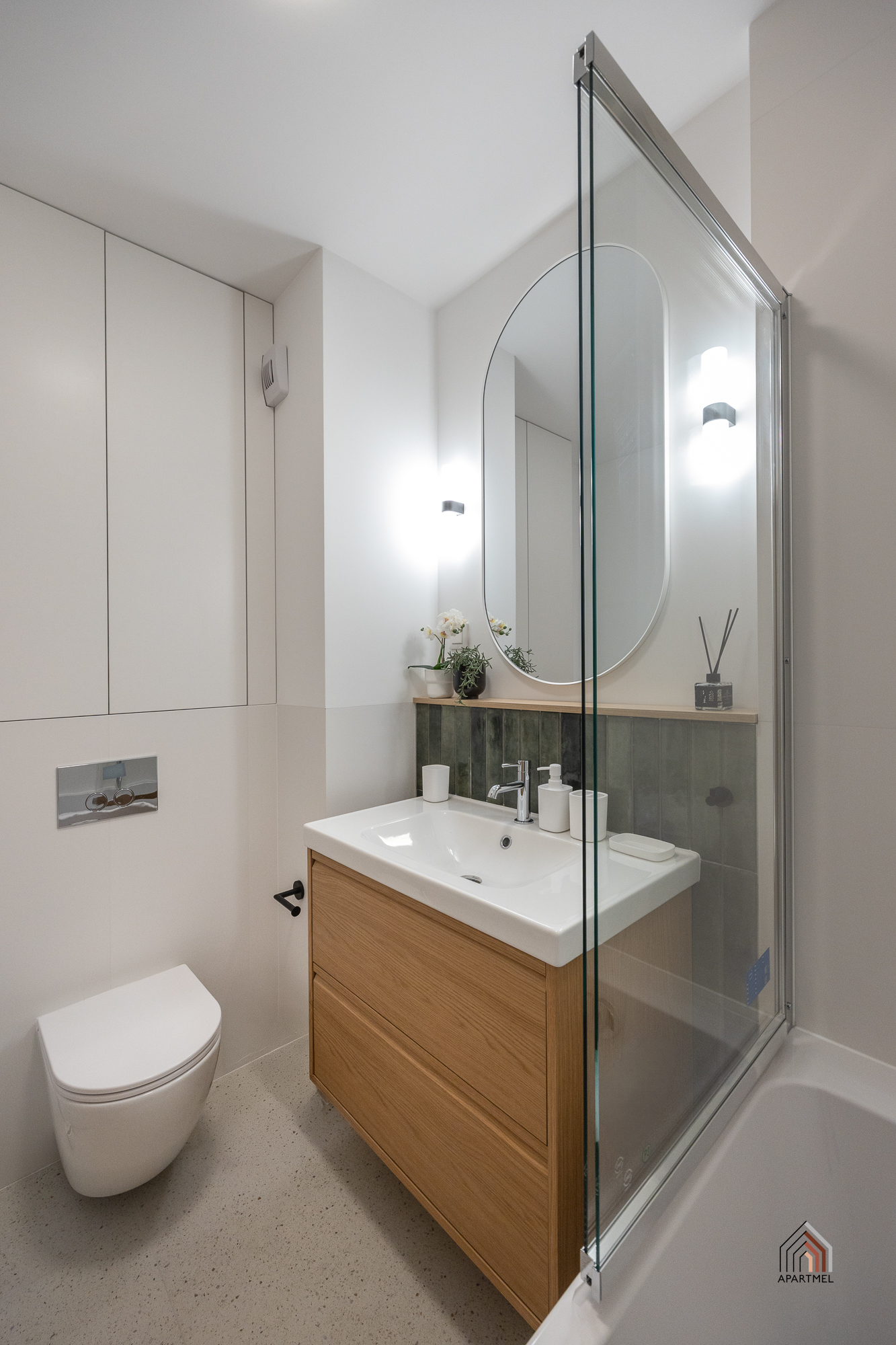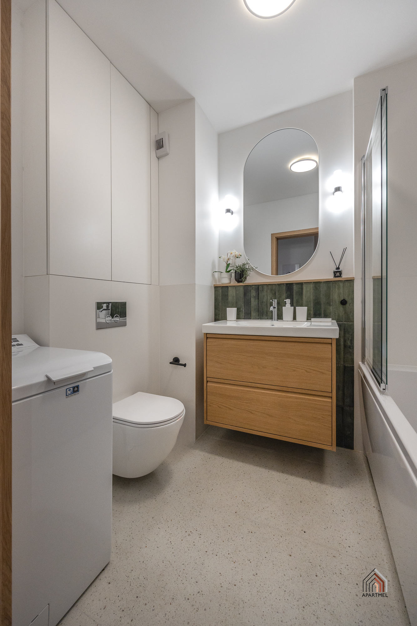 Łazienka jest elegancka, jasna, ze stylową armaturą i ceramiką dobrej jakości. Posiada wannę z deszczownicą, dużą umywalkę na szafce, pralkę Electrolux, miskę ustępową wiszącą z baterią bidetową w jej sąsiedztwie, szafkę wiszącą, lustro oraz lampy, a także wieszaki na ręczniki, uchwyt na papier toaletowy, kosz na śmieci, szczotkę do wc.