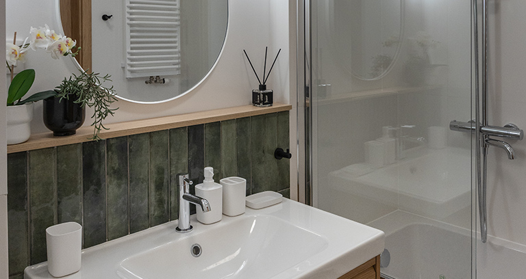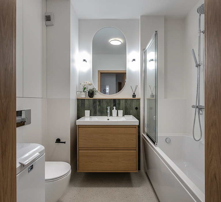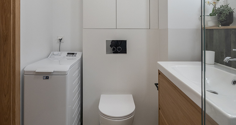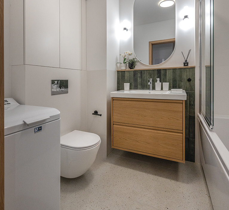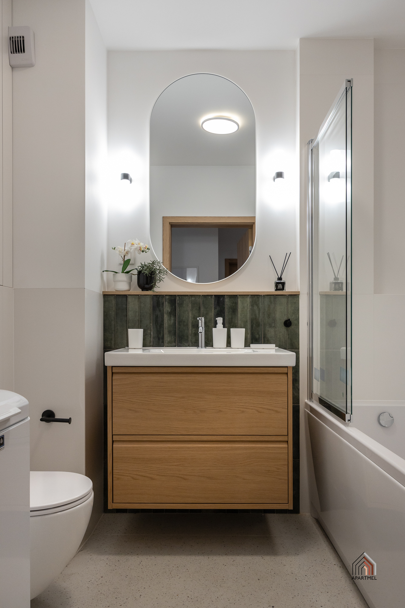 Łazienka jest elegancka, jasna, ze stylową armaturą i ceramiką dobrej jakości. Posiada wannę z deszczownicą, dużą umywalkę na szafce, pralkę Electrolux, miskę ustępową wiszącą z baterią bidetową w jej sąsiedztwie, szafkę wiszącą, lustro oraz lampy, a także wieszaki na ręczniki, uchwyt na papier toaletowy, kosz na śmieci, szczotkę do wc.