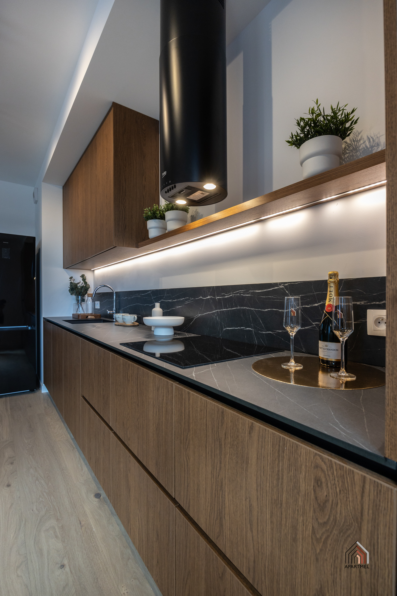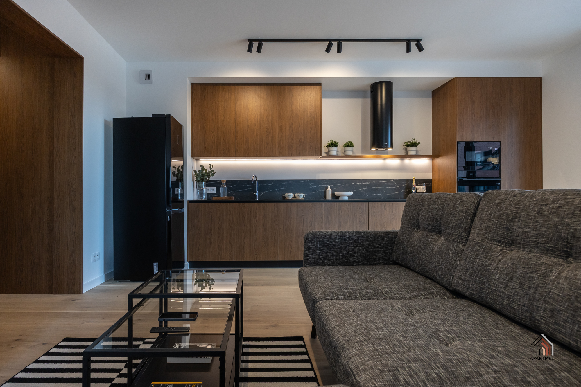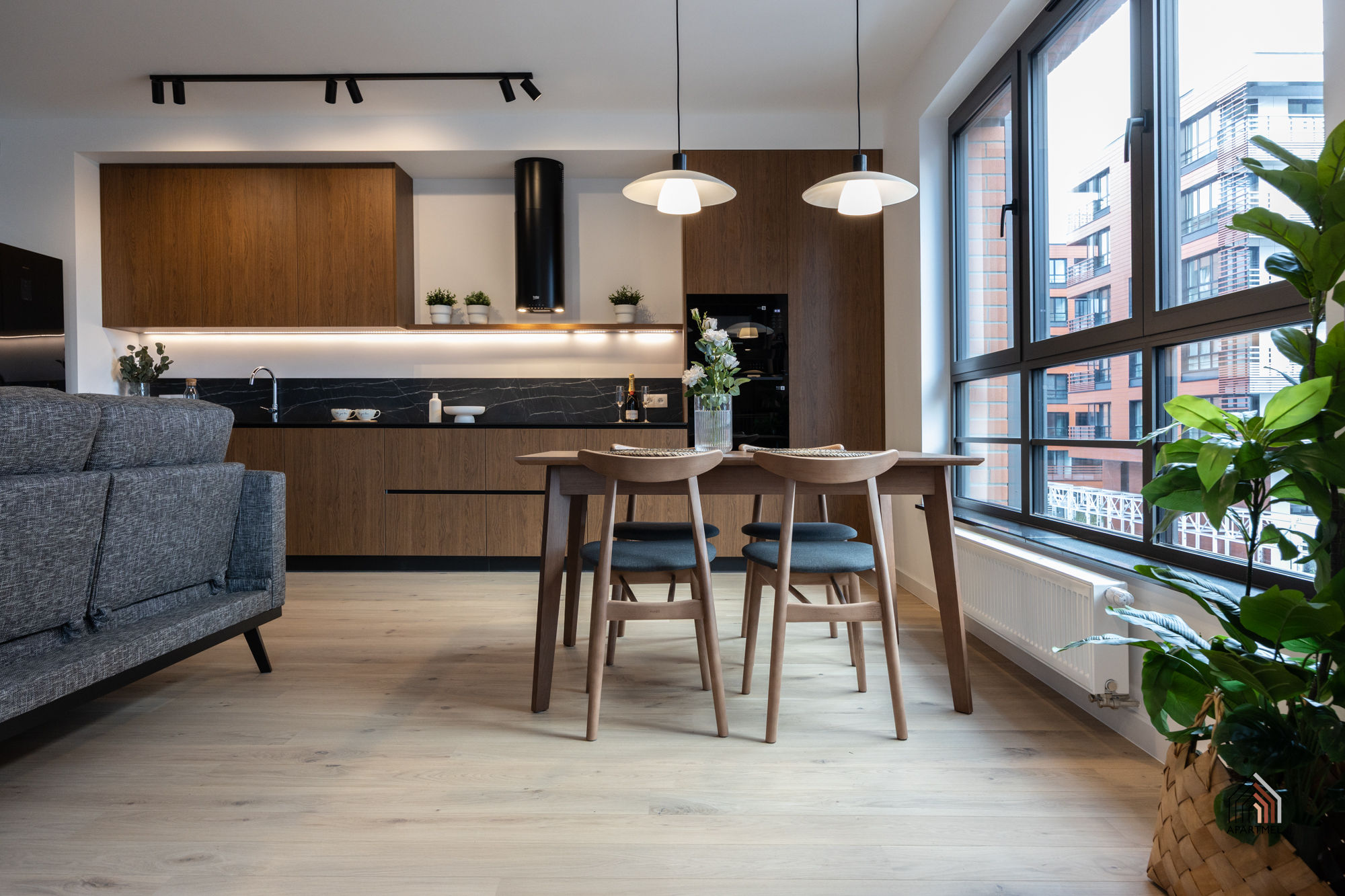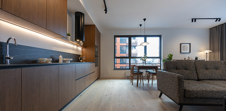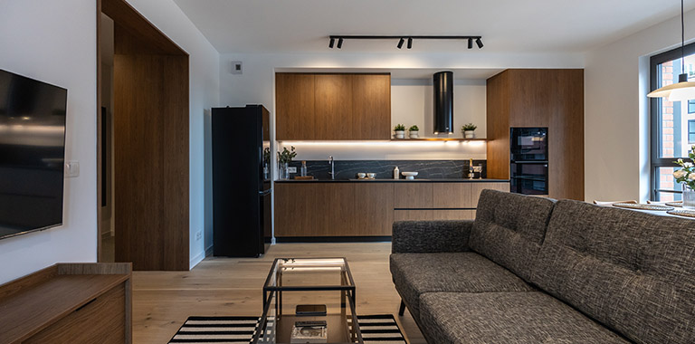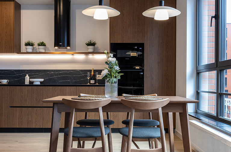 W otwartej na salon kuchni znajduje się ergonomiczna zabudowa meblowa, w której wkomponowano lodówkę z zamrażarką, piekarnik, płytę indukcyjną, okap oraz zmywarkę, co zapewnia pełną funkcjonalność i wygodę codziennego użytkowania. Całość uzupełnia praktyczny, funkcjonalny stół, który doskonale sprawdza się zarówno jako miejsce wspólnych posiłków, jak i przestrzeń do pracy czy spotkań towarzyskich.