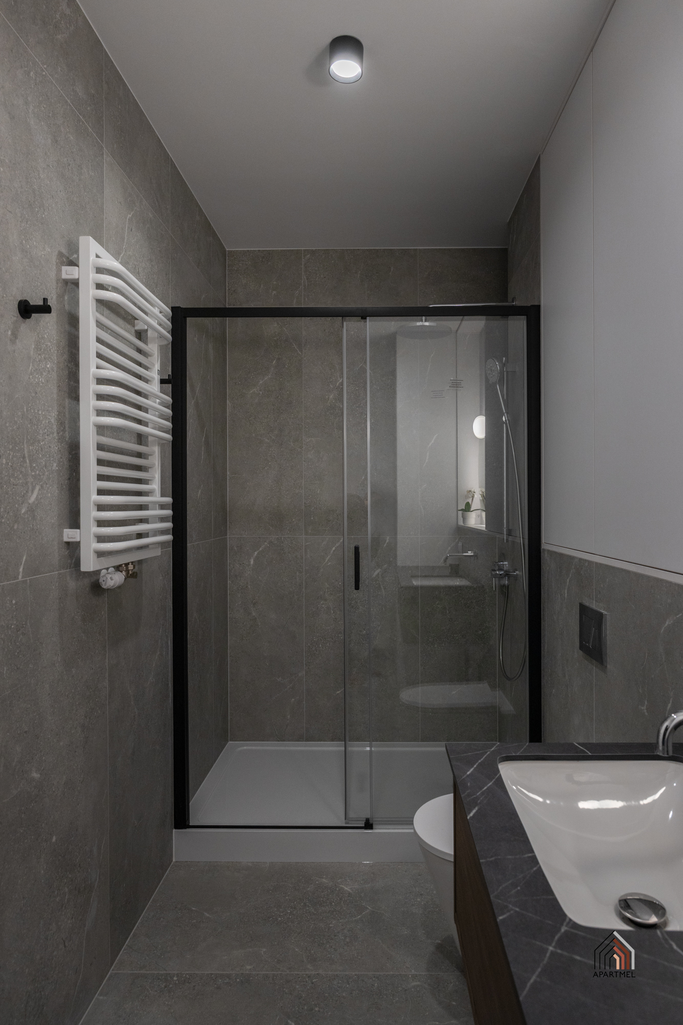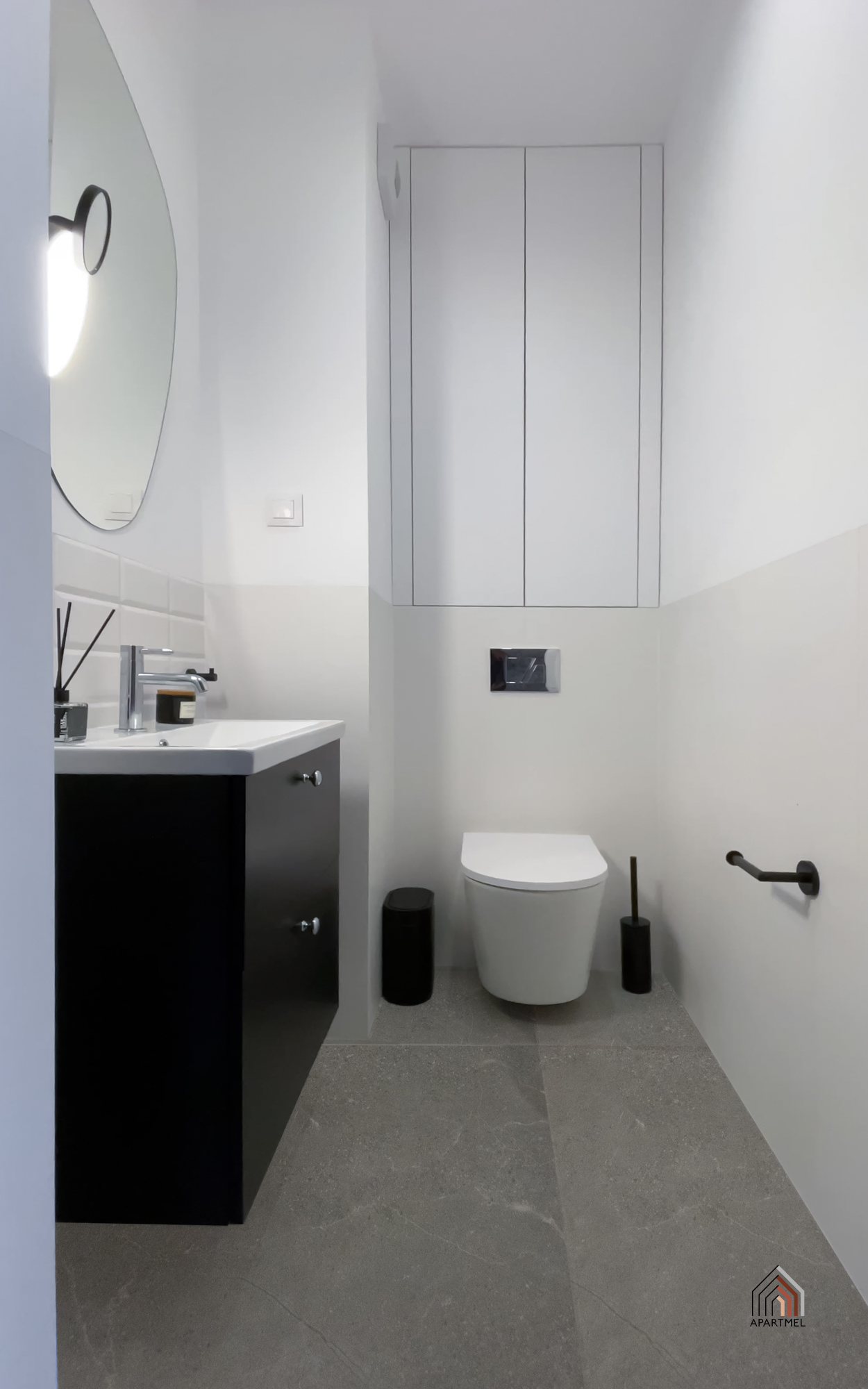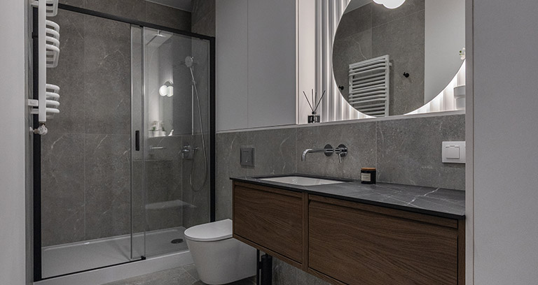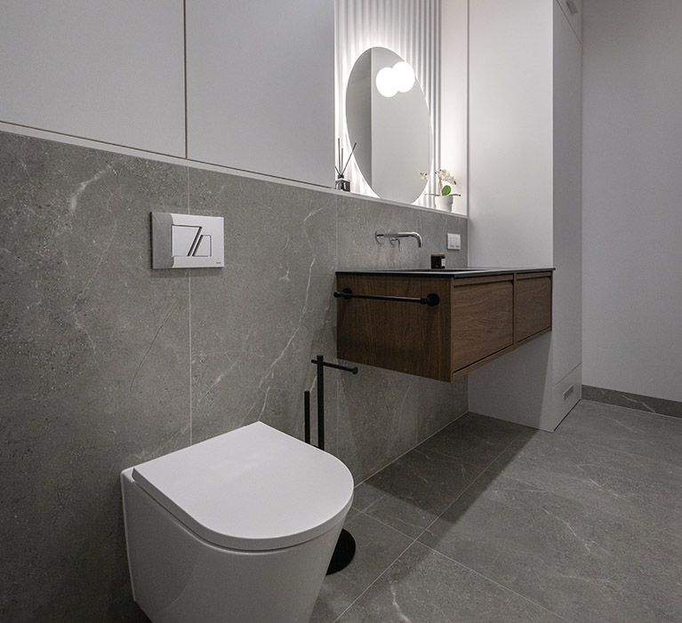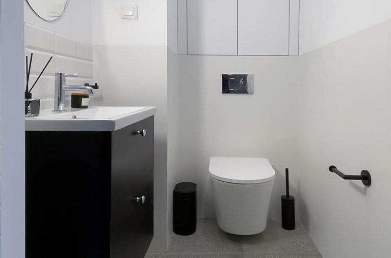 Łazienka jest elegancka i jasna, wyposażona w stylową armaturę oraz wysokiej jakości ceramikę. Znajduje się w niej obszerny prysznic praktyczną półką na kosmetyki, duża umywalka osadzona na szafce, wisząca miska ustępowa z baterią bidetową w sąsiedztwie, a także szafka wisząca, lustro oraz oświetlenie. Dodatkowo przestrzeń uzupełniają funkcjonalne akcesoria, takie jak wieszaki na ręczniki, uchwyt na papier toaletowy, kosz na śmieci i szczotka do WC.