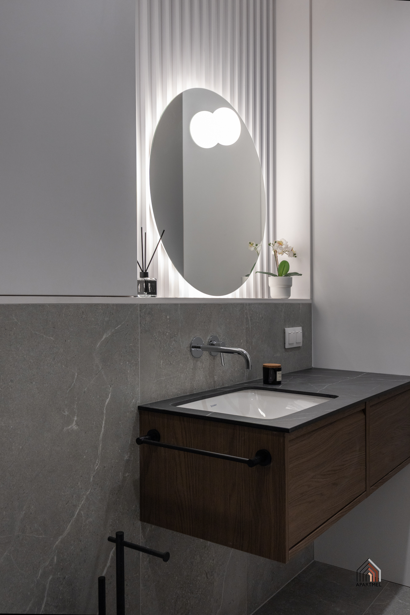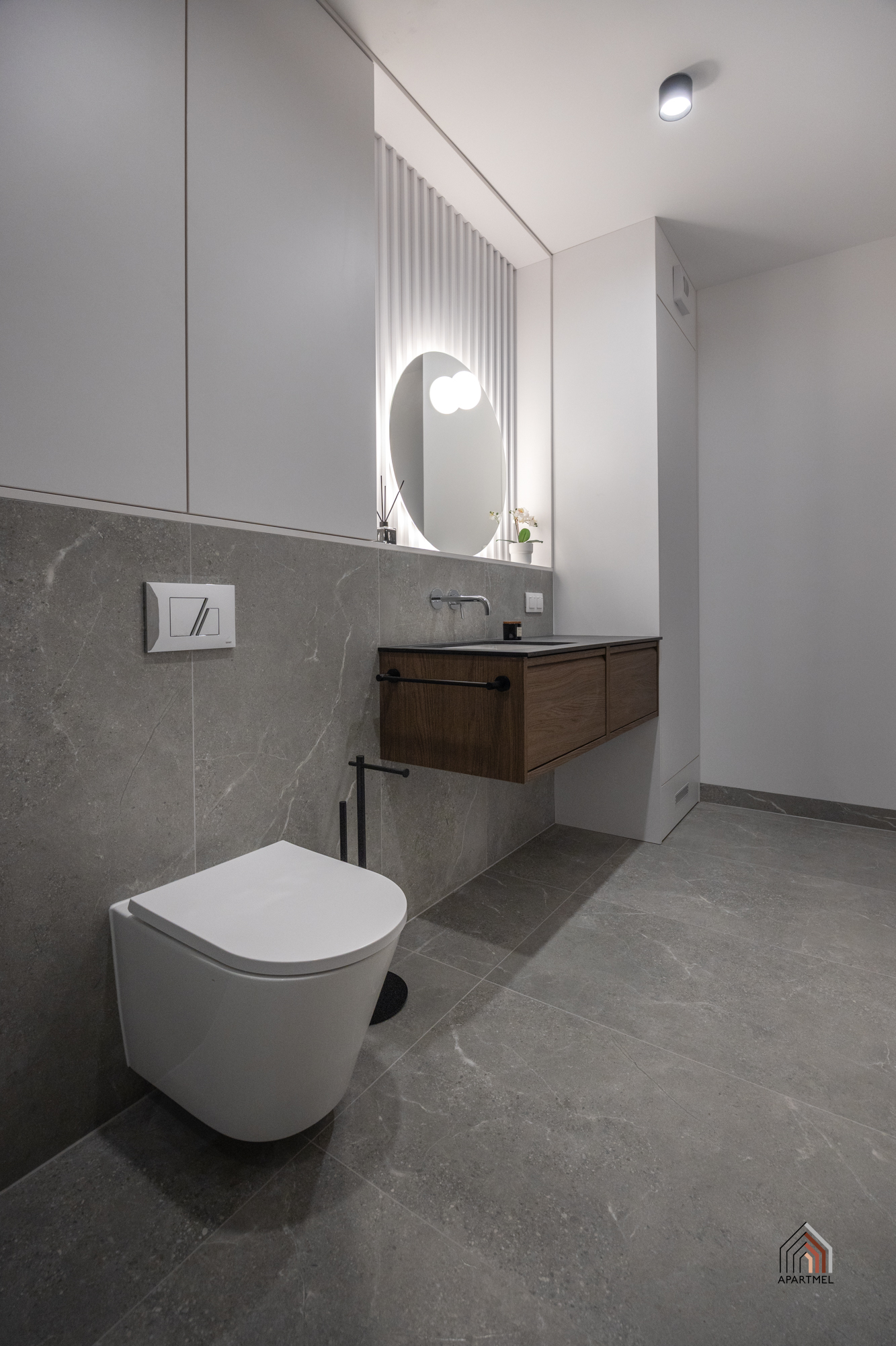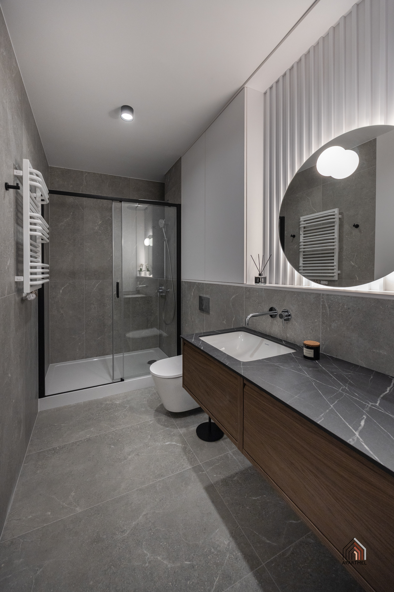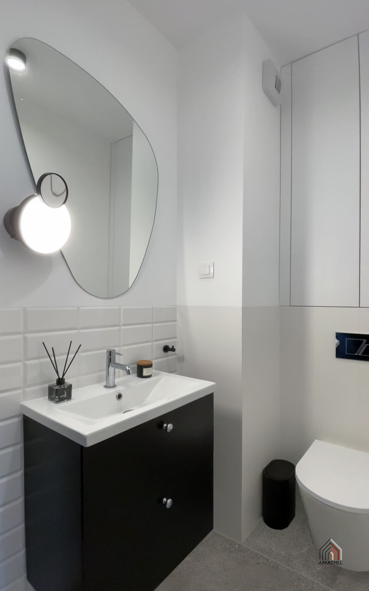 Łazienka jest elegancka i jasna, wyposażona w stylową armaturę oraz wysokiej jakości ceramikę. Znajduje się w niej obszerny prysznic praktyczną półką na kosmetyki, duża umywalka osadzona na szafce, wisząca miska ustępowa z baterią bidetową w sąsiedztwie, a także szafka wisząca, lustro oraz oświetlenie. Dodatkowo przestrzeń uzupełniają funkcjonalne akcesoria, takie jak wieszaki na ręczniki, uchwyt na papier toaletowy, kosz na śmieci i szczotka do WC.