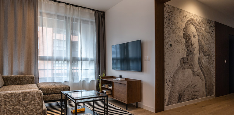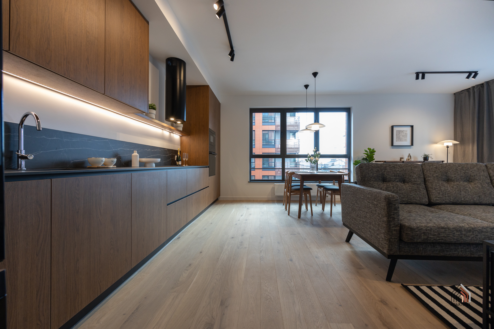 Apartament zlokalizowany jest na 3 piętrze, 8 piętrowego apartamentowca. Estetycznie przygotowane wnętrza części wspólnych nadają wyjątkowy charakter inwestycji. Garaże podziemne oraz tereny zielone okalające budynki dopełniają poczucie komfortu.