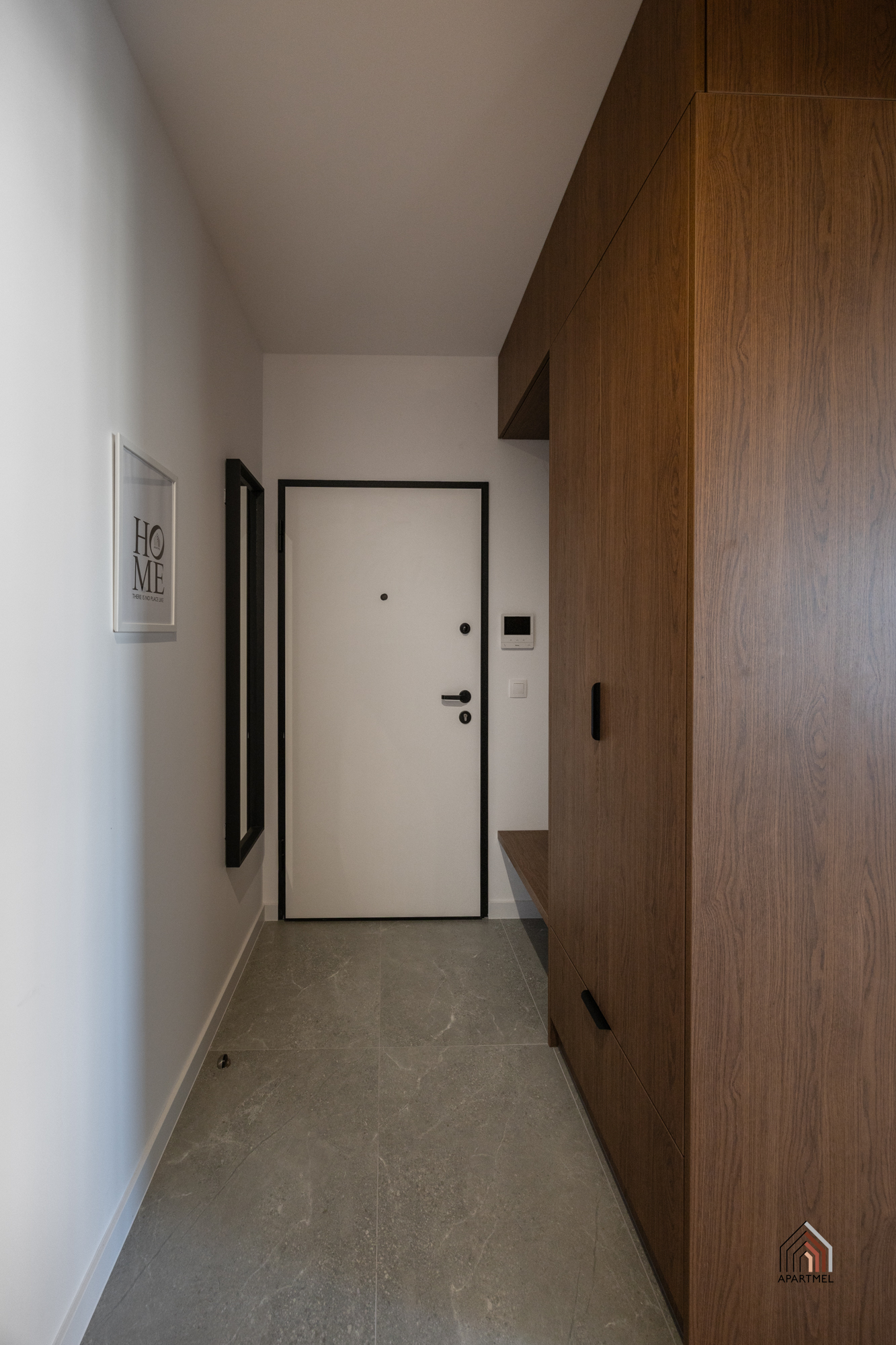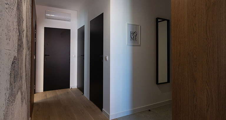 Strefa wejściowa z dużą, trójdzielną szafą ubraniową z wieszakami oraz gospodarczą. Dodatkowo puf, podręczny wieszak oraz lustro. Na podłogach położone są dobrej jakości płytki ceramiczne o podwyższonej odporności.