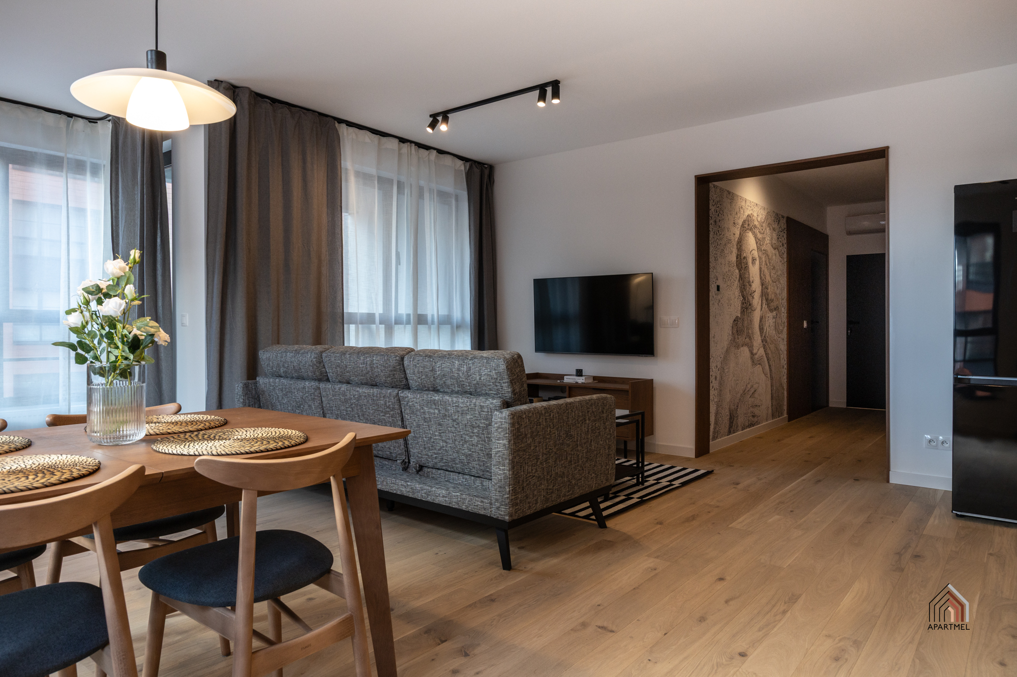 W salonie znajduje się rozkładana kanapa narożna, fotel, komoda , podwójny stolik kawowy, szafka RTV i podwieszany telewizor telewizor 55" Samsung 4K Smart TV, duży stół i 4 krzesła. W bardzo przestronnych oknach delikatne firanki i zaciemniające zasłony.