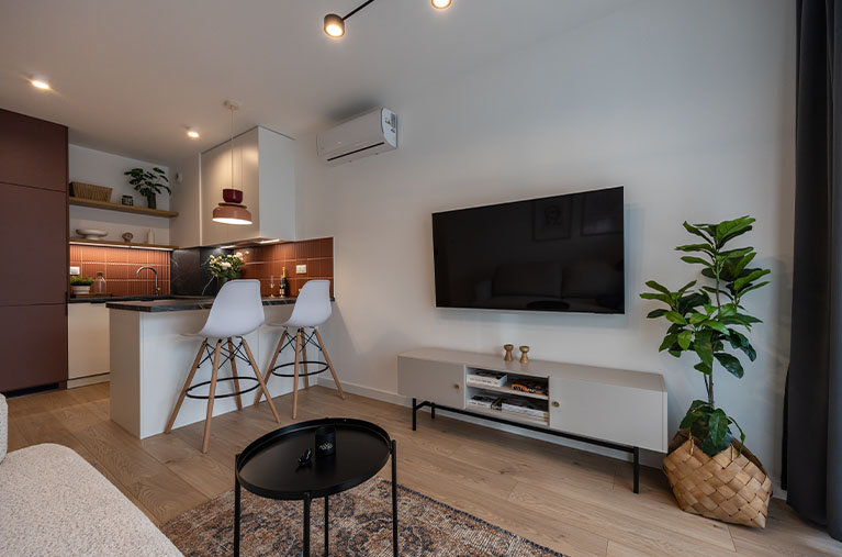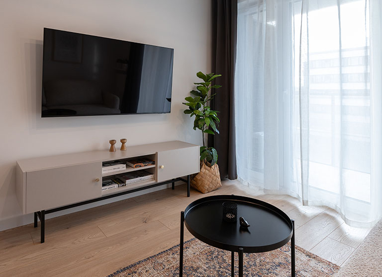 W salonie znajduje się obszerna narożna, rozkładana sofa, stolik kawowy, szafka RTV i podwieszany telewizor telewizor 55" Samsung 4K Smart TV, okrągły stół i 4 krzesła. W oknie balkonowym delikatne firanki i zasłony.