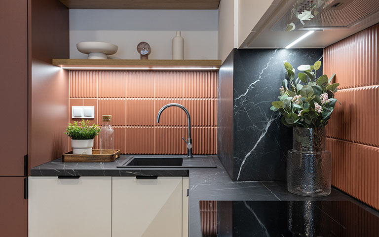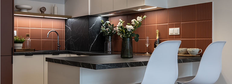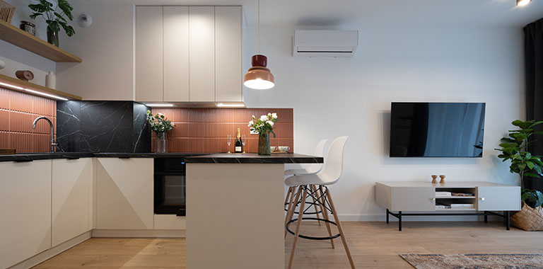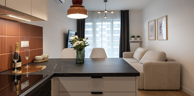 Przestrzeń kuchenna otwarta na pokój dzienny stanowią jedność – to połączenie spójnego wyglądu mebli i konsekwencji w doborze dodatków. Zabudowa meblowa wyróżnia się minimalistycznym wyglądem oraz markowym sprzętami dobrej jakości. Kuchnia w układzie litery L, wkomponowuje się kolorystycznie w całość wystroju. Jest tu wszystko co niezbędne: sprzęt AGD marki Samsung tj. duża lodówko-zamrażarka, piekarnik, płyta indukcyjna, kuchenka mikrofalowa, okap i zmywarka. Dodatkowo zlew konglomeratowy z dużą komorą i ociekaczem, kosze na śmieci z segregacją, czajnik elektryczny, szuflady, cargo, praktyczne listwy LED. Na wyposażeniu znajdują się ponadto: podkładki, sztućce, talerze, miski, szklanki, filiżanki do herbaty, deski do krojenia, zestaw noży kuchennych, komplet garnków, komplet patelni, przybory do gotowania.