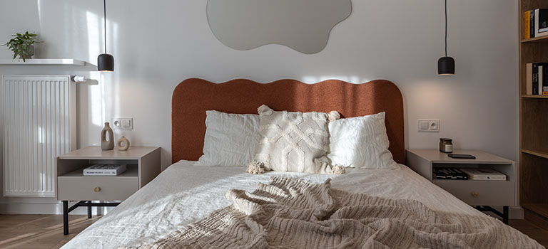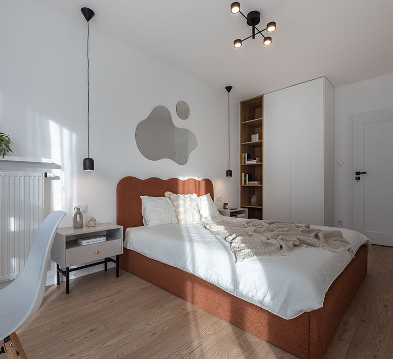 Sypialnia w stylu boho posiada wygodne łóżko kontynentalne z zagłówkiem i dużą skrzynią na pościel, a także wsad pościelowy tj. kołdra i dwie poduszki, bardzo pojemną szafę z regałem. Obok łóżka szafki nocne, lampki oraz gniazdka, w oknach firanki i zasłony.