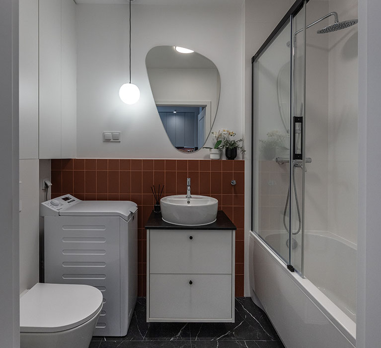 Jasna łazienka wykończona jest w stylu nowoczesnym z czarnymi dodatkami, które nadają charakteru całemu pomieszczeniu. Na wyposażeniu jest prysznic z deszczownicą oraz półką na kosmetyki, umywalka na szafce z dwiema szufladami, pralkę Electrolux, miskę ustępową wiszącą z baterią bidetową w jej sąsiedztwie, bardzo duże lustro , a także wieszaki na ręczniki, uchwyt na papier toaletowy, szczotkę do wc i kosz na śmieci.