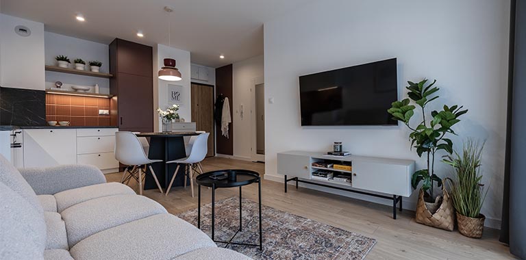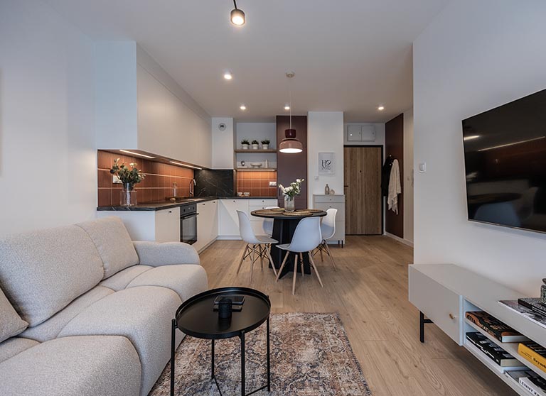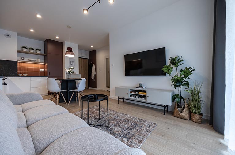 W salonie znajduje się rozkładana sofa, stolik kawowy, szafka RTV i podwieszany telewizor telewizor 55" Samsung 4K Smart TV, okrągły stół i 4 krzesła. W oknie balkonowym delikatne firanki i zasłony.
