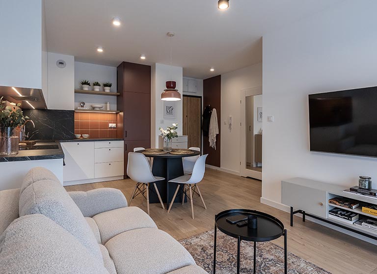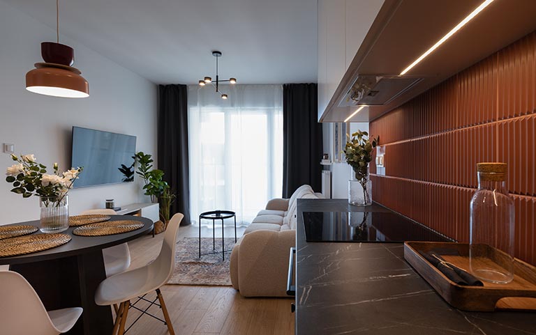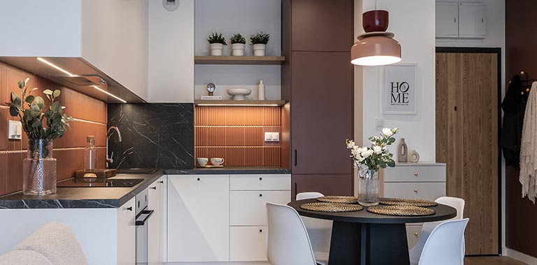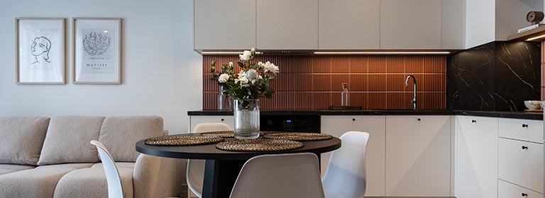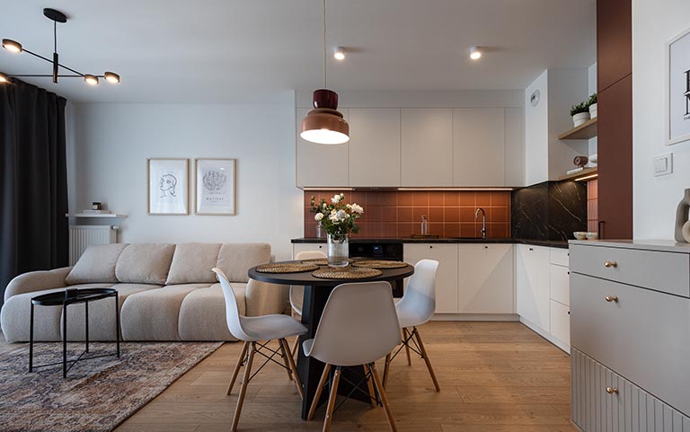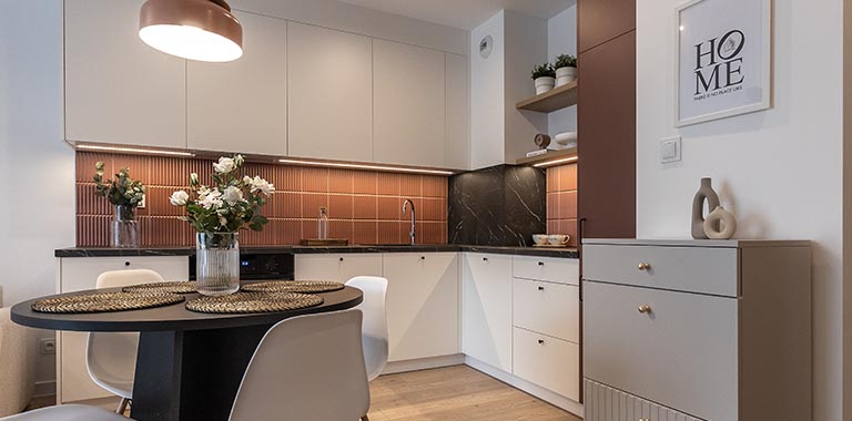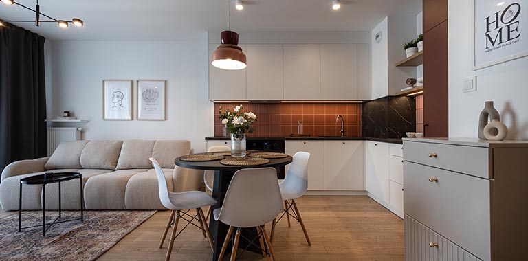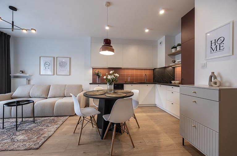 Przestrzeń kuchenna otwarta na pokój dzienny stanowią jedność – to połączenie spójnego wyglądu mebli i konsekwencji w doborze dodatków. Zabudowa meblowa wyróżnia się minimalistycznym wyglądem oraz markowym sprzętami dobrej jakości. Kuchnia w układzie litery L, wkomponowuje się kolorystycznie w całość wystroju. Jest tu wszystko co niezbędne: sprzęt AGD marki Samsung tj. duża lodówko-zamrażarka, piekarnik, płyta indukcyjna, kuchenka mikrofalowa, okap i zmywarka. Dodatkowo zlew konglomeratowy z dużą komorą i ociekaczem, kosze na śmieci z segregacją, czajnik elektryczny, szuflady, cargo, praktyczne listwy LED. Na wyposażeniu znajdują się ponadto: podkładki, sztućce, talerze, miski, szklanki, filiżanki do herbaty, deski do krojenia, zestaw noży kuchennych, komplet garnków, komplet patelni, przybory do gotowania.