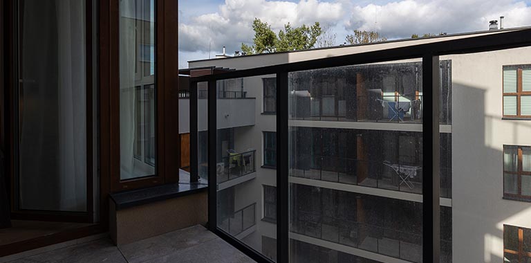 Na balkonie płytka tarasowa, ściany w strukturalnym tynku. Z pewnością może być odpowiednim miejscem do codziennego relaksu czy wypicia porannej kawy.