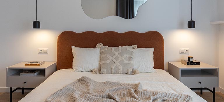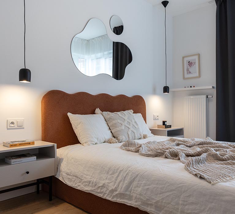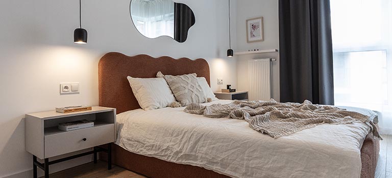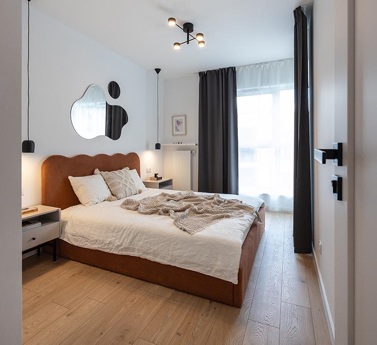 Sypialnia w stylu boho posiada wygodne łóżko kontynentalne z zagłówkiem i dużą skrzynią na pościel, a także wsad pościelowy tj. kołdra i dwie poduszki, bardzo pojemną szafę z regałem. Obok łóżka szafki nocne, lampki oraz gniazdka, w oknach firanki i zasłony.