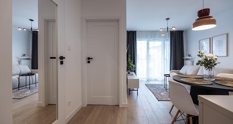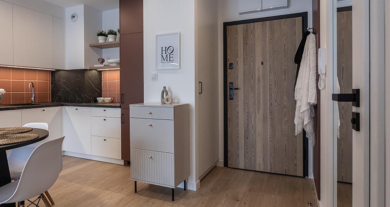 Elegancka strefa wejściowa posiada dużą, zabudowaną szafą ubraniową plus podręczny wieszak na ubrania oraz duże lustro.