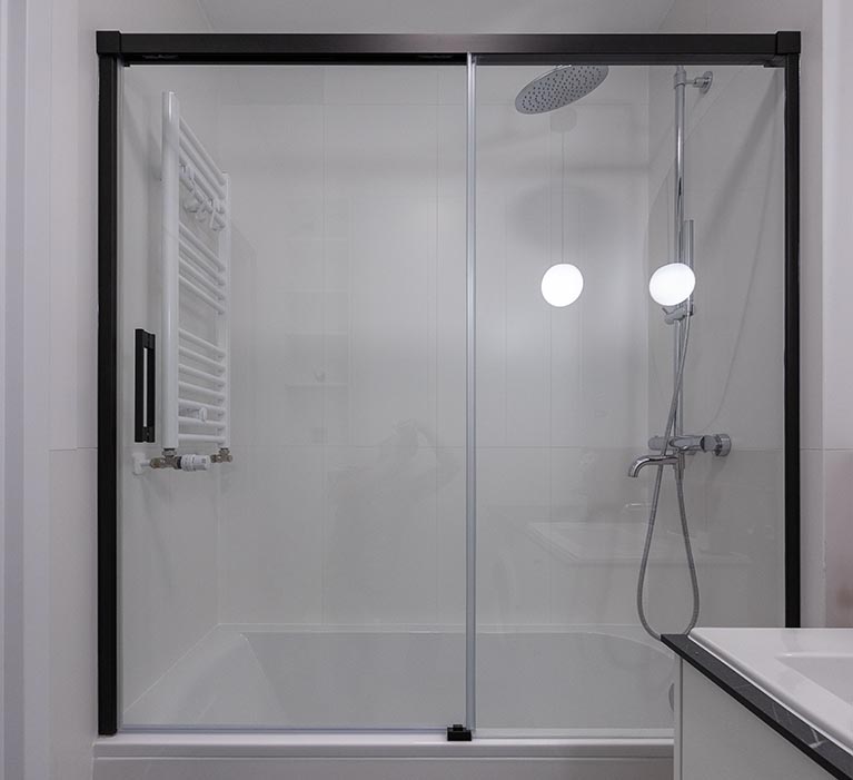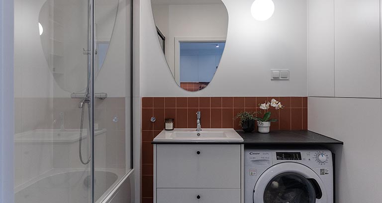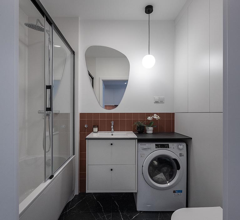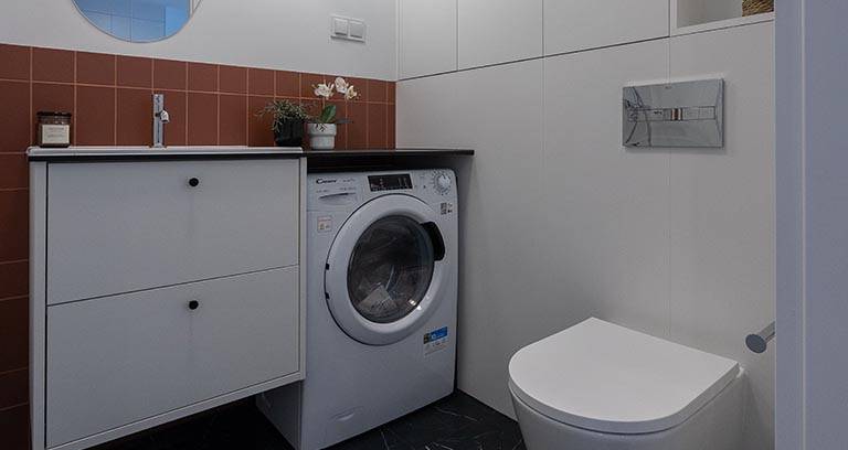 Jasna łazienka wykończona jest w stylu nowoczesnym z czarnymi dodatkami, które nadają charakteru całemu pomieszczeniu. Na wyposażeniu jest prysznic z deszczownicą oraz półką na kosmetyki, umywalka na szafce z dwiema szufladami, pralkę Electrolux, miskę ustępową wiszącą z baterią bidetową w jej sąsiedztwie, bardzo duże lustro , a także wieszaki na ręczniki, uchwyt na papier toaletowy, szczotkę do wc i kosz na śmieci.