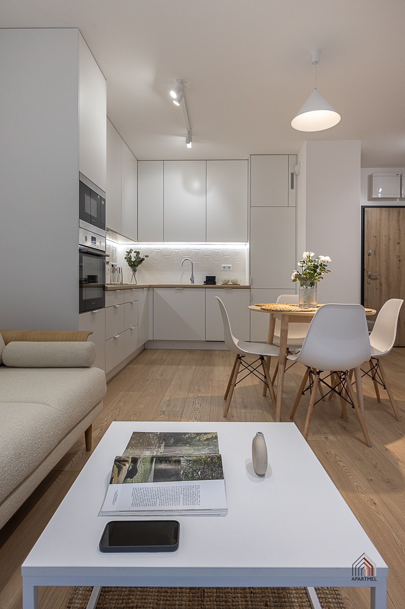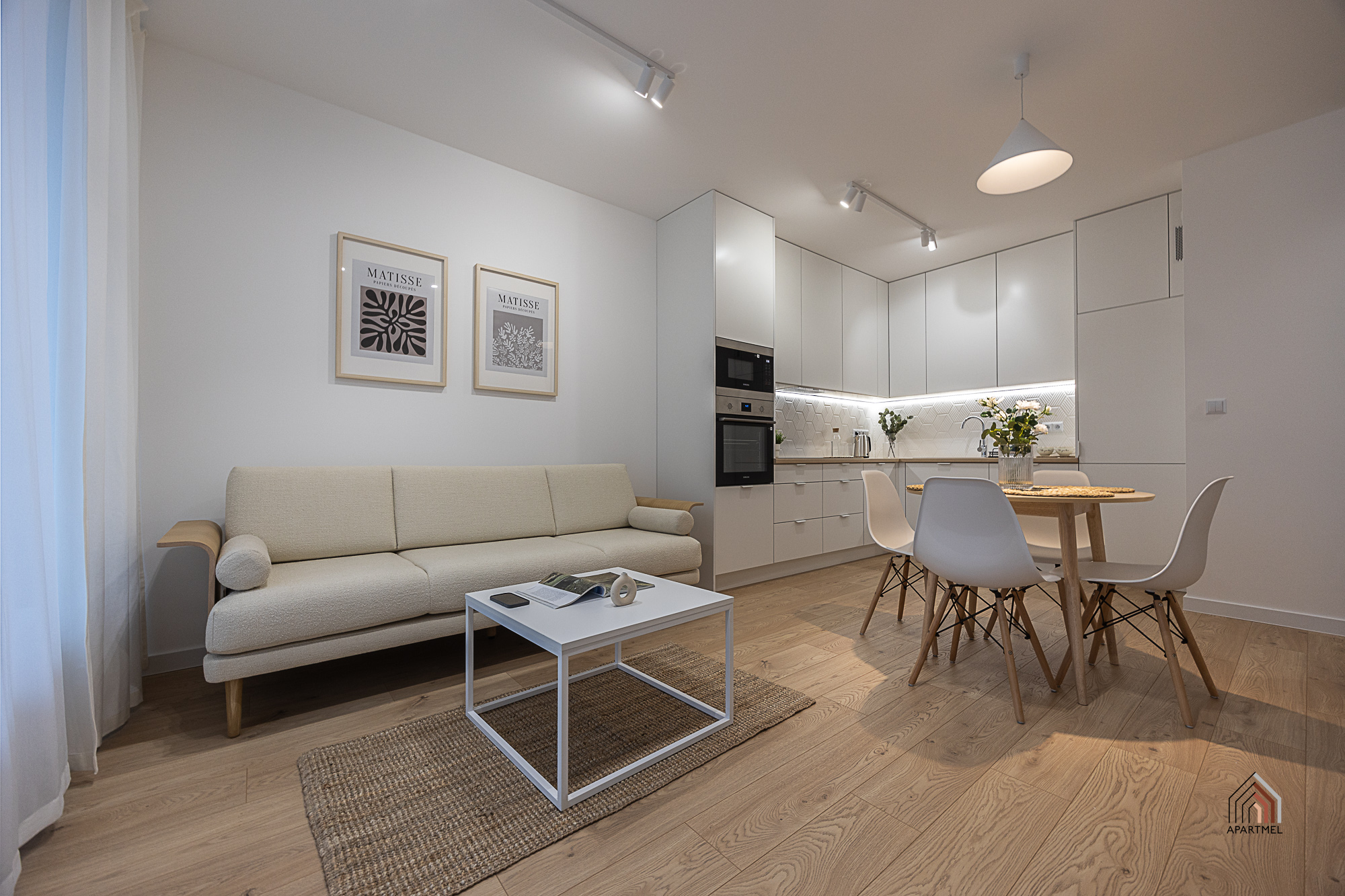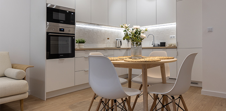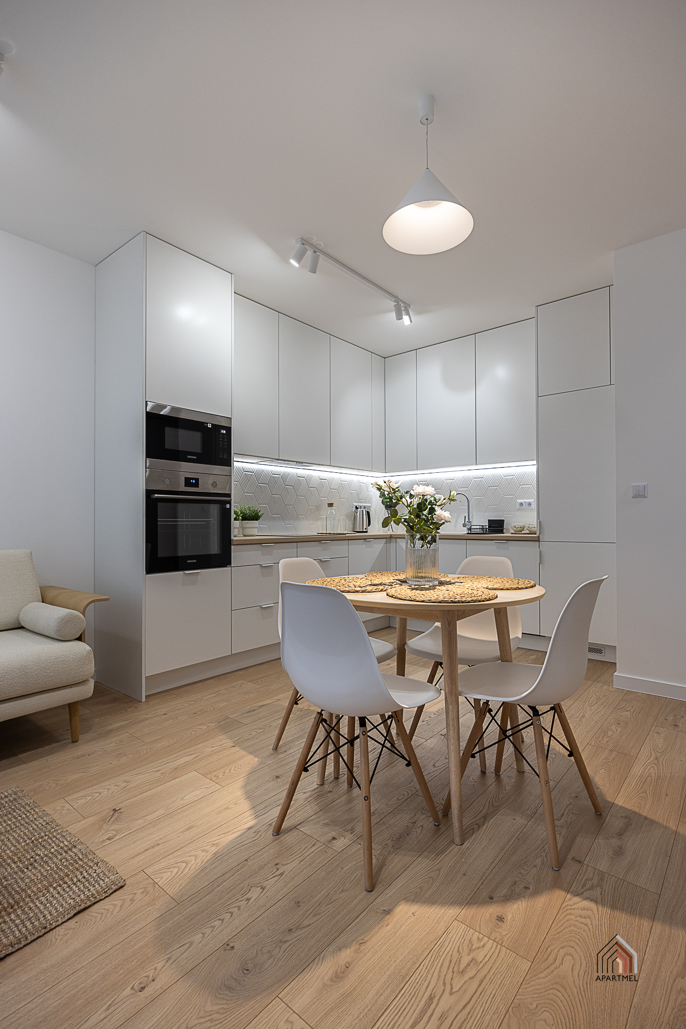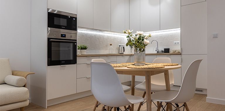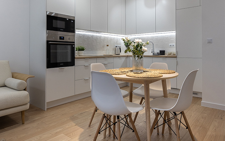 W otwartej na salon kuchni ergonomiczna zabudowa meblowa, lodówka z zamrażarką, piekarnik, płyta indukcyjna, okap i zmywarka. Dodatkowo podkładki, sztućce, talerze, miski, szklanki, filiżanki do herbaty, deski do krojenia, zestaw noży kuchennych, komplet garnków, komplet patelni, przybory do gotowania.