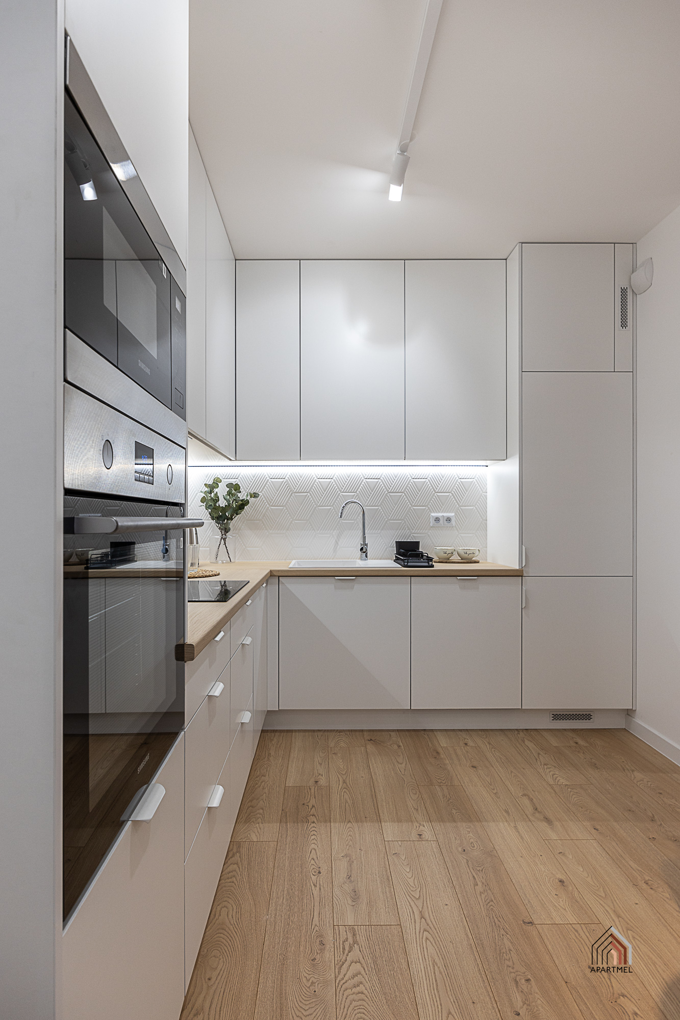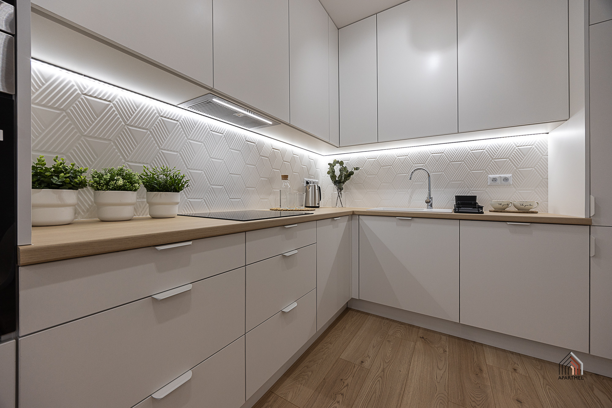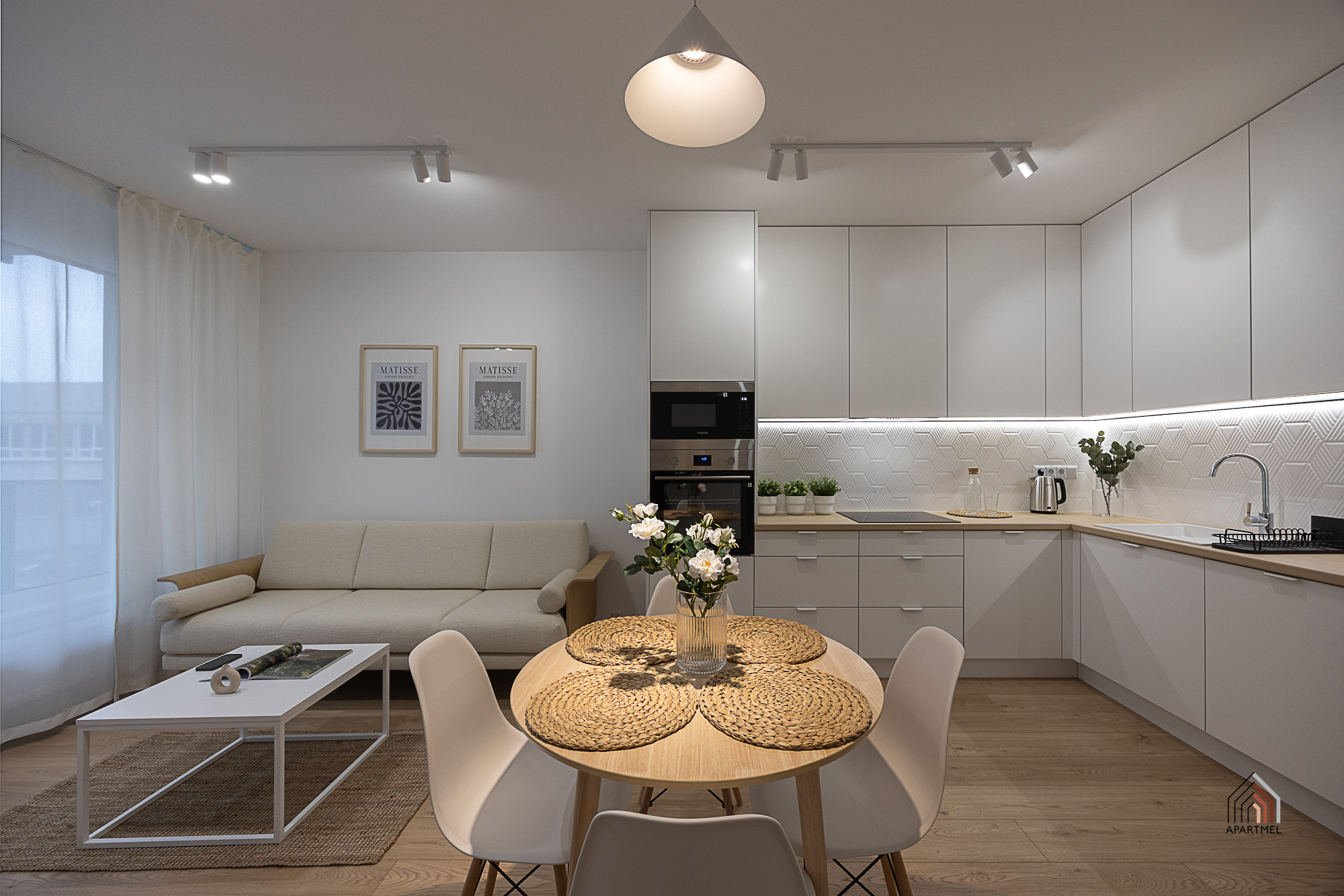 W otwartej na salon kuchni ergonomiczna zabudowa meblowa, lodówka z zamrażarką, piekarnik, płyta indukcyjna, okap i zmywarka. Dodatkowo podkładki, sztućce, talerze, miski, szklanki, filiżanki do herbaty, deski do krojenia, zestaw noży kuchennych, komplet garnków, komplet patelni, przybory do gotowania.