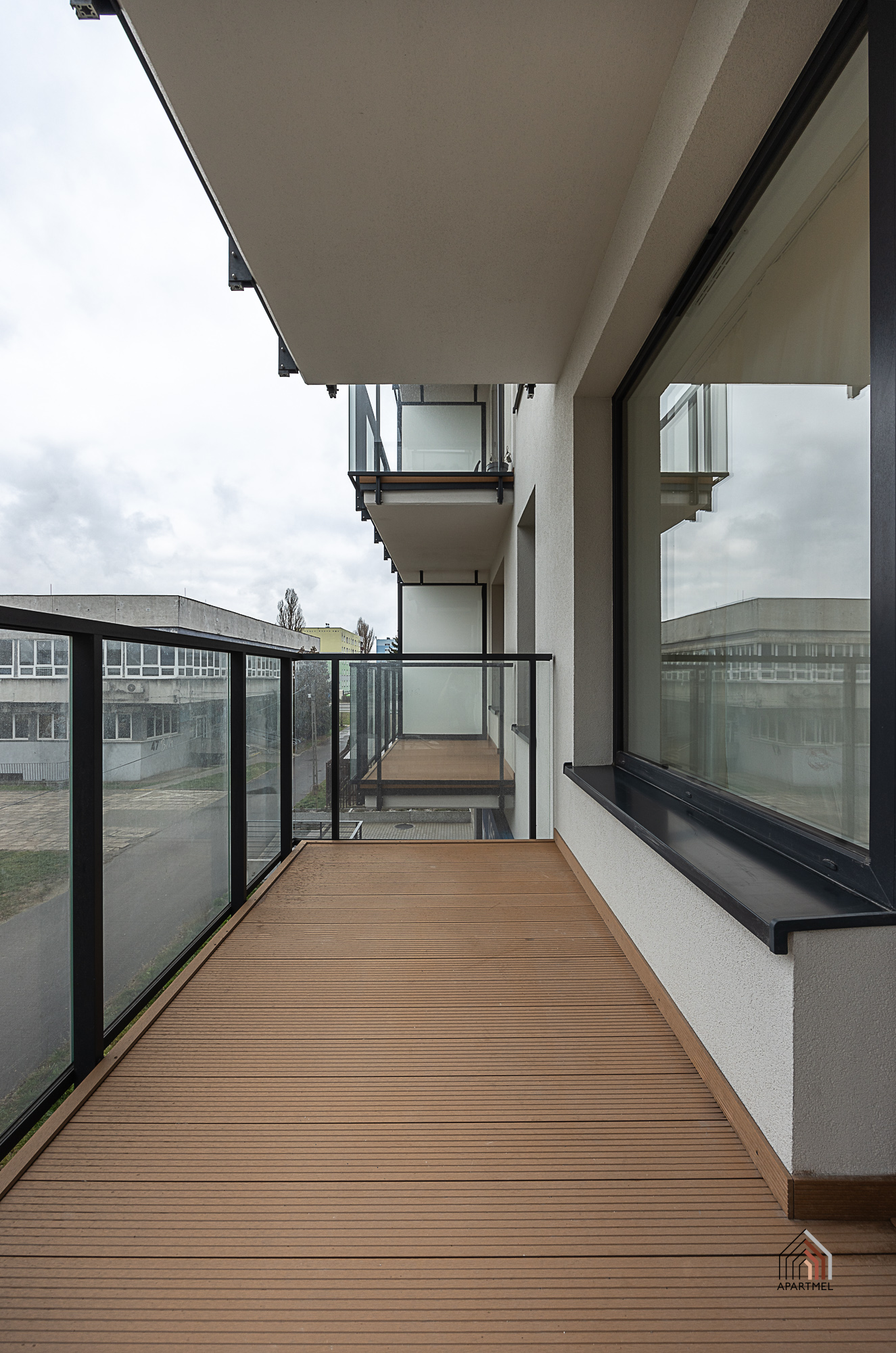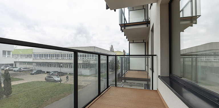 Na balkonach deska tarasowa / na ścianach tynk strukturalny / balustrada barierka + szkło