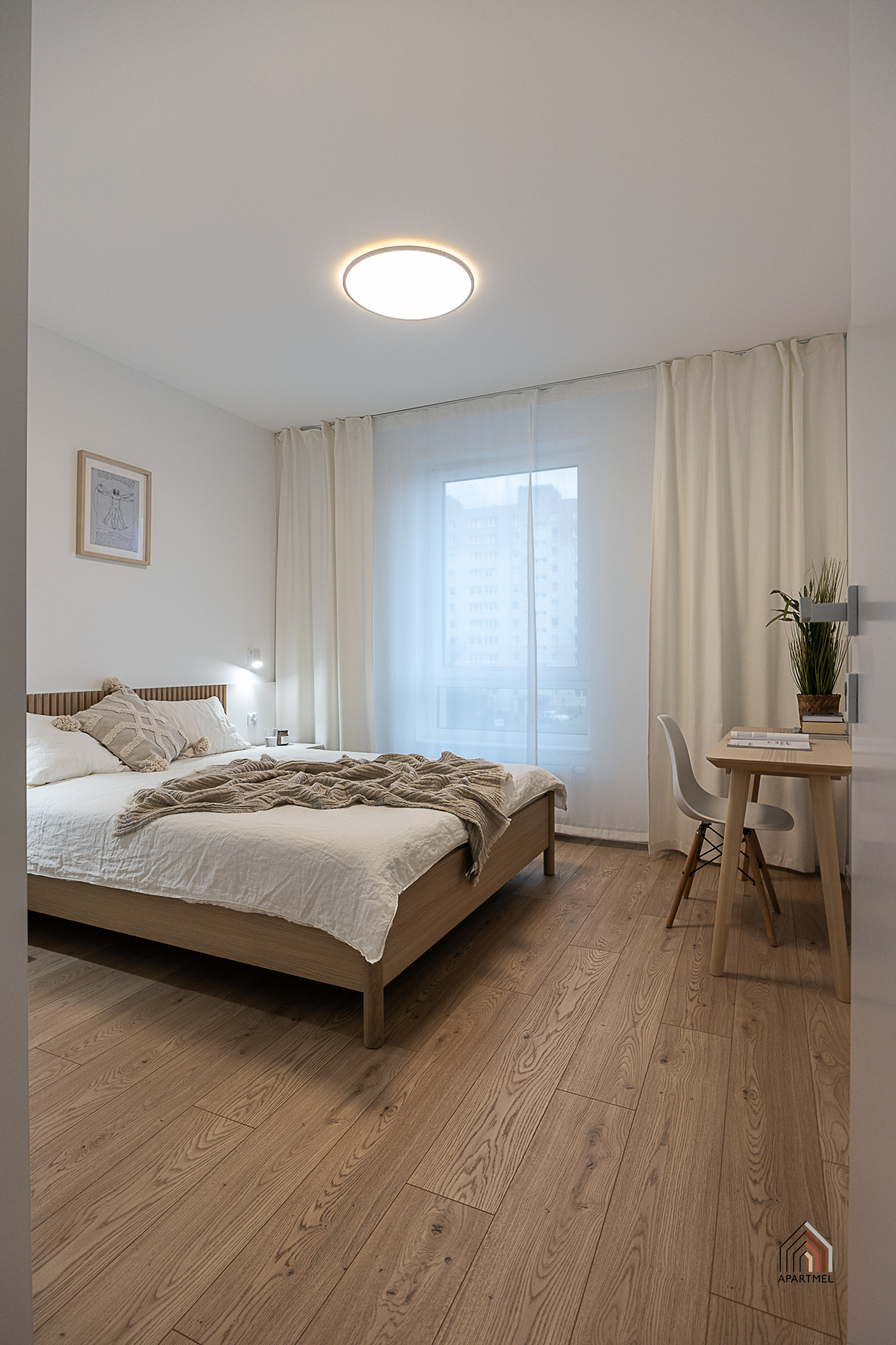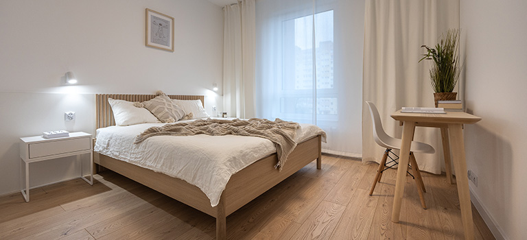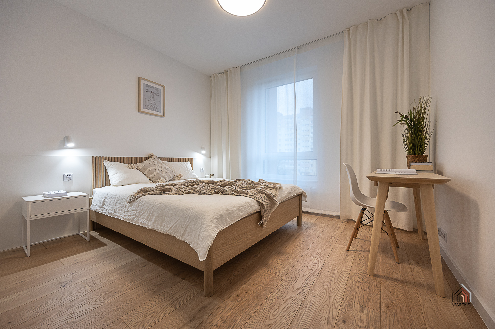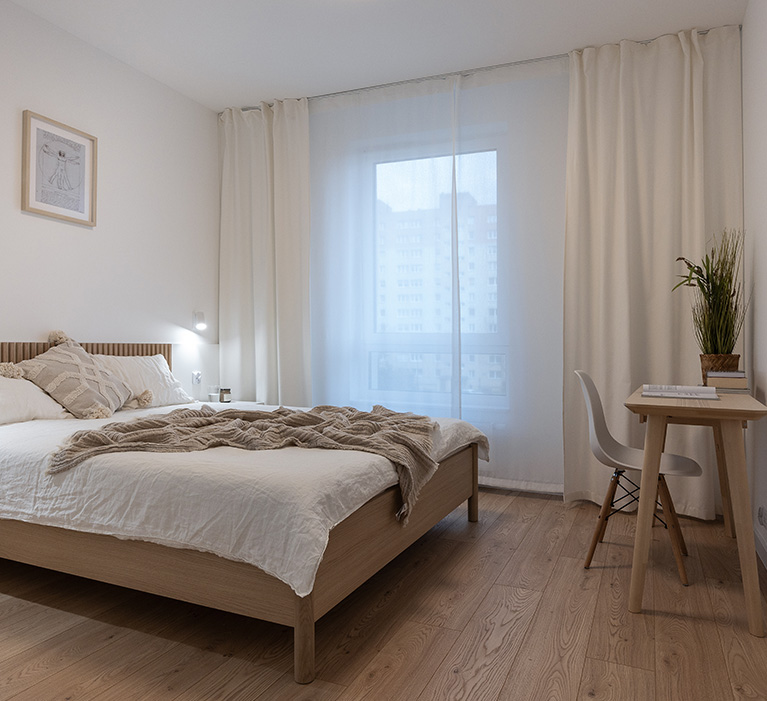 Sypialnia posiada wygodne łóżko, a także wsad pościelowy tj. kołdra i dwie poduszki, bardzo pojemną szafę i półkę wiszącą. Obok łóżka szafka nocna, biurko z krzesłem. lampki oraz gniazdka, w oknach firanki. Wyjście z sypialni bezpośrednio na balkon.