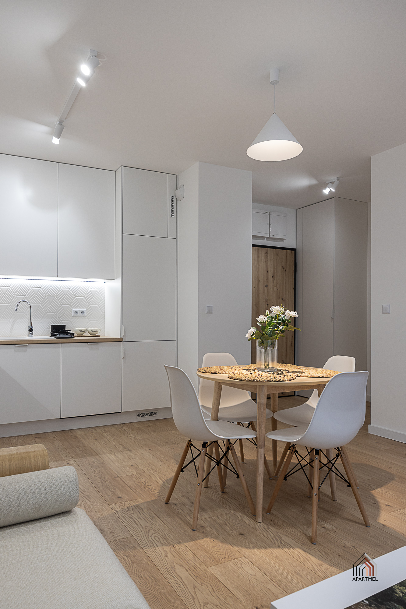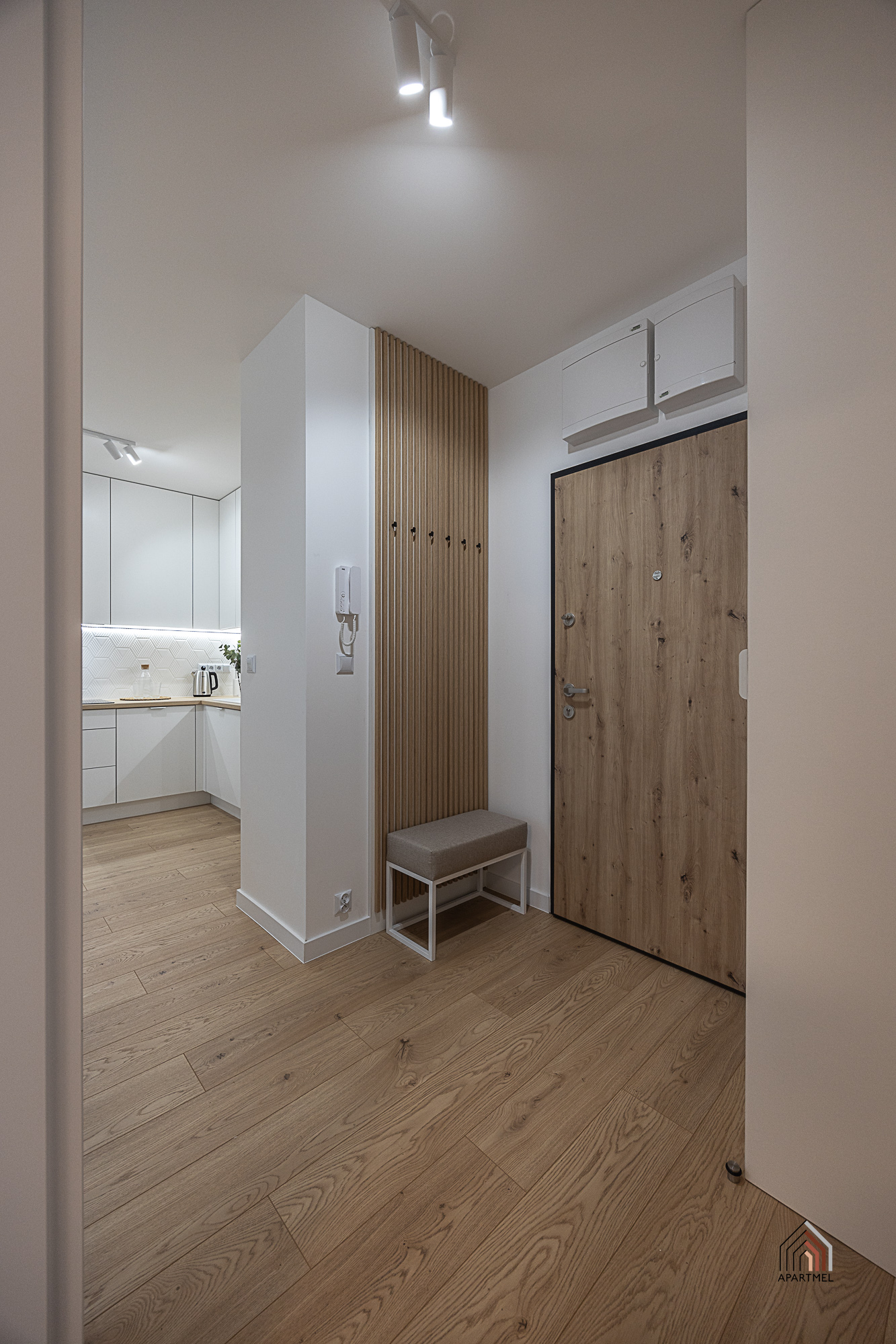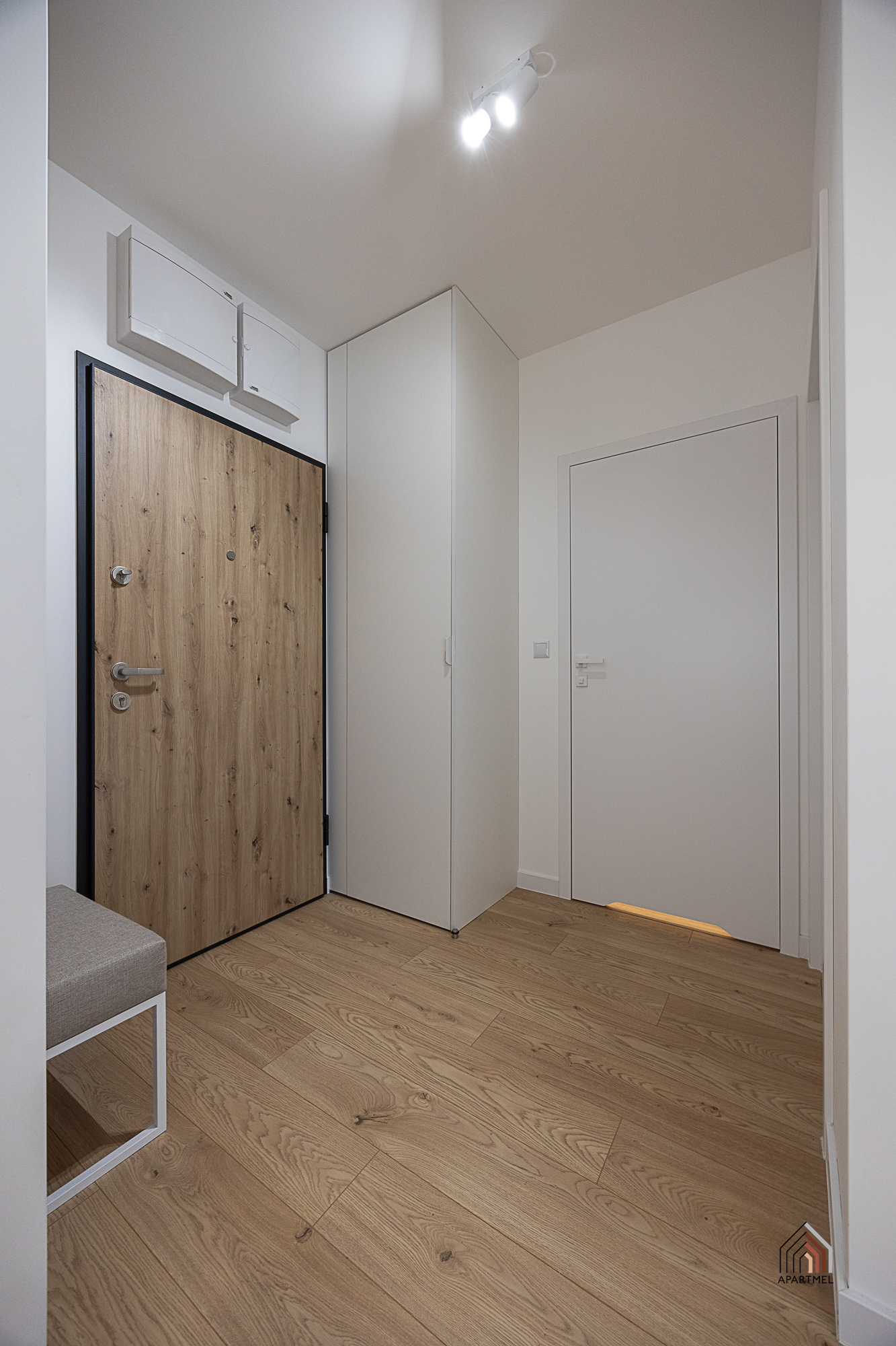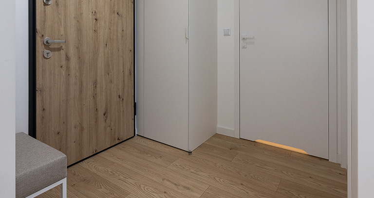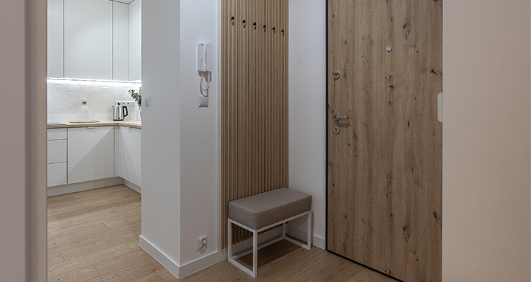 Strefa wejściowa z zabudowaną szafą ubraniową z wieszakami oraz gospodarczą wyposażona jest w odkurzacz, rozkładaną suszarkę, deskę do prasowania, żelazko oraz mop. Dodatkowo ławeczka, podręczny wieszak oraz duże lustro.