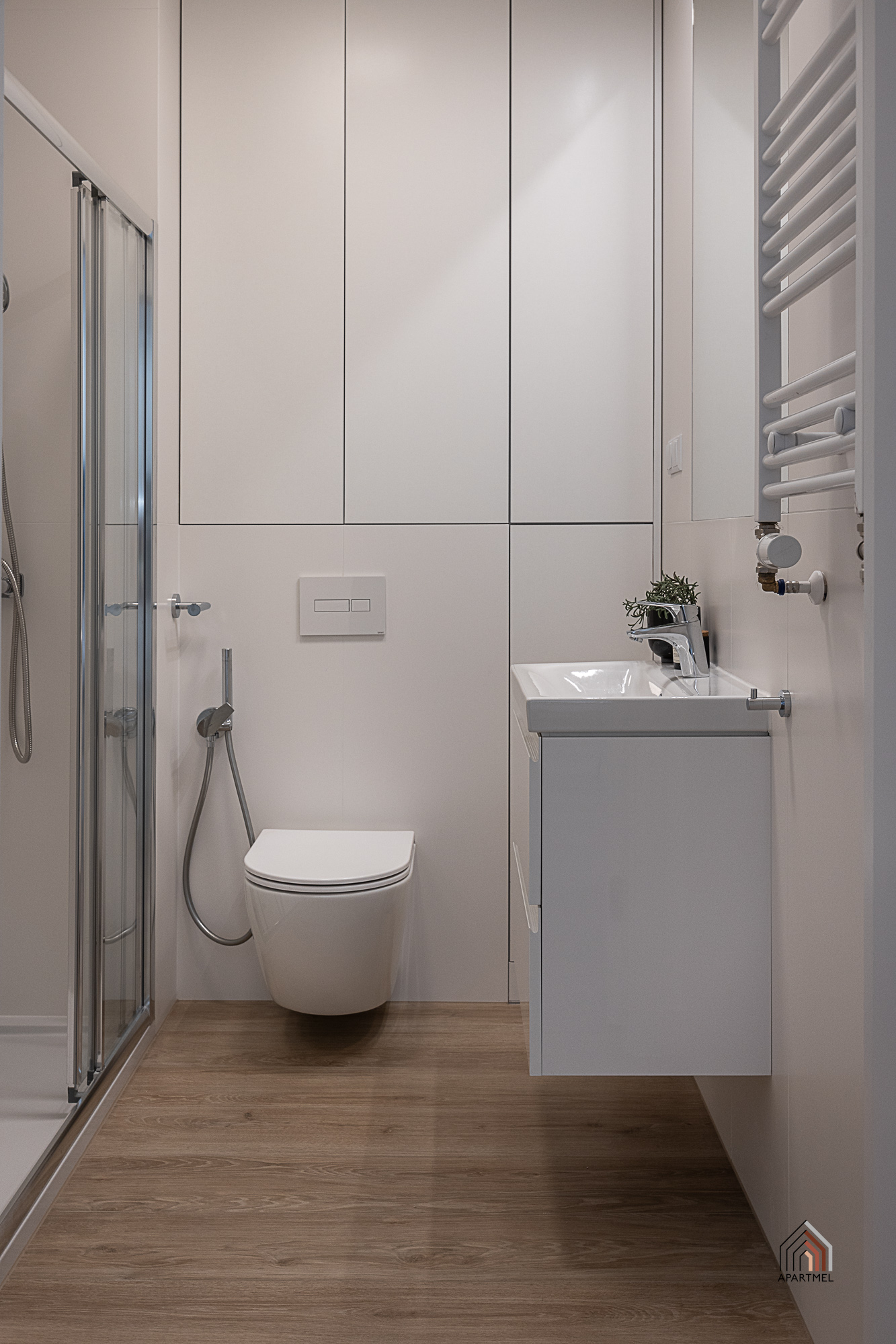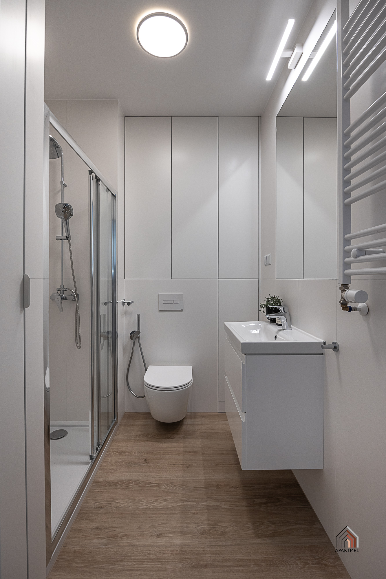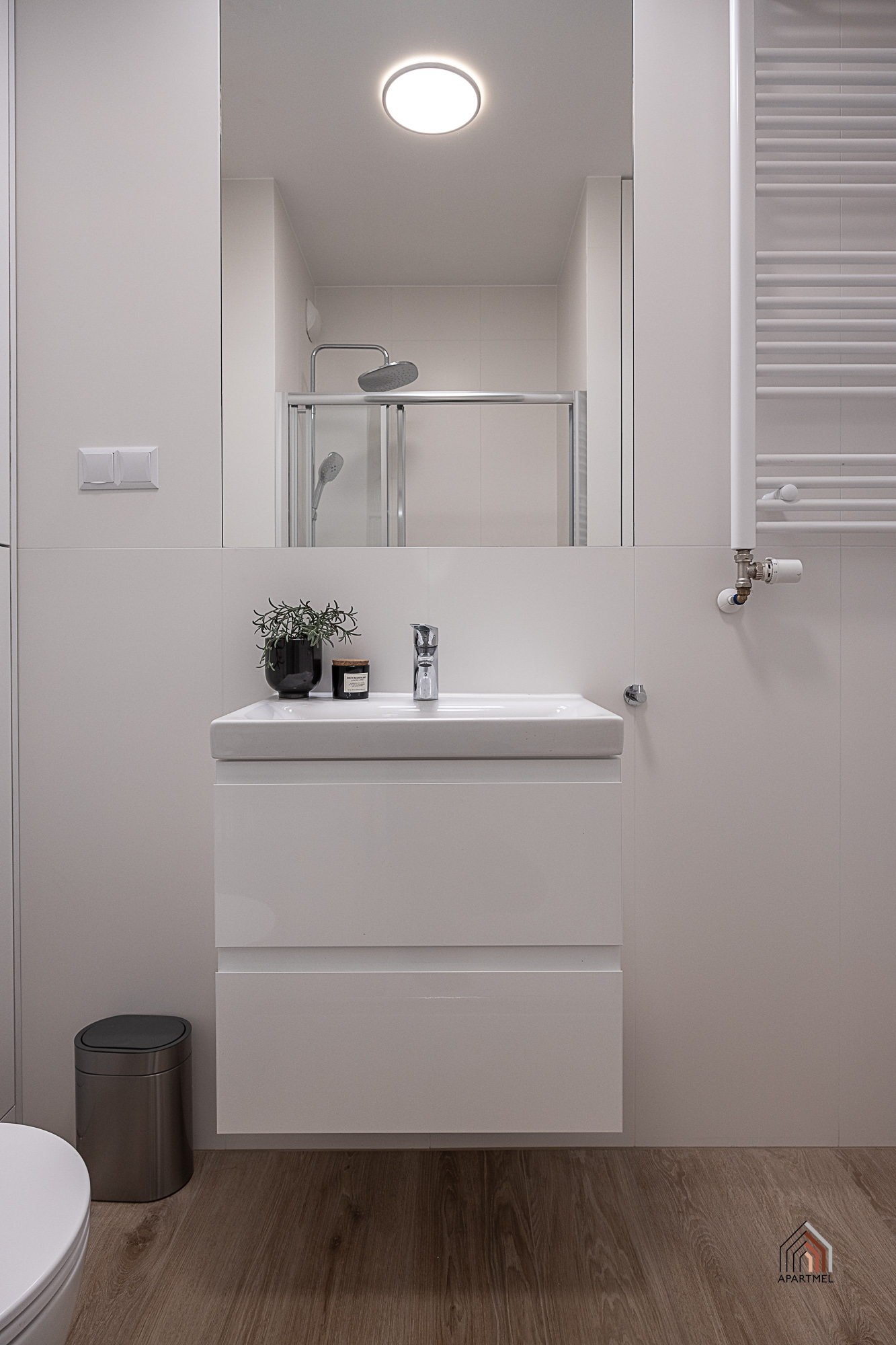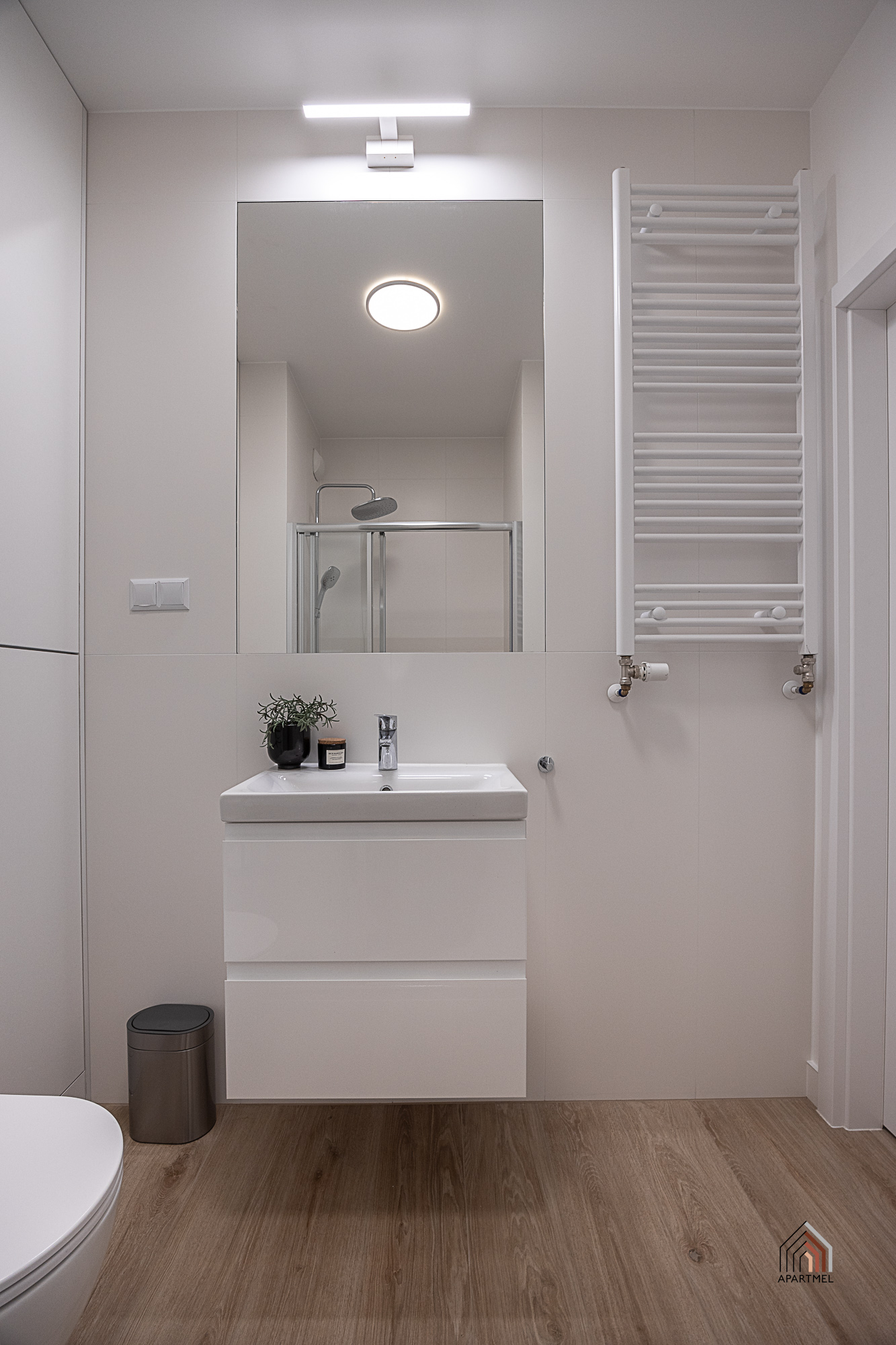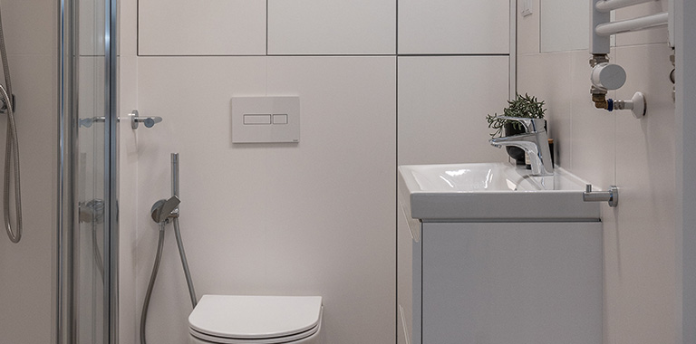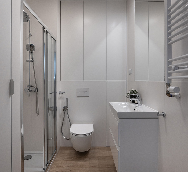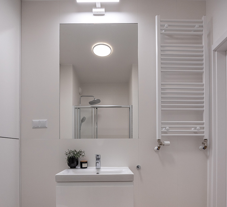 Łazienka jest elegancka, jasna, ze stylową armaturą i ceramiką dobrej jakości. Posiada obszerny prysznic z niskim brodzikiem i deszczownicą oraz półką na kosmetyki, dużą umywalkę na szafce, pralkę Electrolux, miskę ustępową wiszącą z baterią bidetową w jej sąsiedztwie, szafkę wiszącą, lustro oraz lampy, a także wieszaki na ręczniki, uchwyt na papier toaletowy, kosz na śmieci, szczotkę do wc.