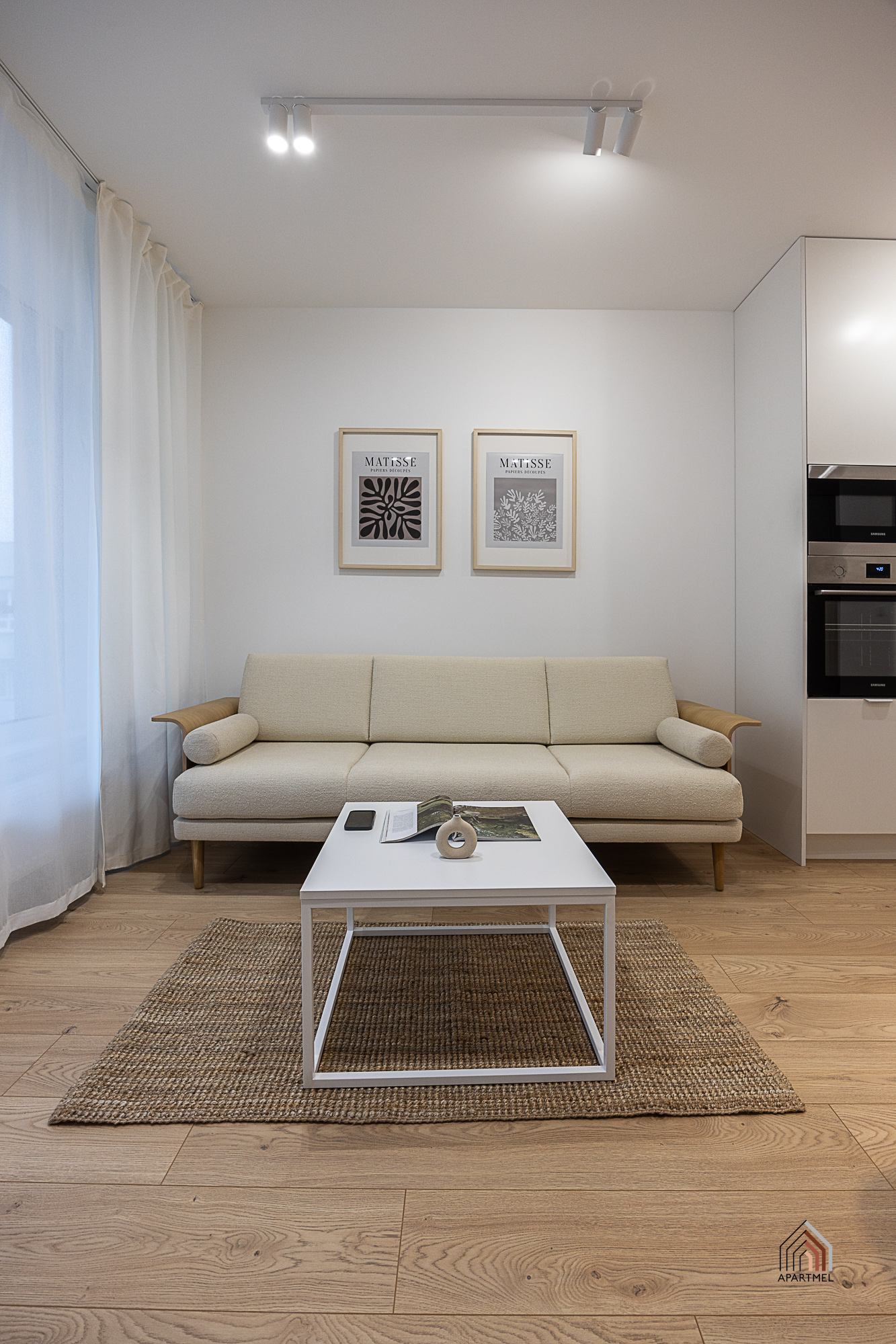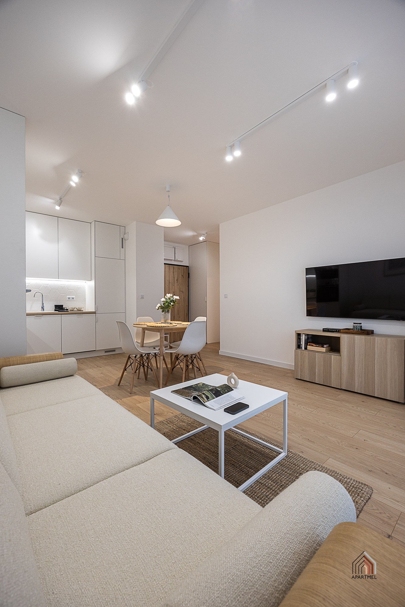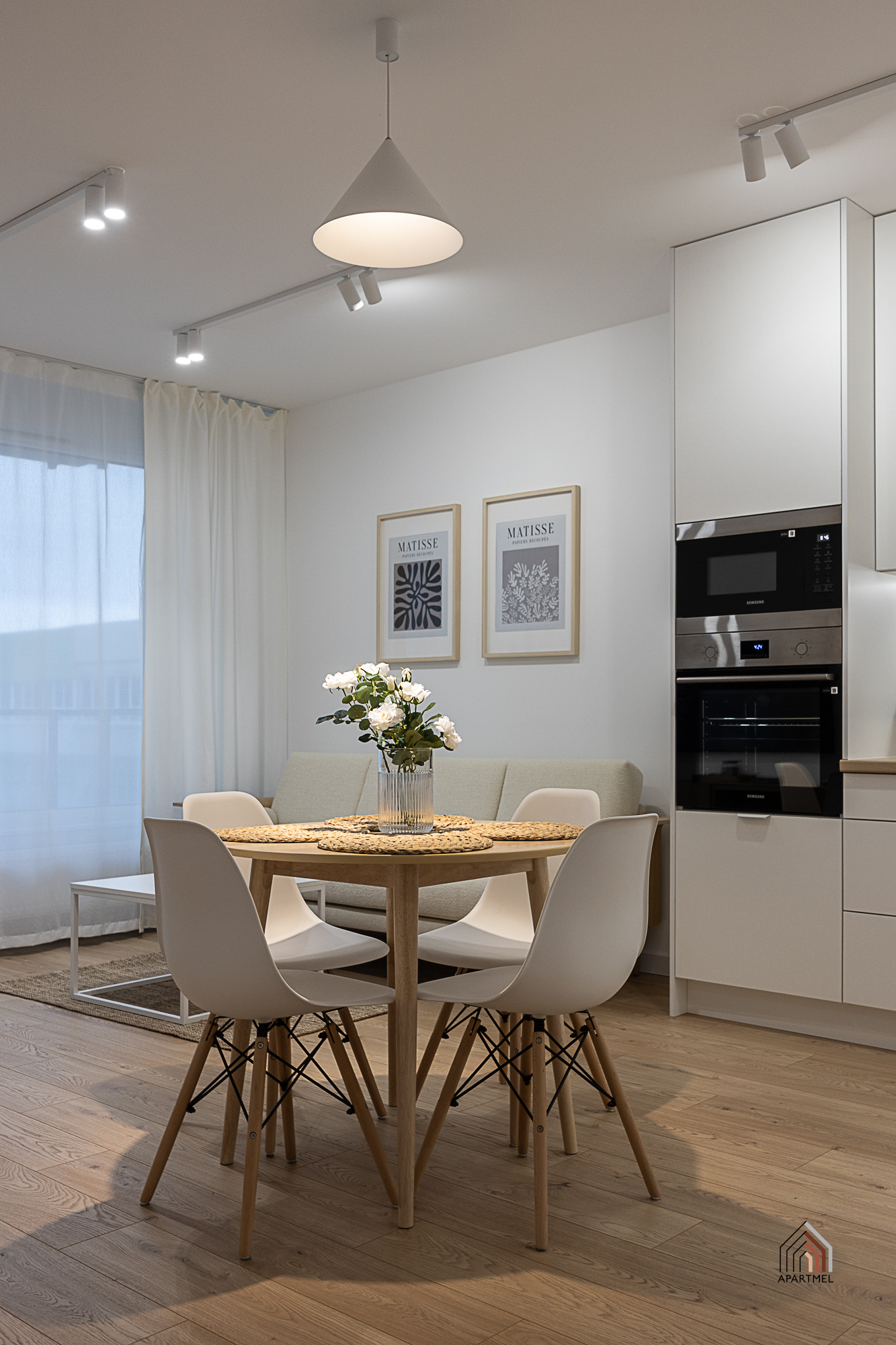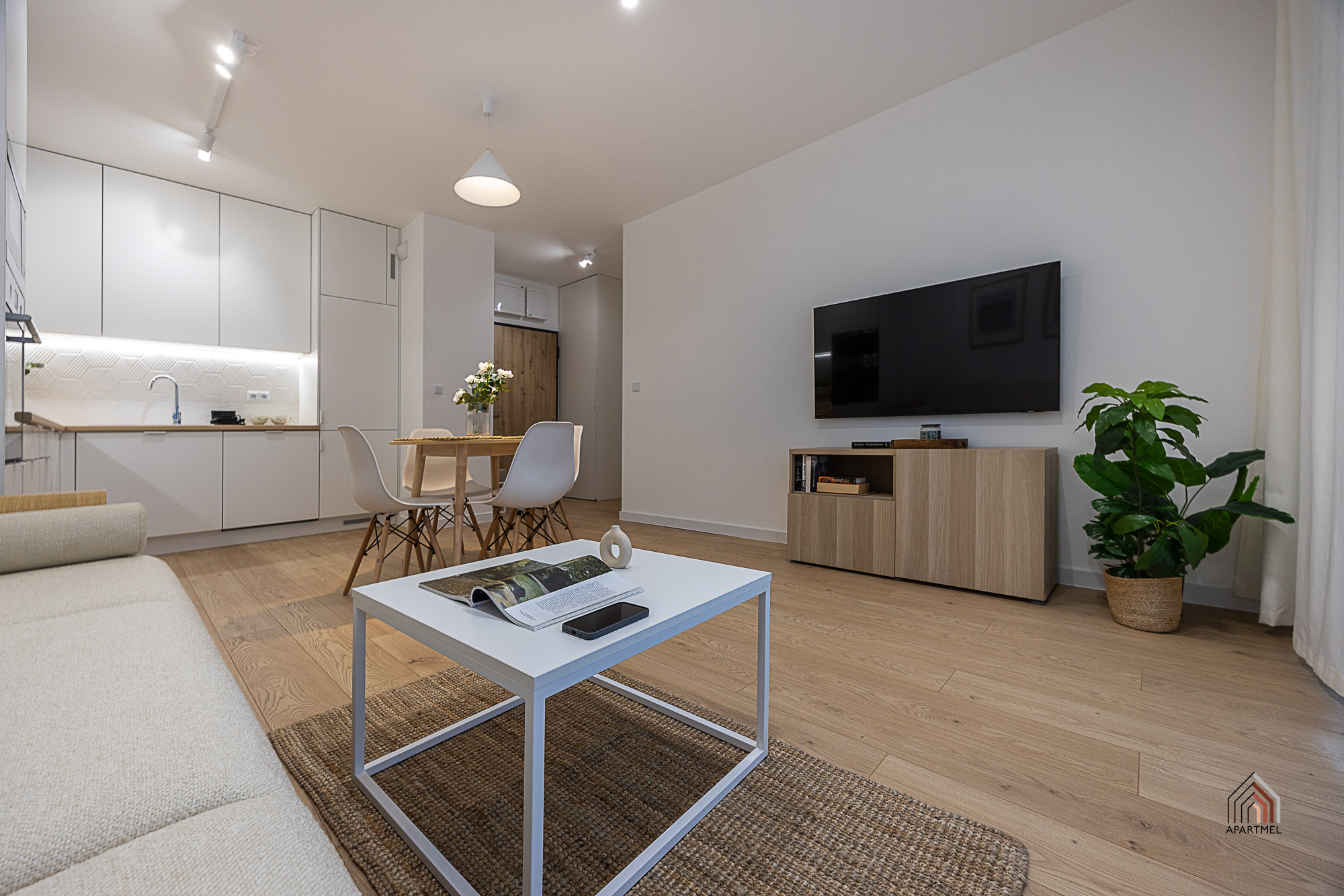 W salonie znajduje się rozkładana kanapa narożna, fotel, komoda z witryną szklaną, podwójny stolik kawowy, szafka RTV i podwieszany telewizor telewizor 55" Samsung 4K Smart TV, duży stół i 4 krzesła. W bardzo przestronnych oknach delikatne firanki i zaciemniające zasłony.