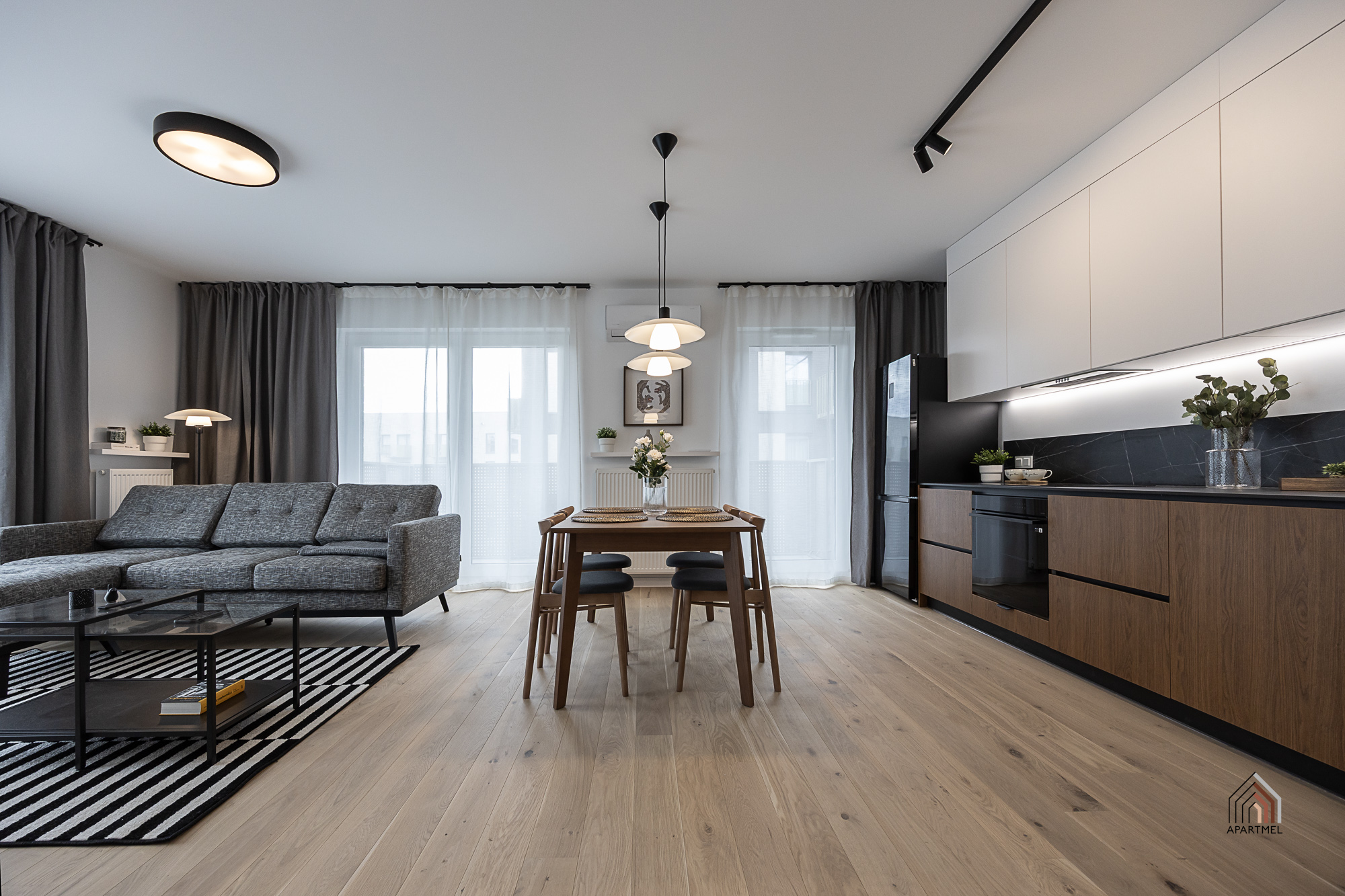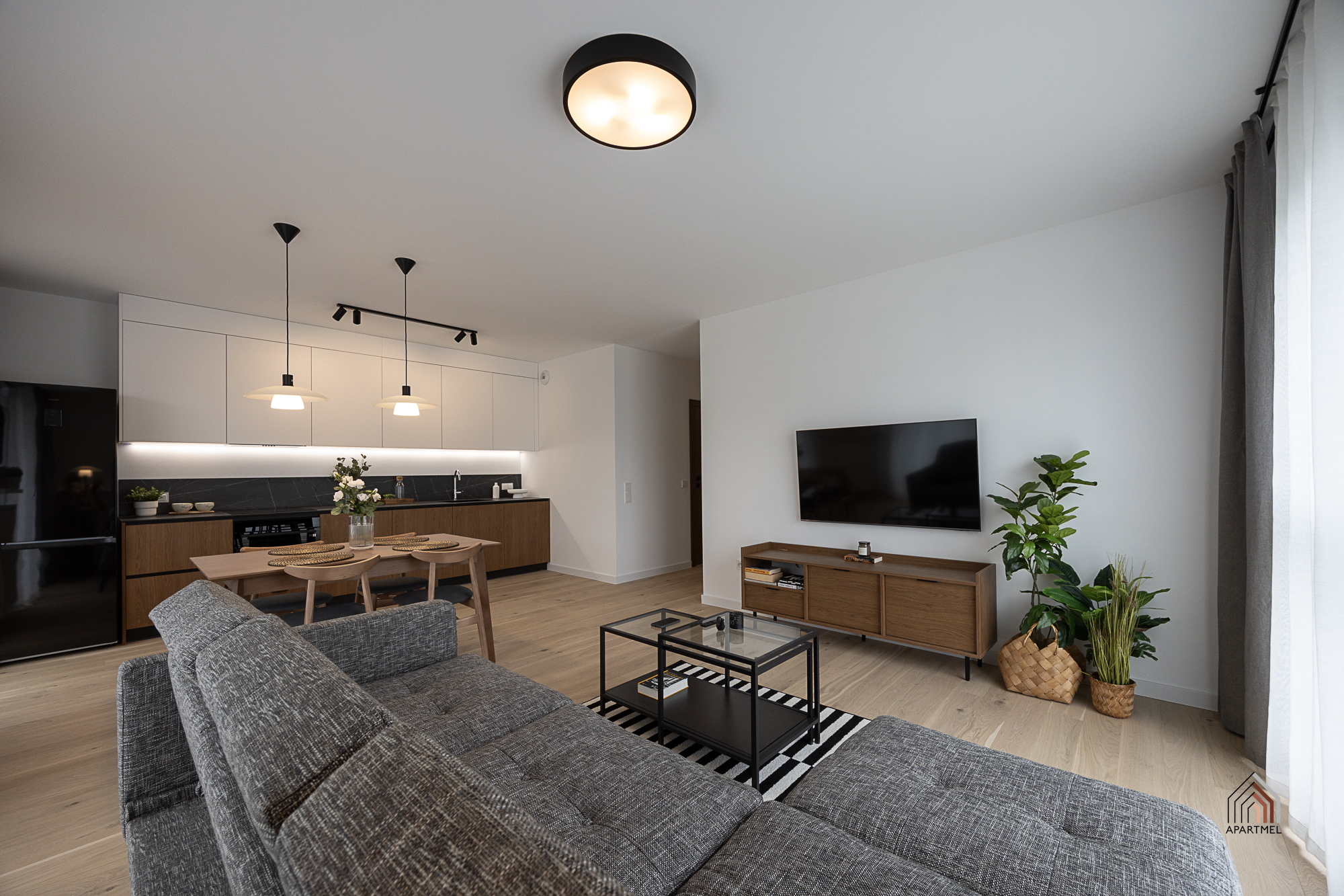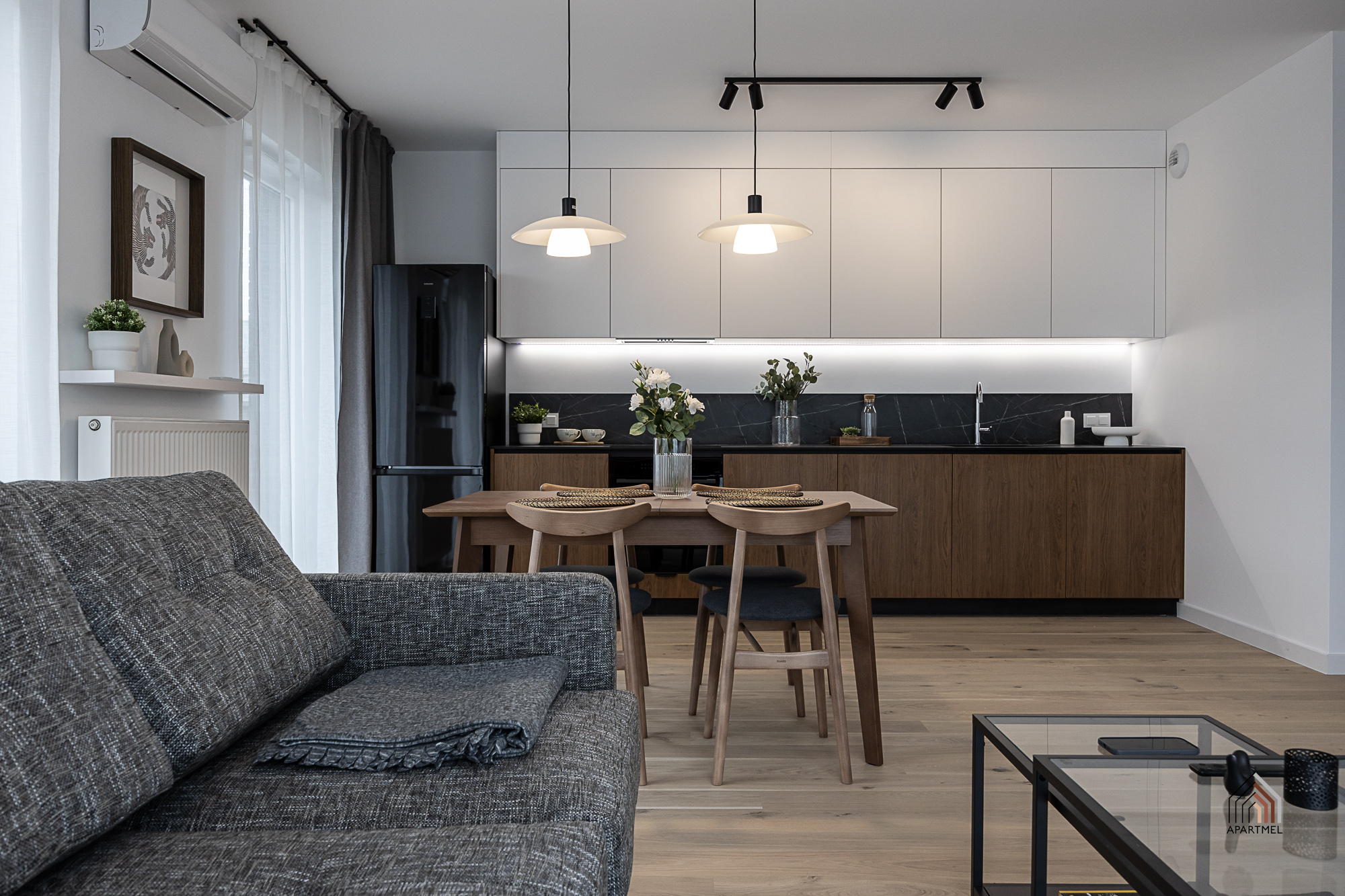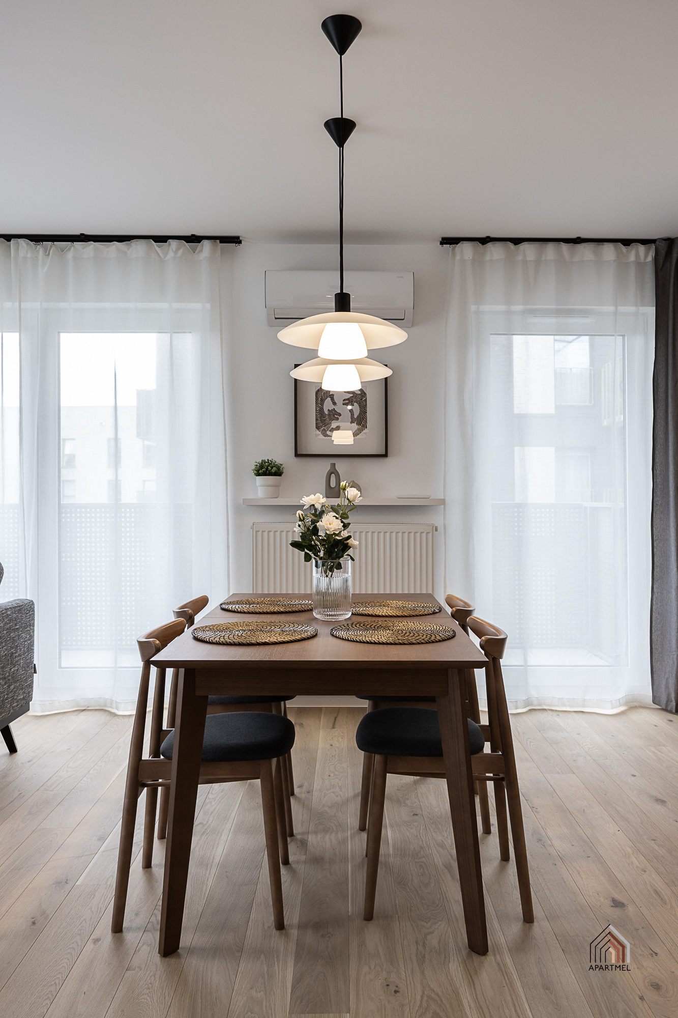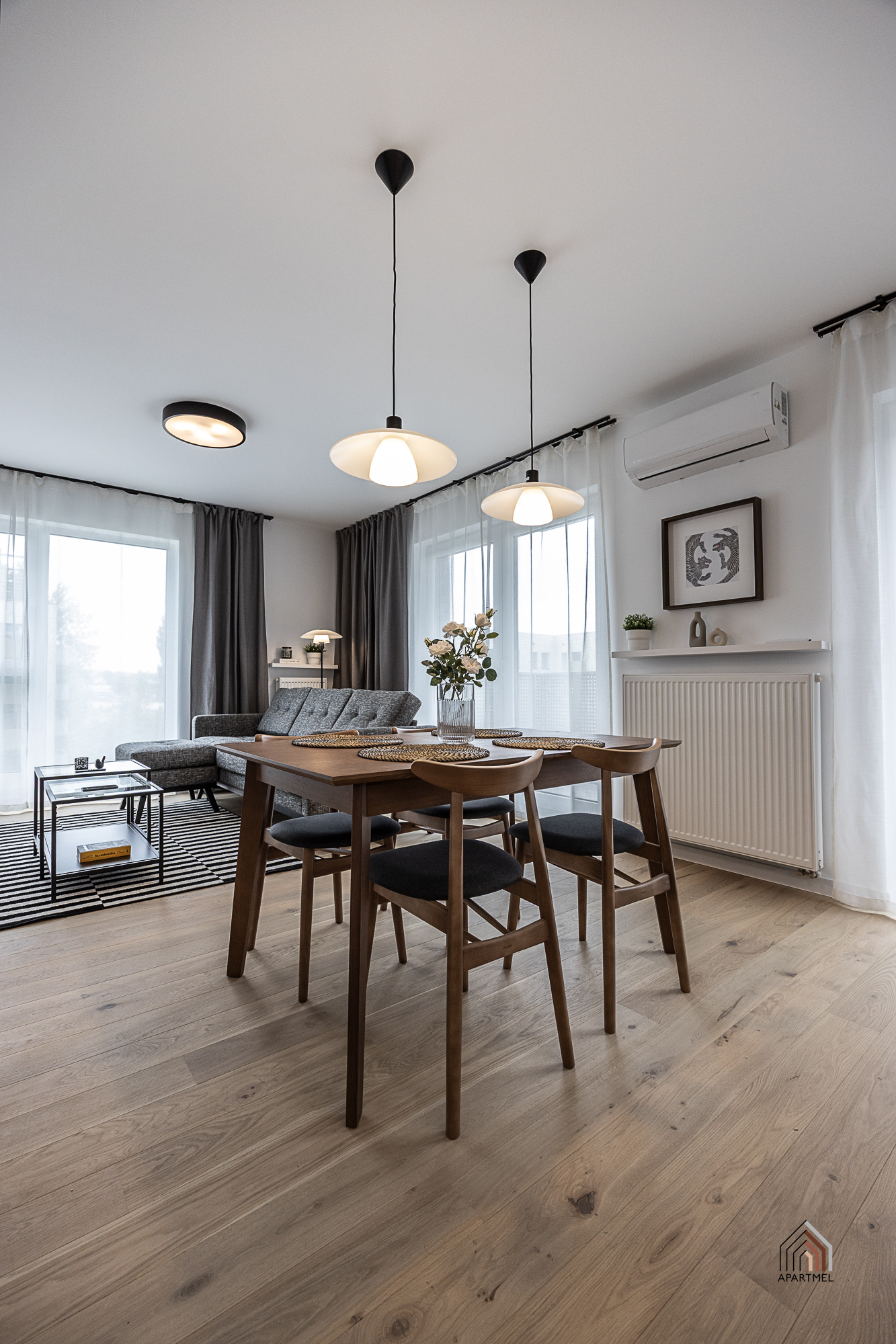 Przestronny, przytulny salon połączony jest z otwartą kuchnią, co daje więcej przestrzeni i światła. W pokoju znajduje się wygodna, rozkładana do spania kanapa narożna, duża komoda RTV, telewizor 55" Samsung 4K Smart TV, stolik kawowy 2 w 1, dywan, zasłony, stół oraz 4 krzesła. Na suficie znajduje się designerskie oświetlenie, a w oknach zasłony i delikatne firanki.