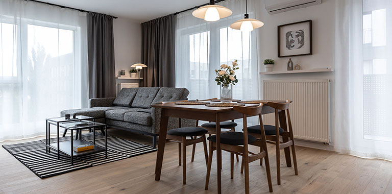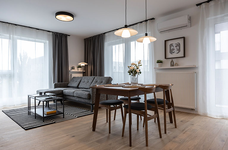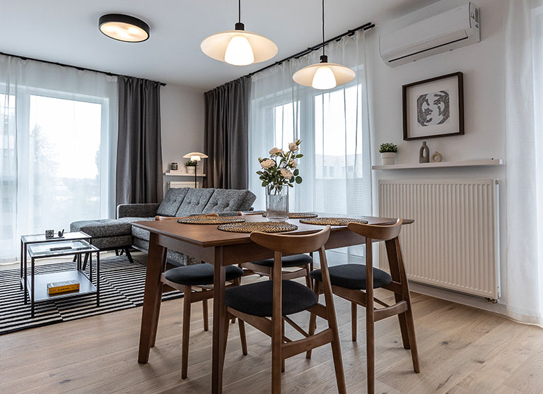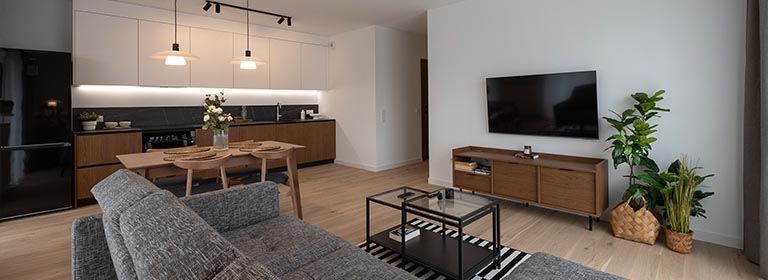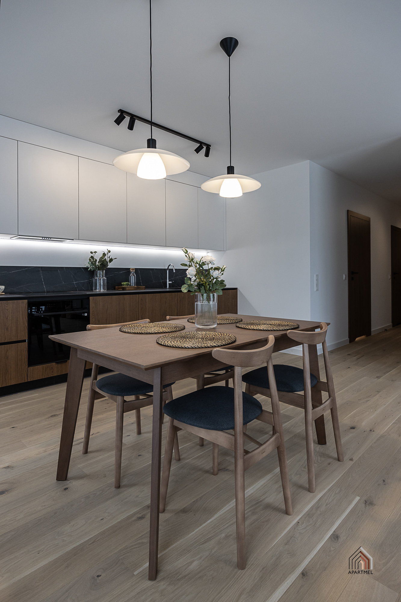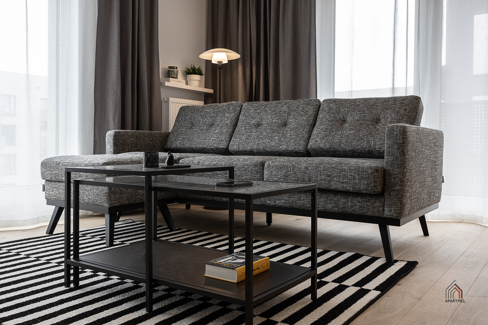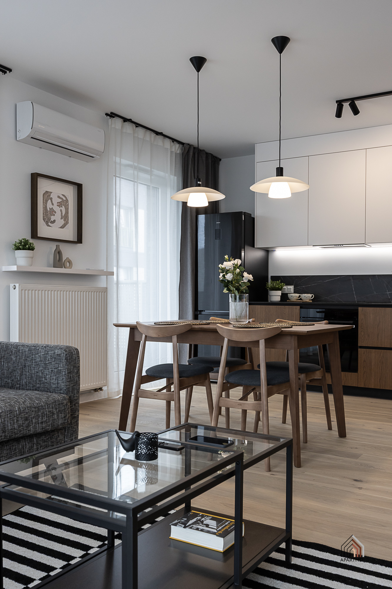 Przestronny, przytulny salon połączony jest z otwartą kuchnią, co daje więcej przestrzeni i światła. W pokoju znajduje się wygodna, rozkładana do spania kanapa narożna, duża komoda RTV, telewizor 55" Samsung 4K Smart TV, stolik kawowy 2 w 1, dywan, zasłony, stół oraz 4 krzesła. Na suficie znajduje się designerskie oświetlenie, a w oknach zasłony i delikatne firanki.