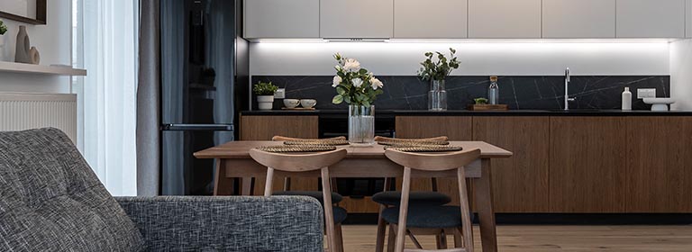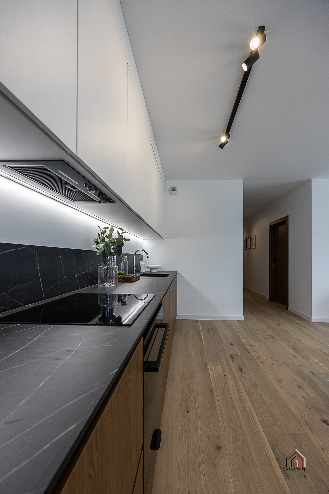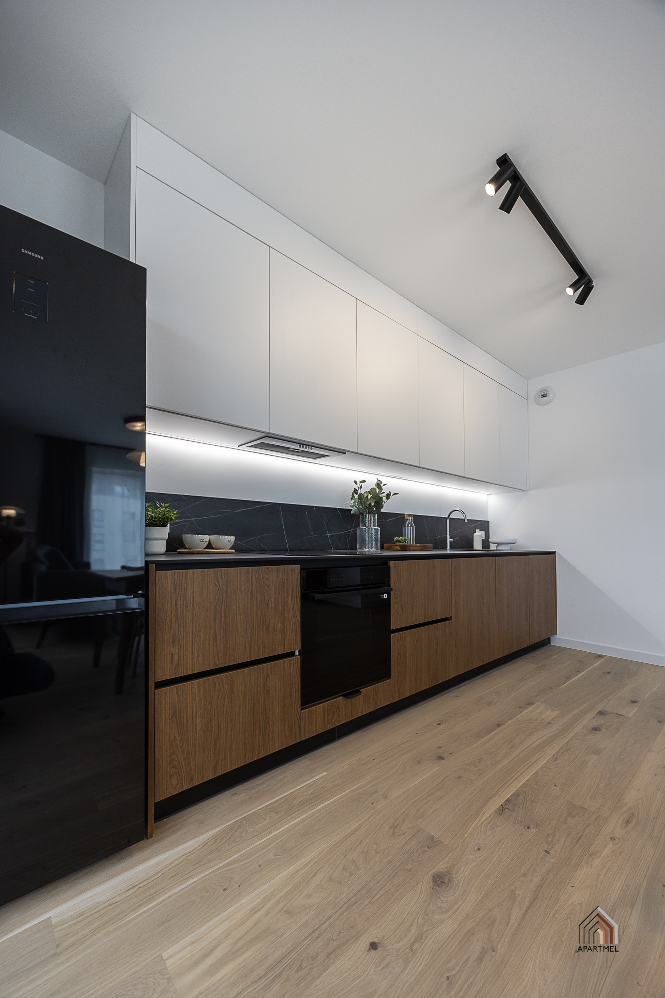 Nowoczesna kuchnia w wysokiej, modułowej zabudowie tworzy wraz z salonem atrakcyjną wizualnie przestrzeń. Jest tu wszystko, co niezbędne: sprzęt AGD marki Samsung tj. duża lodówko-zamrażarka, zabudowany piekarnik, płyta indukcyjna, kuchenka mikrofalowa, okap i zmywarka. Dodatkowo zlew konglomeratowy z dużą komorą i ociekaczem, kosze na śmieci z segregacją, czajnik elektryczny Phipilps, szuflady, cargo, praktyczne listwy LED.