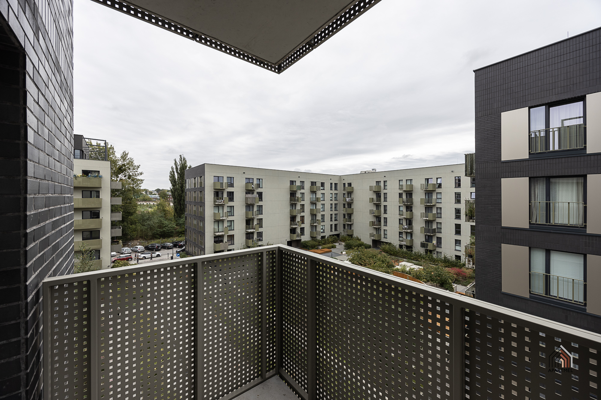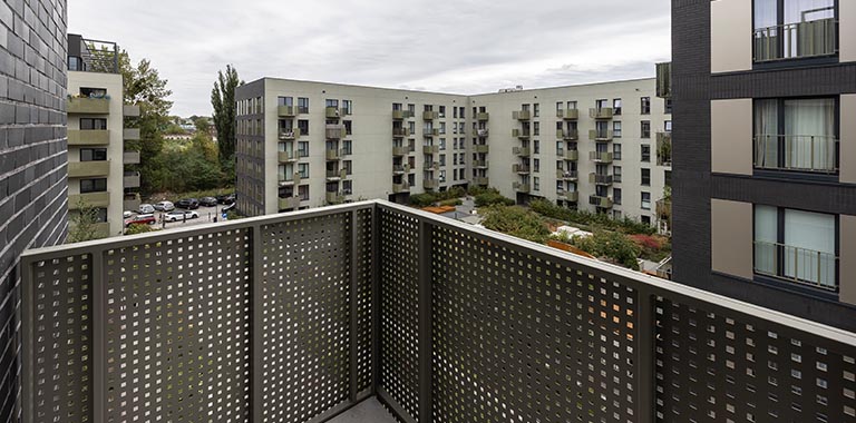 Balkon z widokiem na patio. Powierzchnia - ponad 7 m2, na ścianach tynk strukturalny, barierka metalowa.