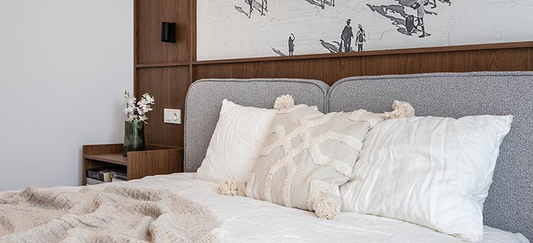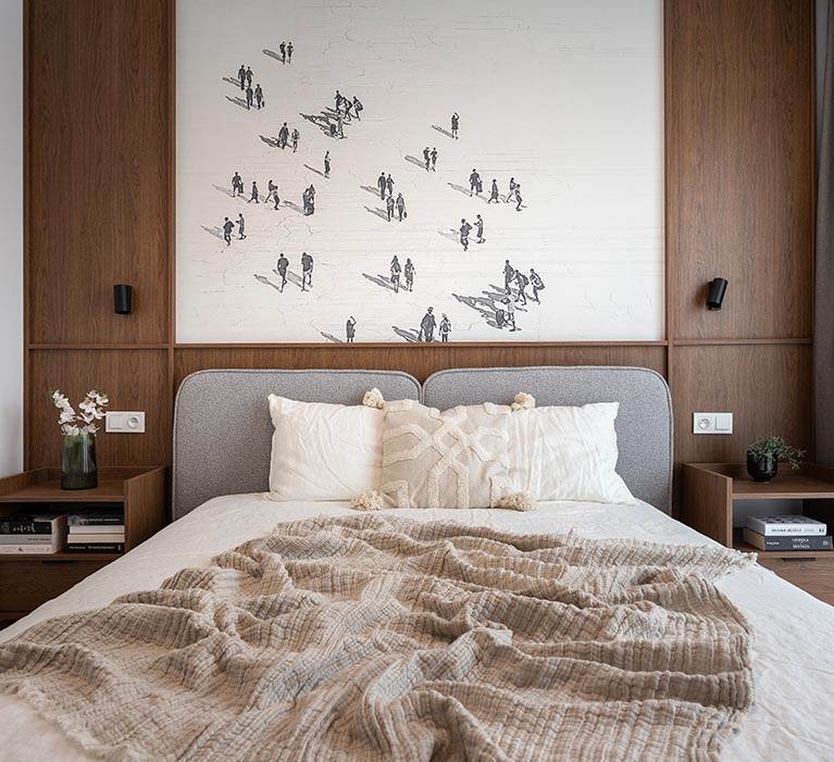 W sypialni znajduje się duże, kontynentalne łóżko z modnym zagłówkiem i obszernym pojemnikiem na pościel. Na wyposażeniu jest szafa z wieszakami i półkami, biurko z szufladami, krzesło, półka, gniazdka, szafki nocne i kinkiety po obu stronach łóżka, w oknie delikatne firanki i zasłony.