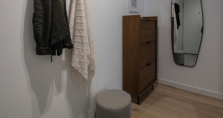 W eleganckim holu znajduje się m.in. duża szafa z modułem gospodarczym - z odkurzaczem Electrolux, rozkładaną suszarką, deską do prasowania, żelazkiem Philips oraz mopem. Lustro, wieszak podręczny przy wejściu, pufa i komoda. Na podłogach położone są dobrej jakości panele o podwyższonej odporności na wilgoć oraz płytki ceramiczne.