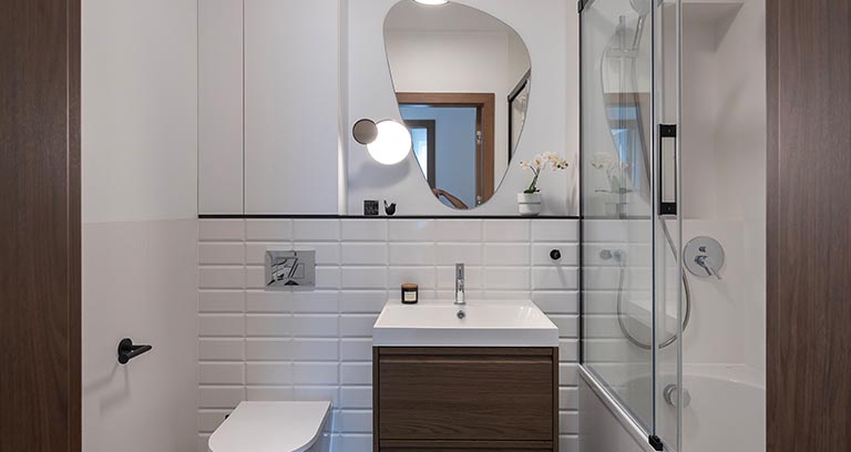 Praktyczna i wygodna łazienka posiada zabudowę ścienną z miejscem do przechowywania. Na wyposażeniu znajdują się: wanna z prysznicem i z deszczownicą, umywalka na szafce z głębokimi szufladami, pralka i suszarka Electrolux, miska ustępowa, uchwyt na papier toaletowy, szczotka do wc i kosz na śmieci.
