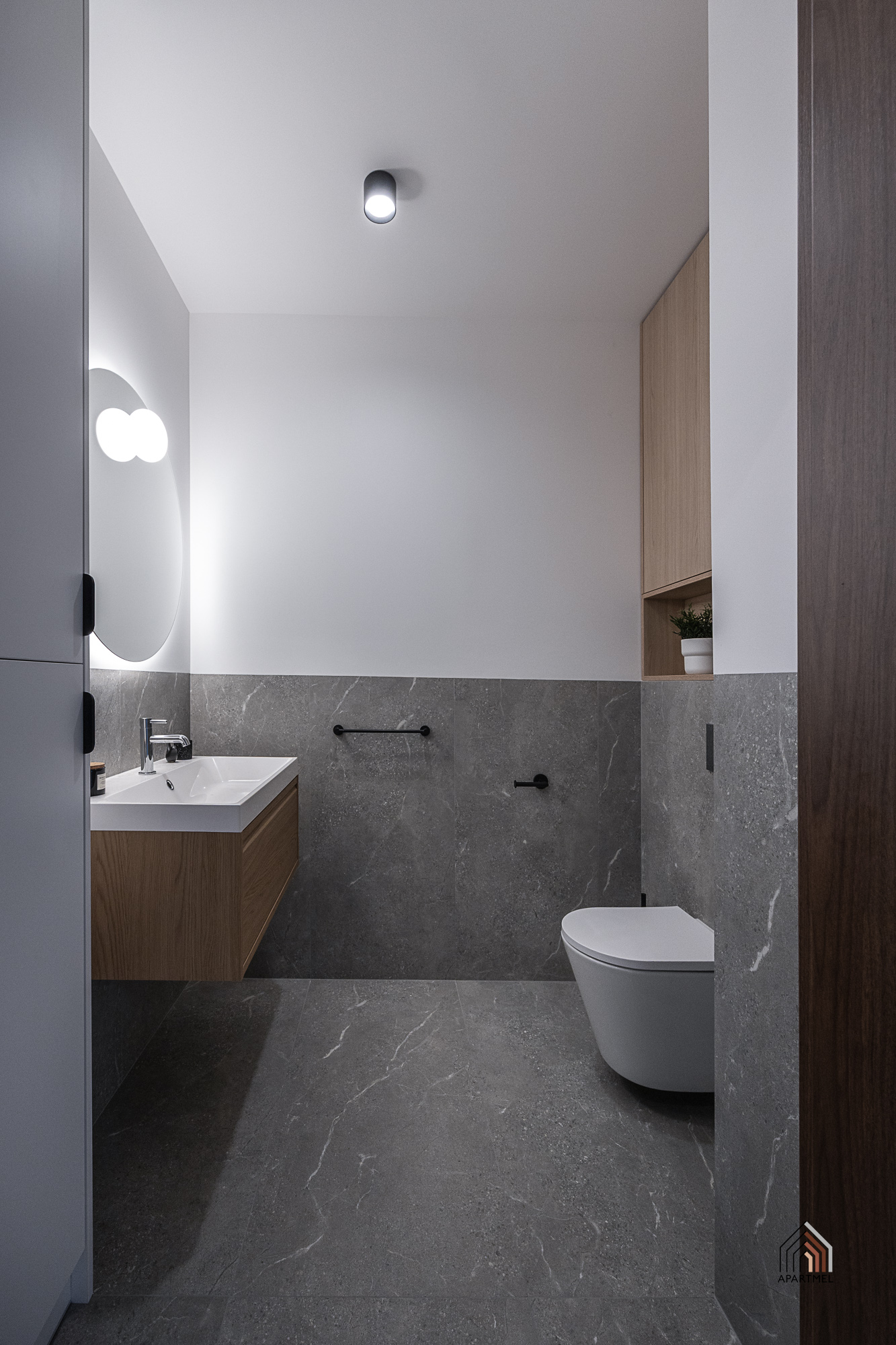 Osobne wc z umywalką i pojemnymi szafkami w eleganckiej zabudowie.