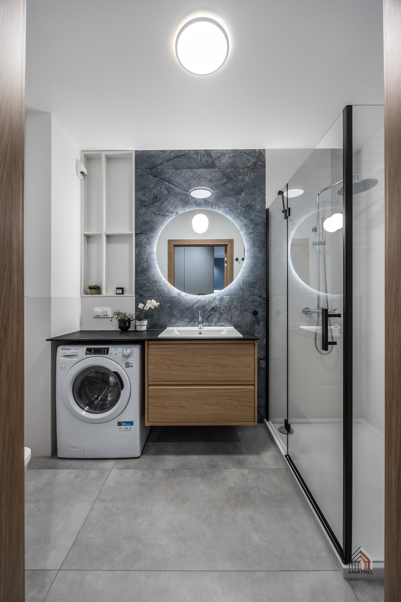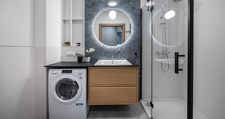 Łazienka – wanna z prysznicem typu deszczownica, wc, szafka z umywalką, pralka, zabudowa szafkowa.