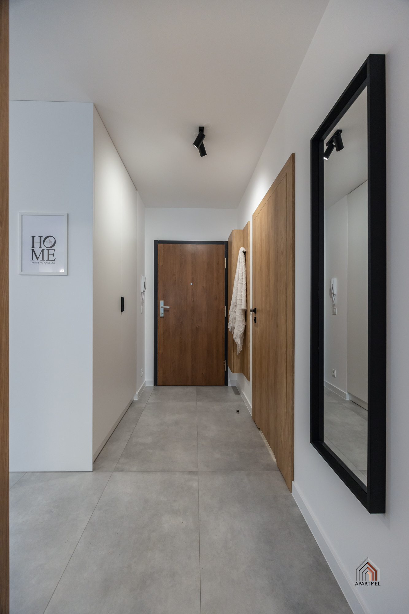 Strefa wejściowa z szafą ubraniową z wieszakami oraz gospodarczą, wyposażoną w odkurzacz, rozkładaną suszarkę, deskę do prasowania, żelazko oraz mop. Na podłogach położone są dobrej jakości płytki ceramiczne.