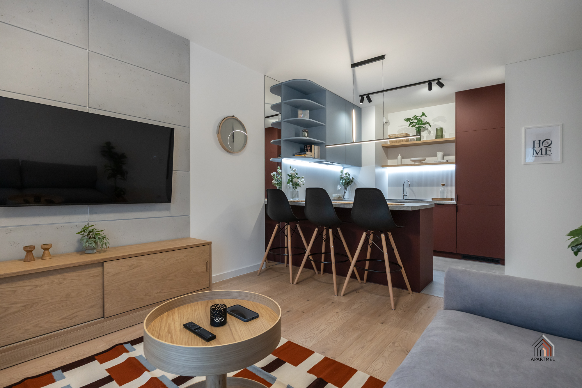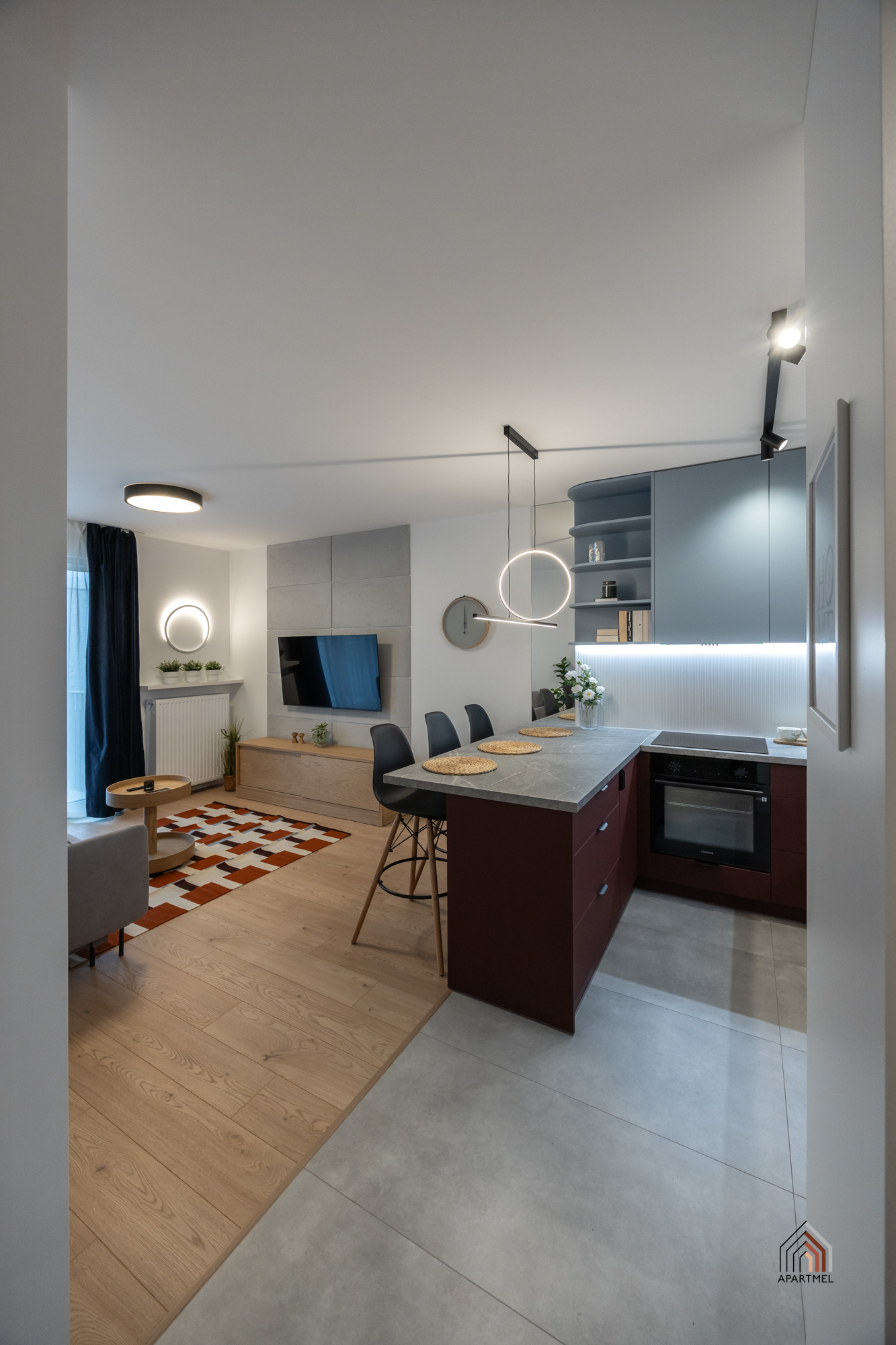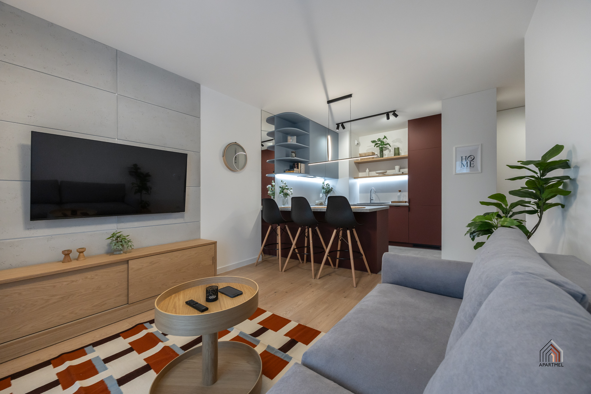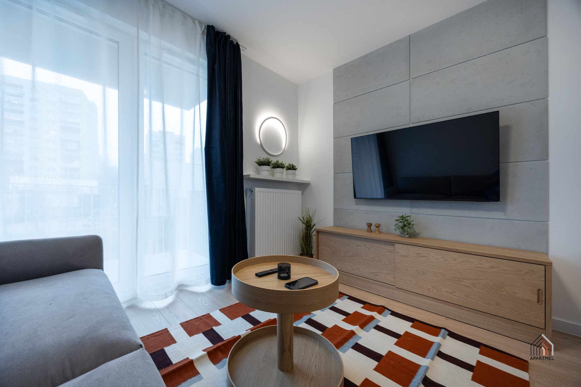 W salonie znajduje się rozkładana sofa narożna, stolik kawowy, szafka RTV i podwieszany telewizor 55" Samsung 4K Smart TV, stół i 4 krzesła. W dużych oknach balkonowych delikatne firanki i lekkie zasłony.