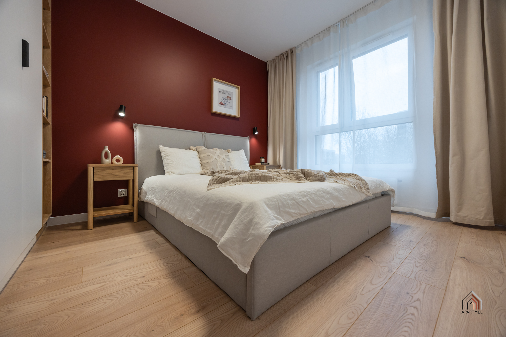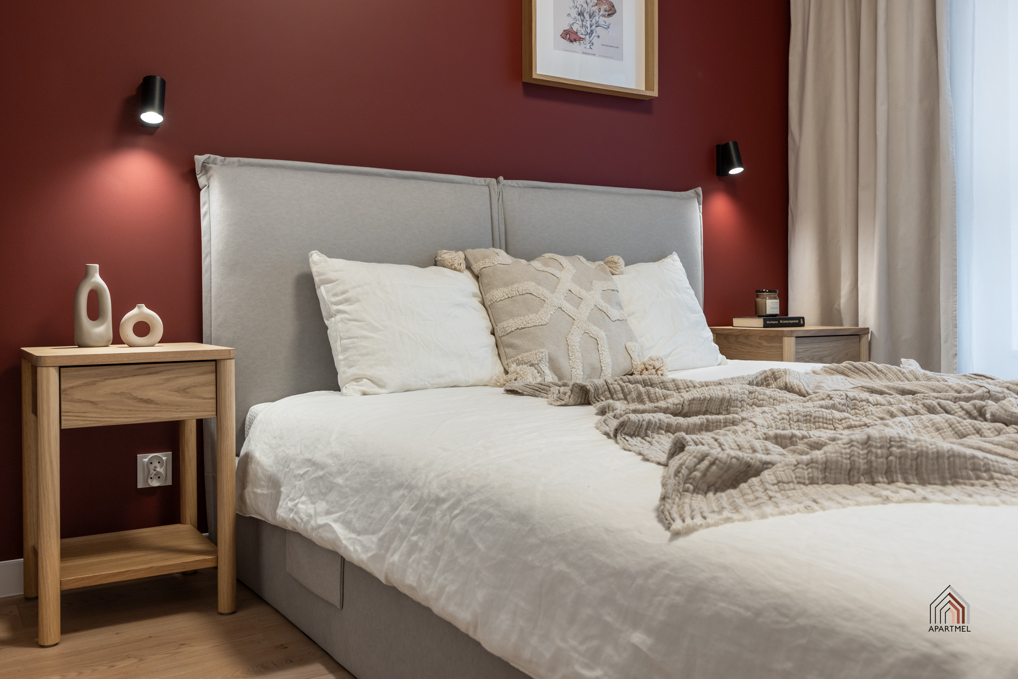 Sypialnia w stylu boho posiada wygodne łóżko kontynentalne z zagłówkiem i dużą skrzynią na pościel, a także wsad pościelowy tj. kołdra i dwie poduszki, bardzo pojemną szafę z regałem, biurko z krzesłem. Obok łóżka szafki nocne, lampki oraz gniazdka, w oknach firanki i zasłony.